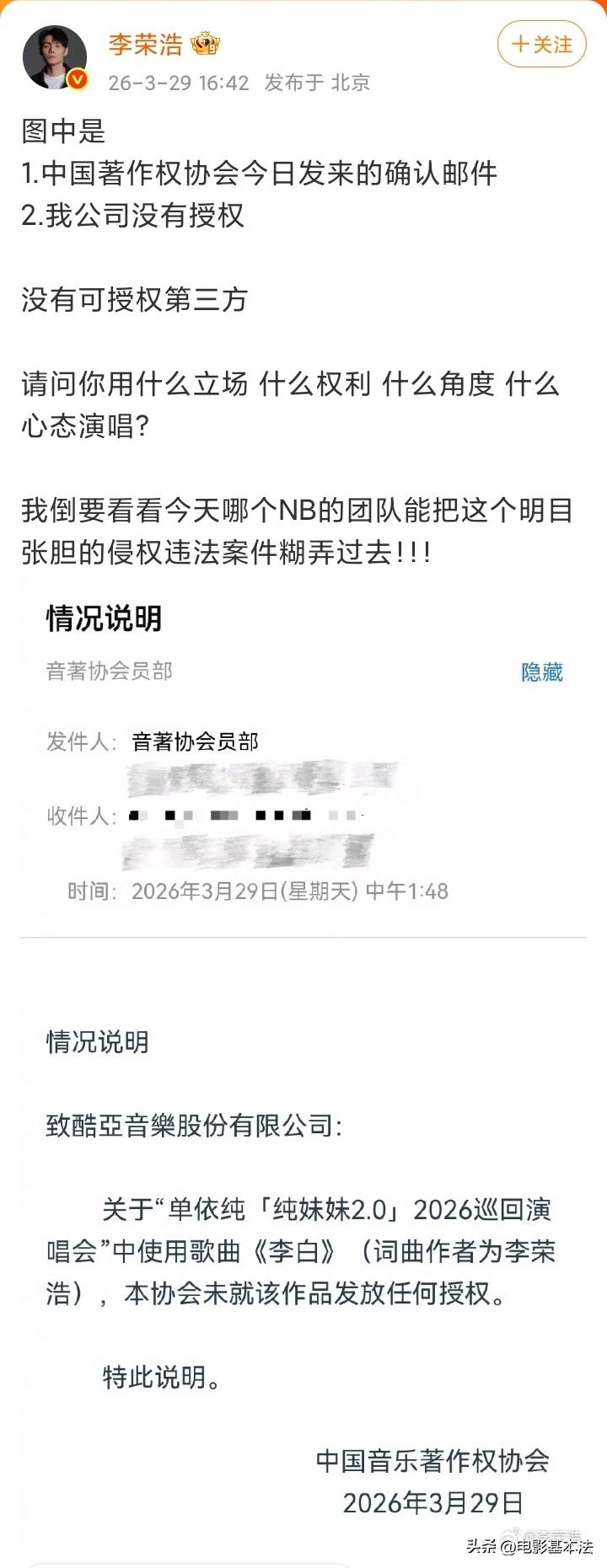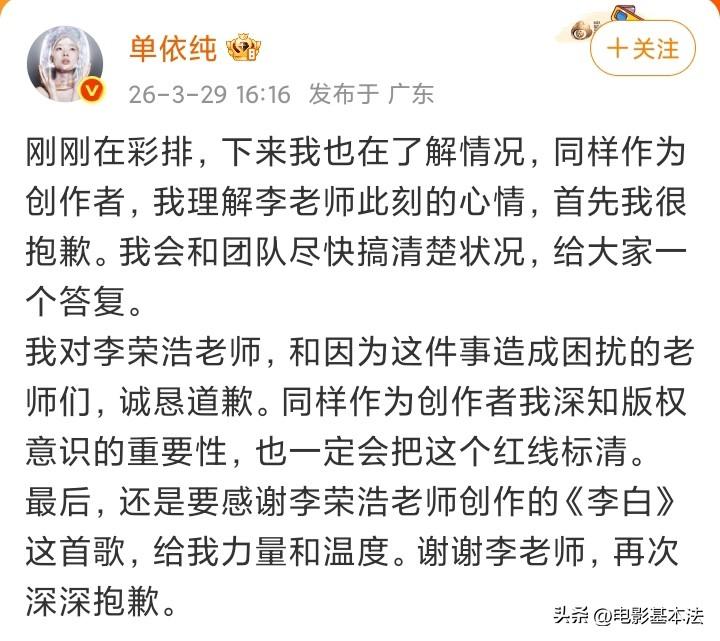 “我会和团队尽快搞清楚状况”,单依纯道歉文的词汇让人感觉更像是狡辩和甩锅,也难怪李荣浩不接受单依纯的道歉。 这件事很明显,确实是侵权了,因为版权在李荣浩那里,李荣浩已经通过中国著作权协会确认了这个事实,这让人怀疑单依纯团队的专业度以及口碑,如果不是故意侵权,那就是不专业,如果是,那这个团队毫无信誉,两者必居其一。 在侵权事实成立的前提下,单依纯方面的道歉确实没让人感觉到多少诚意,另外,即使道歉很有诚意,李荣浩也不是一定必须谅解,因为违法没有原谅的义务。