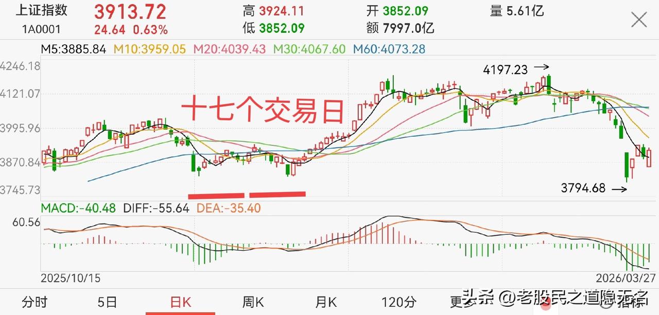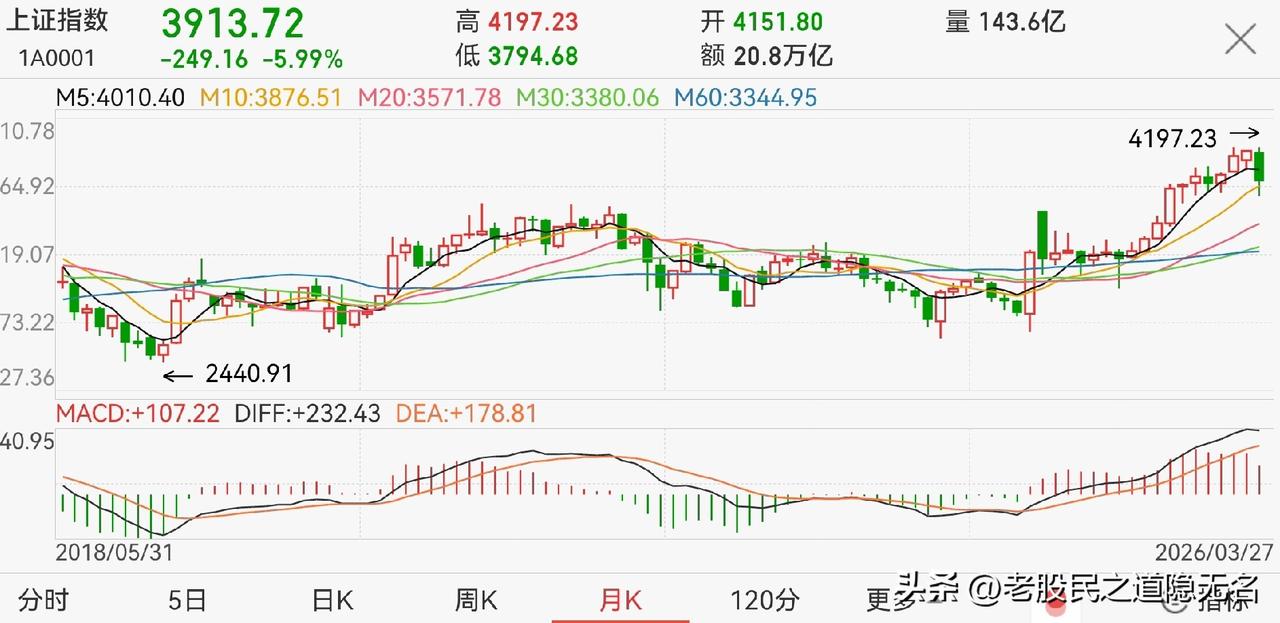 四月的股市该怎么看? 会调整多久?还会有新低吗? 先看下面几幅K线图: 1,下图1。 这是2021年春节后的走势,也是老股民老早就提到过的“小心”复制这种走势,结果很不幸,到如今翻版程度达80%,都是小幅新高后、春节后开始调整,且调整幅度也非常相近。 那么,2021年这波调整两个月左右,而这一波,从“伊朗那边”的情况来看,大差不差。 2,下图2。 这是2021年七月底过后的走势,这是比较强的走势,可以参考,但个人认为这一波可能没那么强,因为大环境不允许。 3,下图3。 这是去年4.7日后的走势,因为突发事件,一步到位。 当时大家对贸易战非常悲观,所以调整幅度稍大,导致市场反而在过后相对强一些,然后在6.23日事件平息后以三阳开泰走出牛市。 4,下图4。 这是去年11月的那一波调整,时间稍短,但创了新低(1个点)。 5,下图5。 周线上倒与去年“4.7日”比较相似。 6,下图6。 月线上看,与19年~2021年的走势吻合度也非常高,这也是老股民元旦~春节一直“担心”的问题,现阶段看更为“担心”。[捂脸][捂脸] 总结: 个人认为,图1最值得参考,图3也可以。 时间上1~2个月,主要看伊朗那边何时结束; 空间上,同样图1最值得参考,至于新低,可能性极低。 所以,整个四月,大概率就是低位(3800~4000点)震荡,这也是老股民上周就持有的观点。