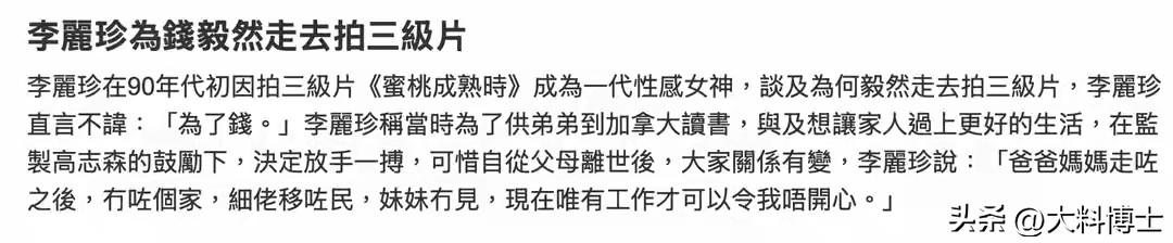 李丽珍自曝拍三级片原因,为养家、供弟留,晚年亲情全断联,值得吗? 近日,李丽珍在访谈中首度自曝拍三级片真相,一句“为了钱”道尽了当年的身不由己。 这位曾红极一时的港圈女神,看似光鲜的星途背后,藏着常人难以想象的家庭重担,让人直呼“她也是个可怜人”。 李丽珍最近参加访谈节目,说刚出道那会儿,她片酬很低,她普通家庭出身,父母都是普通职员,可她家中一共需有六口人:奶奶、父母、弟弟、妹妹还有她,经济压力如巨石压顶。 三个孩子里她最大,当初在最早的时候,她演过《开心鬼》系列,以“学生情人”形象出圈,但那会儿片酬很低很低。加上香港娱乐圈竞争压力很大,常规路数,很难大红大紫。 而当时她的弟弟,要远赴加拿大留学,巨额学费是一笔大开支,只靠父母那绝对凑不够这笔钱,为分担父母压力,她曾四处寻求出路,最终在导演高志森的鼓励下,选择突破形象接拍三级片。 1993年《蜜桃成熟时》爆火,李丽珍红了,片酬直线上升,片约不断,李丽珍有钱了,不仅顺利供完弟弟留学,也撑起了一家六口的生计,暂时缓解了家庭困境。 可这份用金钱换来的安稳,终究抵不过离别。父母离世后,原本的大家庭分崩离析,弟弟移民加拿大后与她断联,妹妹也多年未见,她直言“爸妈走了之后,就没有了家”,曾经为家人拼搏的执念,最终只剩遗憾。 李丽珍历经过两段婚姻,最终都以离婚收场,不过还好,她有女儿相依为命。 从为家人妥协的女星,到淡然生活的母亲,李丽珍的人生满是无奈,她的经历也道尽了普通人被生活裹挟的辛酸。