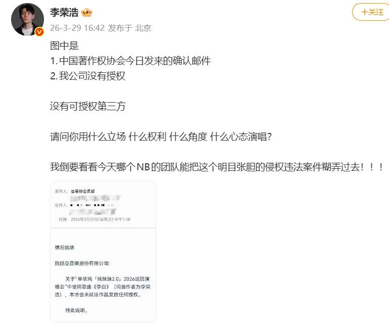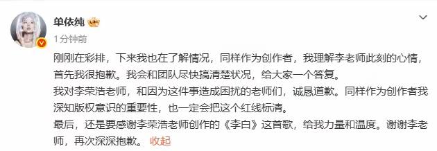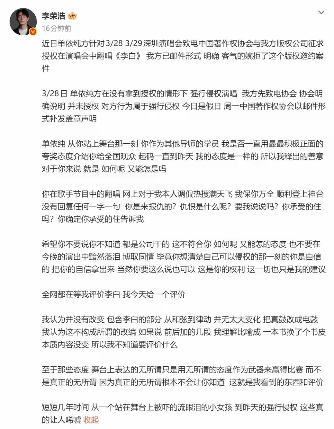 单依纯太会装了! 李荣浩都已经明确拒绝了,但是单依纯依然还是唱了李荣浩的歌《李白》! 李荣浩的文字里说,他已经以邮件的形式,明确告诉了对方,不能授权!但是单依纯依然强行演唱了! 我不相信如同单依纯不知道实情。而且她的声明里没有说一句不知道,只是说了解情况,会给一个答复。这说明什么?说明她肯定知情!她就是在装! 既然知情,最后还是唱了?为什么?她其实在赌,赌李荣浩不会怎么样,会不在意,会忍气吞声! 但是没想到李荣浩没有吃哑巴亏,而是主动站了出来,硬刚单依纯!而且从李荣浩的文字来看,他和单依纯之间早就结下了“梁子”!单依纯还有一些不为人知的“故事”!你怎么看?