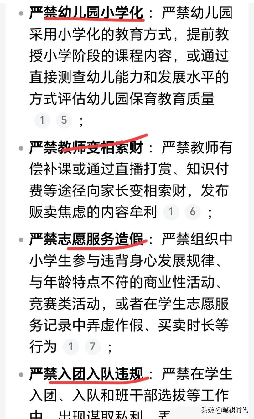 教育部深夜重磅发声!家长的焦虑终于要结束了?左一个通知,又一个文件,可谓动作不断。被指一个高中双休都搞不定,更别谈其他了! 教育部最新的20条禁令,砍向幼儿园。再让孩子背乘法口诀、学拼音等违规。 重点不是幼儿园教不教,而是小学一年级是不是零基础教学,你按规定该二个月学汉语拼音,不能变成二个星期就过,不去幼小衔接你就掉队,家长当然焦虑了。 家长担忧的是,幼儿园不学,一年级一笔带过,老师还默认靠家长教么? 其实幼儿园大班学点拼音认简单的字都可以,不然小学一年级根本就接不上。 不过这些“严禁”的出发点绝对是正确的,但各校执行的情况一定会大打折扣,特别是高中。但一个高中双休都搞不定,更别谈其他了! 有些从幼儿生开始从未停止补课,补课不禁止难以减负。 虽然每一条都想在了孩子家长的心坎上,关键是落实到位!