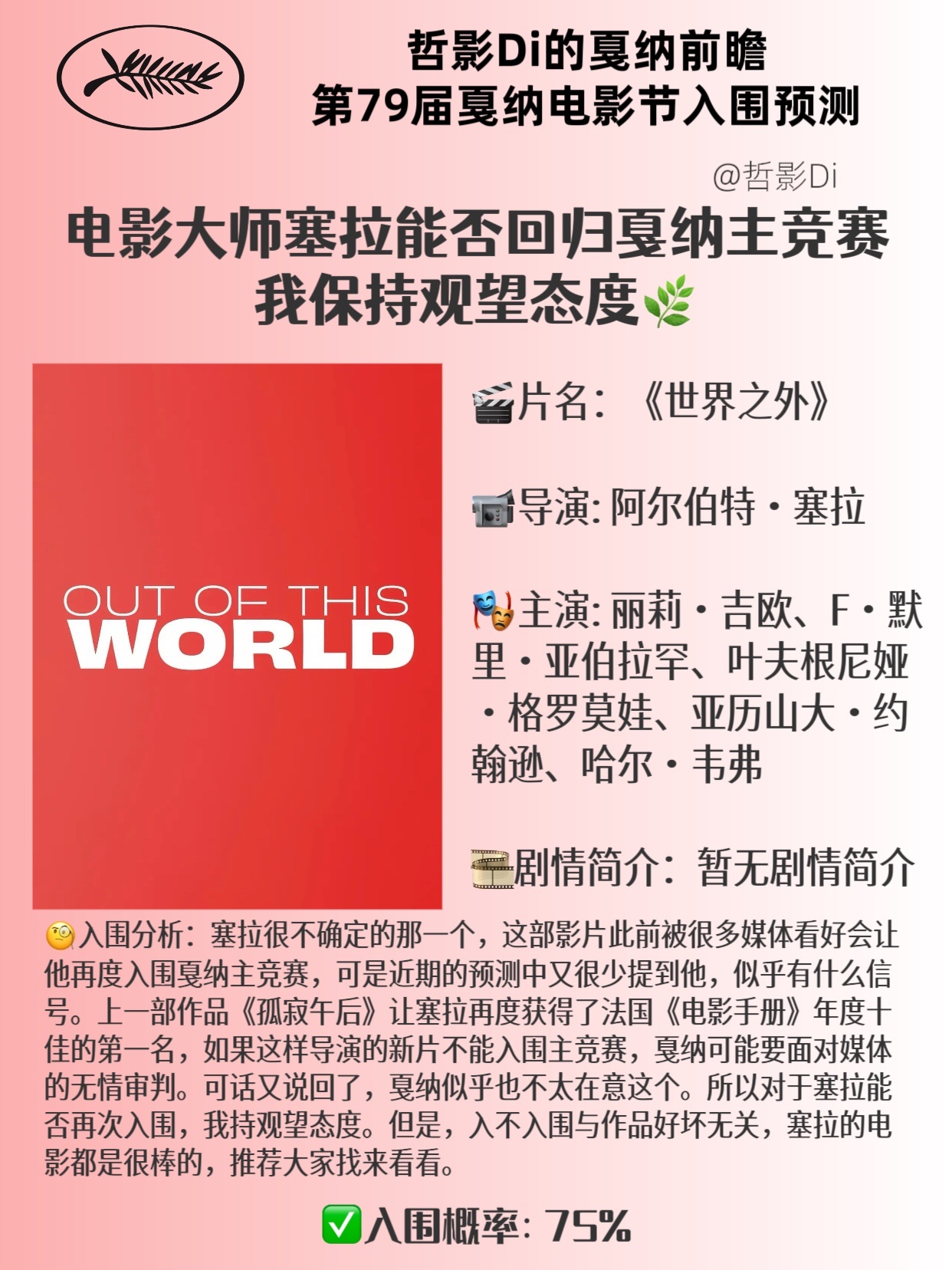 🧐入围分析:塞拉很不确定的那一个,这部影片此前被很多媒体看好会让他再度入围戛纳主竞赛,可是近期的预测中又很少提到他,似乎有什么信号。上一部作品《孤寂午后》让塞拉再度获得了法国《电影手册》年度十佳的第一名,如果这样导演的新片不能入围主竞赛,戛纳可能要面对媒体的无情审判。可话又说回了,戛纳似乎也不太在意这个。所以对于塞拉能否再次入围,我持观望态度。但是,入不入围与作品好坏无关,塞拉的电影都是很棒的,推荐大家找来看看。✅入围概率:75%