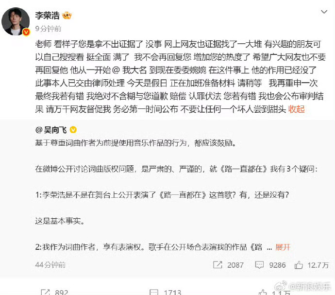 李荣浩再度回应吴向飞李荣浩称已交由律师处理 刚刚,再回应吴向飞:“看样子您是拿不出证据了”,称不会再回复对方增加热度,此事已交由律师处理。并重申有错必担责,“请万千网友督促我,务必第一时间公布,不要让任何一个坏人尝到甜头”。