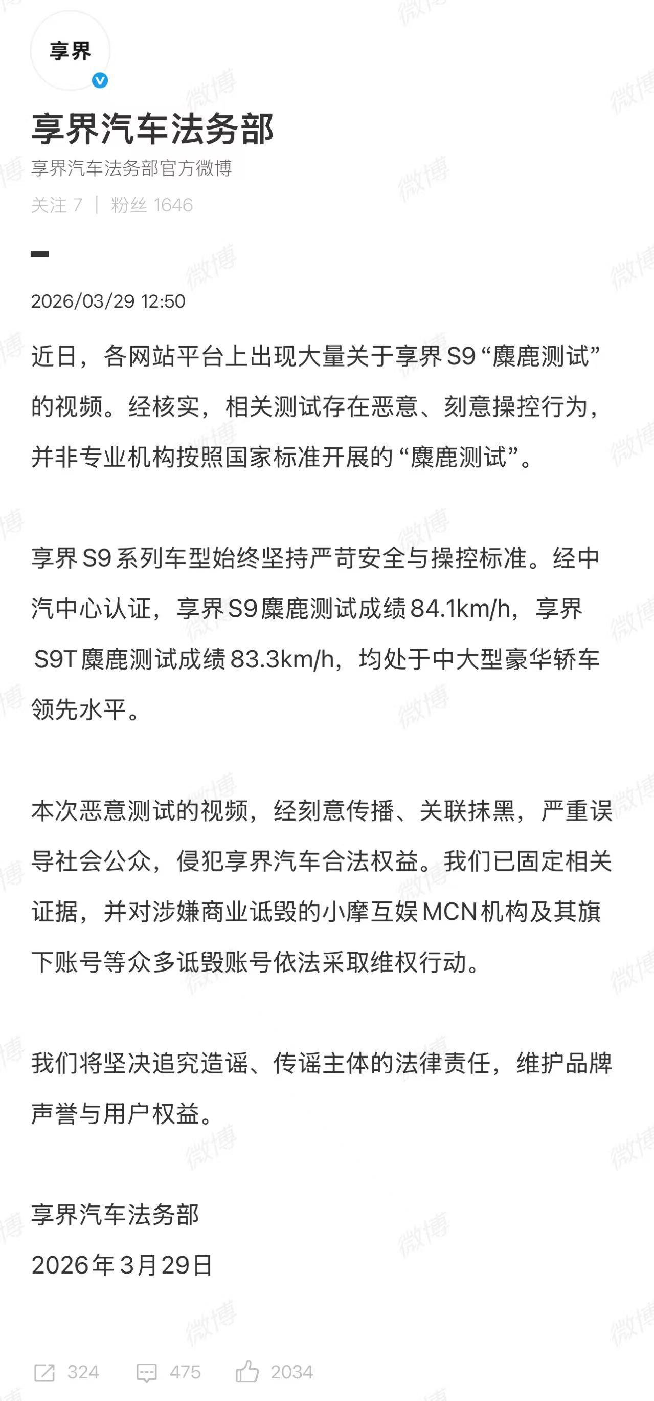 享界,就S9麋鹿测试被“作弊”吊打,今日法务发声 - 恶意测试、刻意操控、非专业机构 - 刻意传播、关联抹黑,严重误导、侵犯权益、诋毁维权、追究责任【来自懂车帝车友圈】