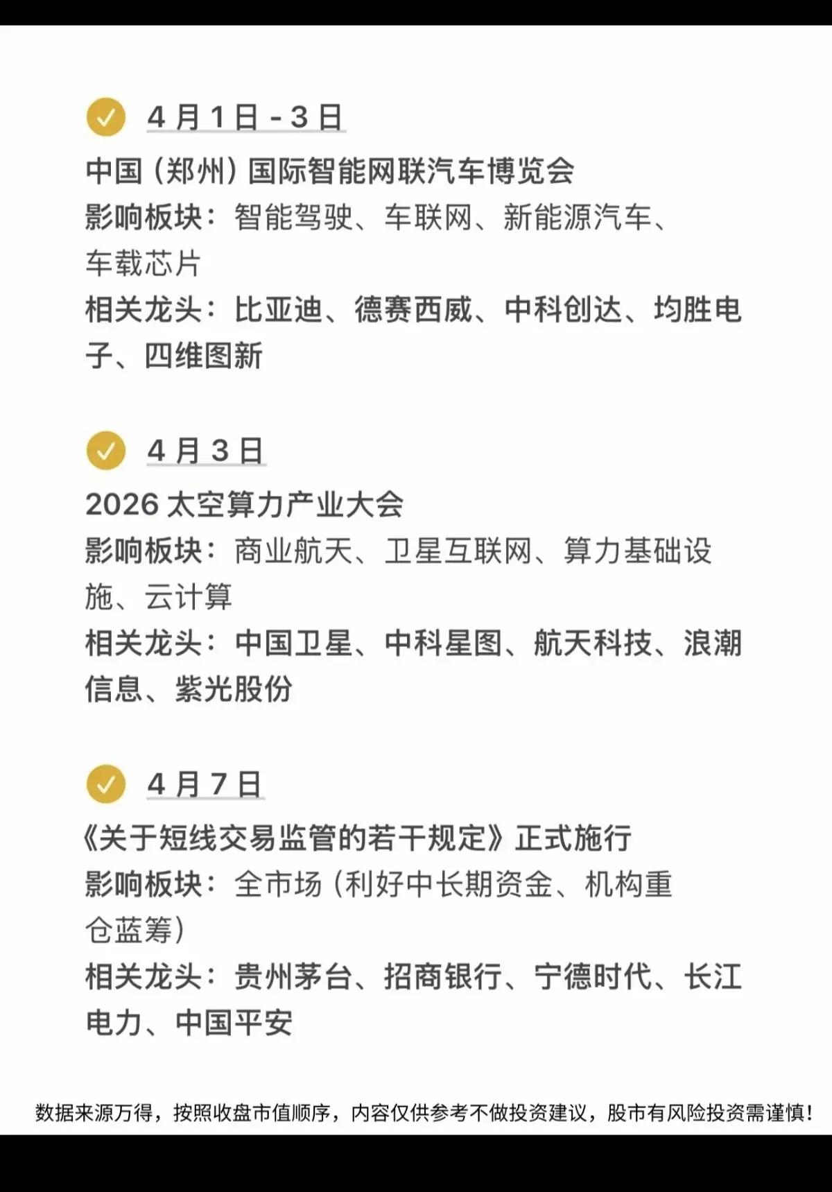 4月A股大事件前瞻:关键节点与主线机会梳理!!! 一、月初政策落地:多赛道迎直接催化 4月1日起多项政策正式实施,直接影响相关板块的基本面预期: - 光伏出口退税调整:取消部分光伏产品增值税出口退税,对隆基绿能、通威股份等海外收入占比高的企业短期形成压力,也倒逼行业加速技术迭代与成本优化。 - 出口退税新规施行:利好外贸出口、跨境电商与财税数字化赛道,税友股份、金财互联等企业有望受益于政策规范带来的业务增量。 - 刚果(布)关税协定落地:降低部分有色金属进口成本,利好紫金矿业、洛阳钼业等资源企业,缓解原材料价格压力。 二、主题展会密集,赛道情绪轮动 4月多场产业大会将成为主题炒作的催化剂,关键节点如下: 时间 事件 核心赛道 代表企业 4.1-3 郑州智能网联汽车展 智能驾驶、车联网 比亚迪、德赛西威、四维图新 4.3 太空算力产业大会 商业航天、卫星互联网 中国卫星、中科星图 4.8-10 苏州新能源博览会 储能、锂电池 宁德时代、亿纬锂能 4.10-12 春季医疗器械展 高端医疗设备、创新药械 迈瑞医疗、联影医疗 4.17-22 AACR年会 创新药、ADC药物 恒瑞医药、百济神州 4.21-25 数控机床展 工业母机、高端机床 科德数控、华中数控 4.22-23 半导体创新大会 AI算力芯片、先进封装 中芯国际、长电科技 三、市场规则与业绩节点,决定中期风格 - 4月7日:短线交易监管新规施行 新规将抑制高频短线炒作,引导资金向中长期配置倾斜,利好贵州茅台、招商银行等机构重仓的蓝筹股,市场风格或向价值与高股息赛道切换。 - 4月15日:深市一季报预告截止 业绩预增、扭亏的公司将迎来估值修复,而业绩不及预期的标的可能面临回调,需重点关注业绩与股价的匹配度。 - 4月30日:年报+一季报披露收官 市场将完成业绩“证伪”,主线赛道的业绩确定性将成为资金选择的核心依据,同时叠加美联储FOMC会议(4.28-29)的外部流动性影响,市场波动可能放大。 四、操作节奏与风险提示 1. 月初政策催化:优先关注出口退税、关税协定相关的低估值标的,规避政策利空的高估值光伏企业。 2. 主题轮动阶段:展会催化的主题赛道,需提前布局、会后兑现,避免追高情绪退潮。 3. 业绩披露期:以业绩确定性为核心,规避无基本面支撑的纯题材炒作,蓝筹与高股息标的具备防御性优势。 4. 外部风险:美联储议息会议的政策表态将影响北向资金流向,需关注美元指数与贵金属板块的联动变化。 ⚠️ 以上内容仅为事件梳理,不构成任何投资建议,股市有风险,入市需谨慎。
