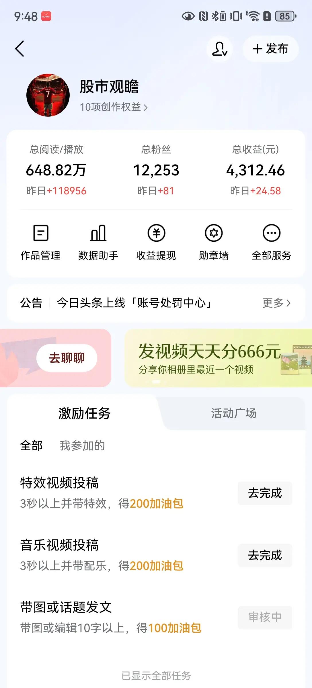 标题:11万阅读才24块?头条号这收益,真当我是做慈善的? 昨天后台一刷新,我整个人都懵了。 648万总阅读,粉丝1万2,看着还行吧?结果一看收益,4312块。再细看昨天的数据:单日阅读量暴涨11.8万,粉丝涨了81个,这在任何平台都算得上“爆款日”了吧?可收益呢?才24.58块! 你没看错,11万阅读,24块5毛8。平均每1万阅读,才赚2块钱。这什么概念?路边摆摊卖烤肠,一串都比这强。我这不是写文章,我这是在给平台做免费公益宣传! 我辛辛苦苦选题、查资料、写稿、排版、配图,花两三个小时写一篇深度分析,结果换来的是“24块5毛8”的尊重?这连一杯像样的咖啡都买不到。更离谱的是,下面还挂着“特效视频投稿得200加油包”“音乐视频投稿得200加油包”的任务——合着写文字不值钱,做点花里胡哨的短视频才配被奖励? 平台总说“内容为王”,可王在哪里?王在阅读量?王在粉丝数?还是王在那点可怜的广告分成? 我算是看明白了,头条号的算法,根本不是为创作者服务的,而是为流量服务的。你写得再好,只要不“标题党”、不“情绪化”、不“蹭热点”,收益就永远是个笑话。真正有价值的内容,反而被淹没在“震惊体”和“搬运工”里。 更讽刺的是,平台一边鼓励你“坚持创作”,一边用这种侮辱性的收益告诉你:“你爱写不写,大把人排队等着免费干活。” 我真想问问头条号:11万阅读,24块,你是认真的吗?还是说,这根本就是一场精心设计的“创作者骗局”——用虚假的流量泡沫,掩盖真实的收益黑洞? 我不是不能接受低收益,但我不能接受“白嫖”。如果一篇深度内容连一杯咖啡都换不来,那创作者的尊严,又值多少钱? 别再拿“加油包”当施舍了,我们想要的,是尊重,是公平,是靠内容吃饭的权利。 否则,下一个离开的,可能就不只是我一个了。