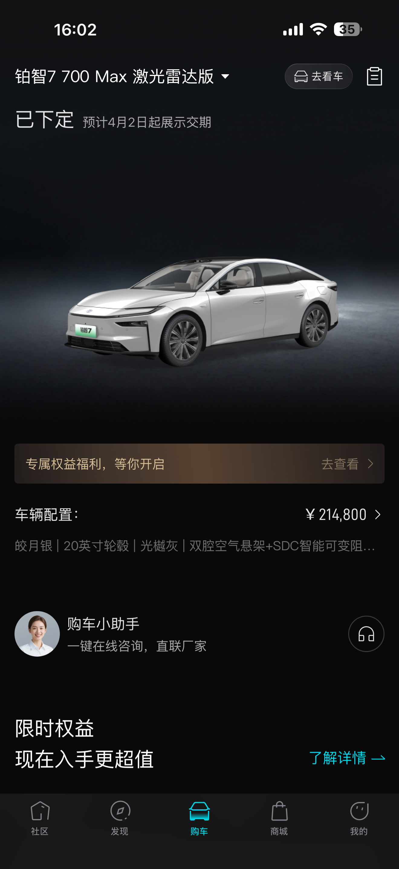 我这次自己也定了一台,叠加权益竟然不到20万,丰田品质+鸿蒙座舱+Momenta辅助驾驶,还有双腔空悬+激光雷达,这个价位还有谁?铂智7上市锁单超3100台铂智7上市限时补贴权益价14.78万起