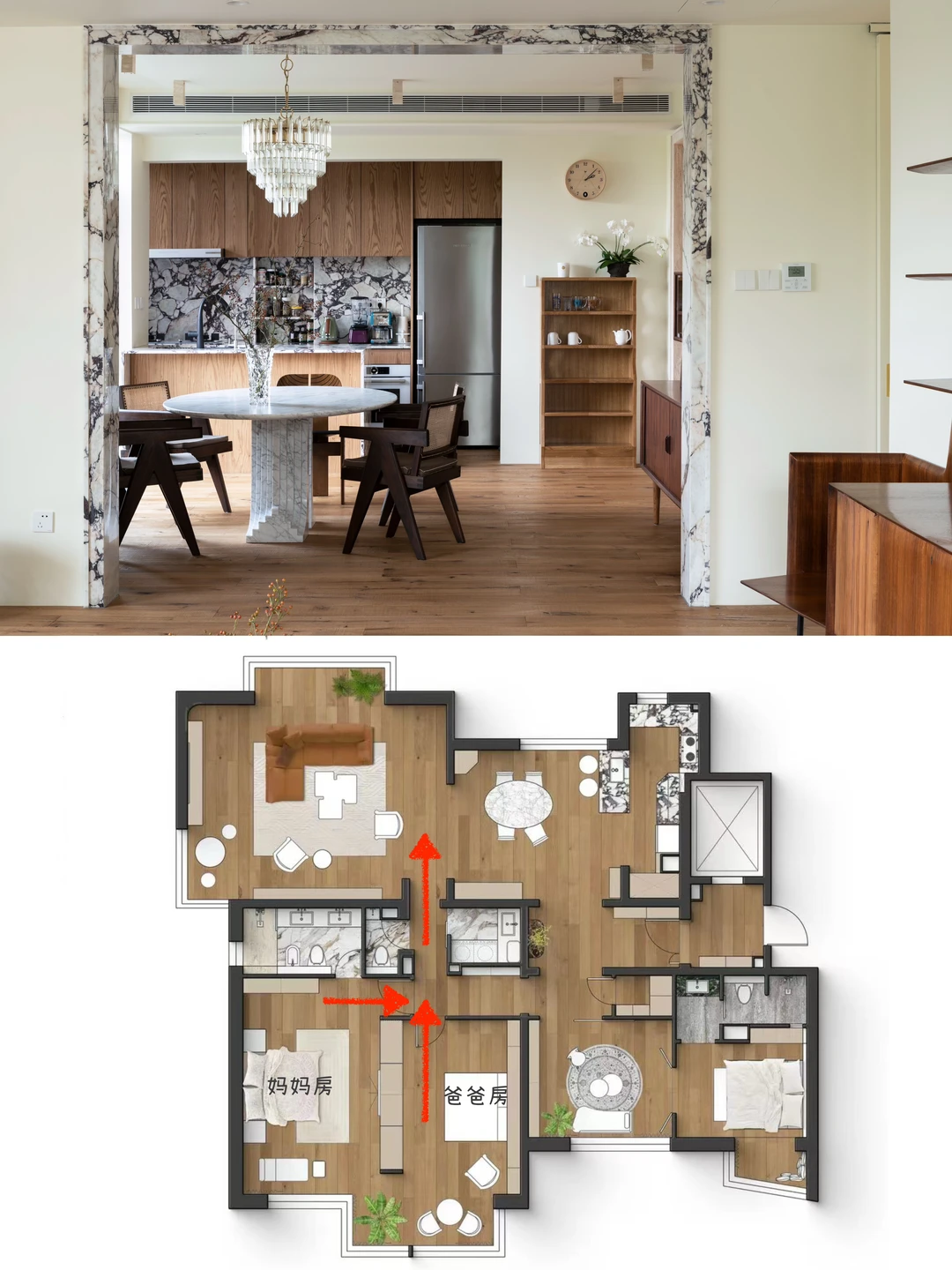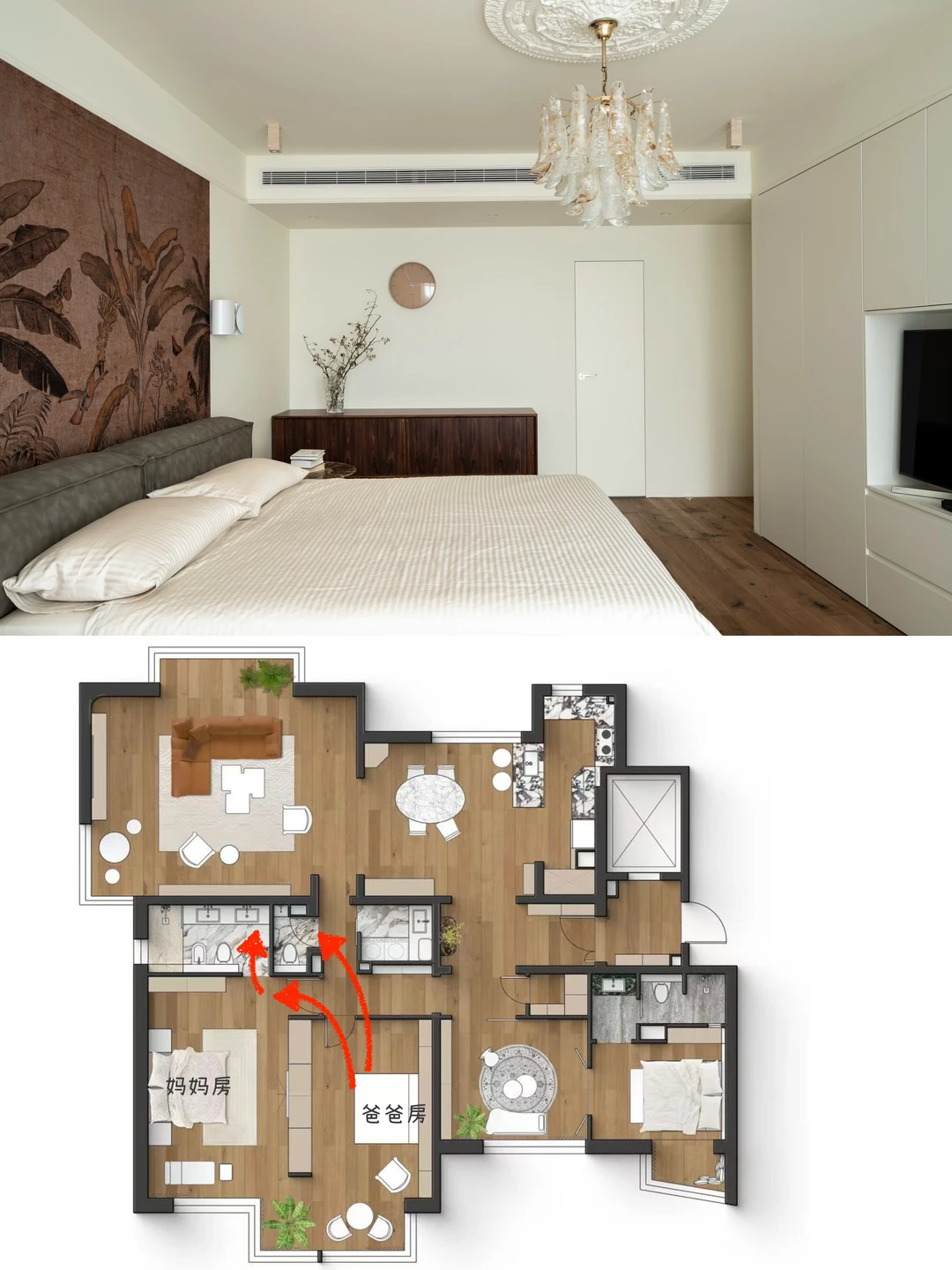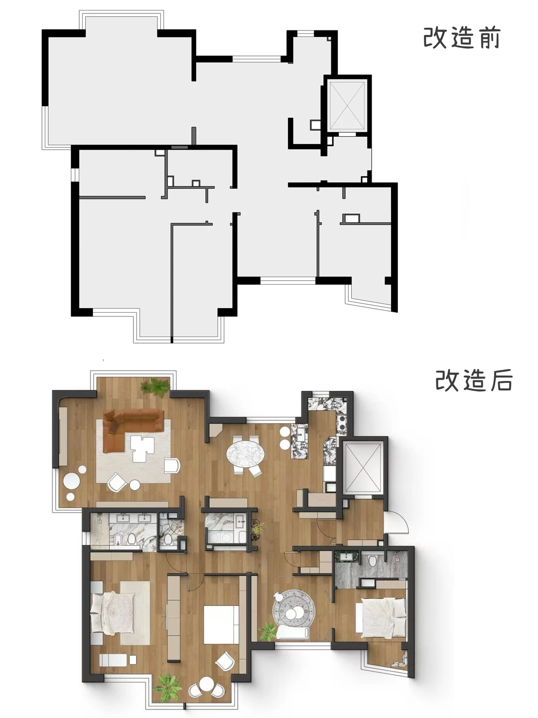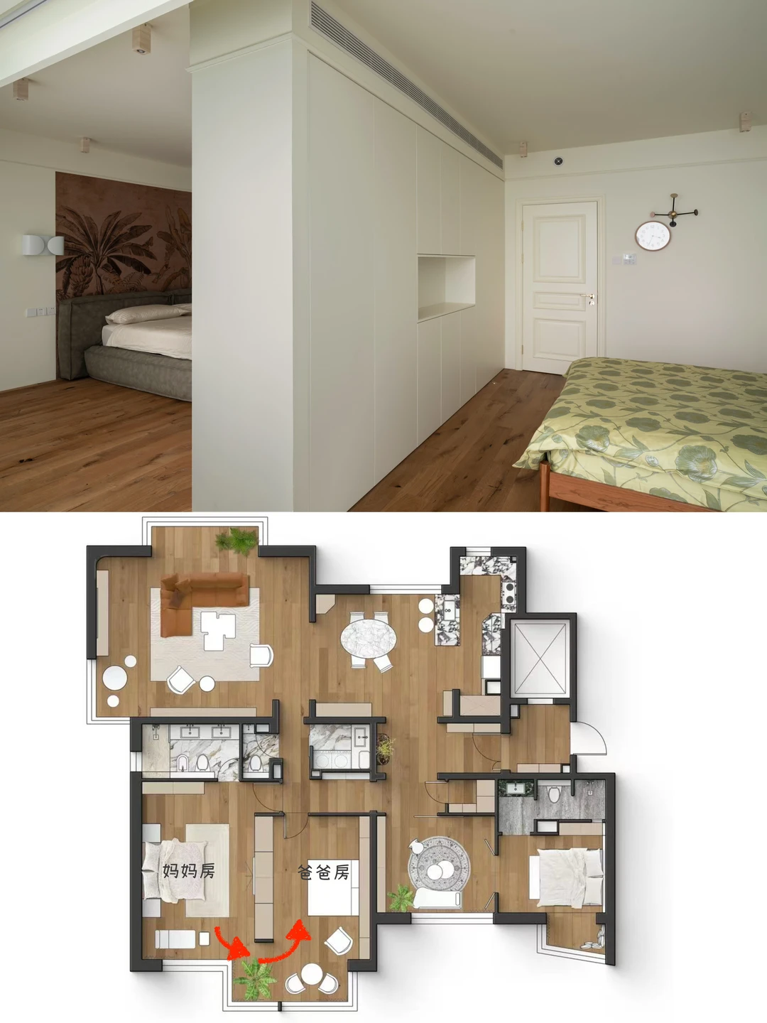 我发现大家装修的时候不太关注动线 动线理不顺,不管面积大小,入住之后都会绕来绕去,特别闹心 比如说给爸妈装修,动线肯定是越便捷越省心 我业主给爸妈装修,改造后格局改成了“回”字型 原来爸妈要绕玄关、餐厨区一大圈才能到客厅 现在穿过走廊直接就到了 卧室分床不分房,把相邻的2个房间阳台打通 从阳台就能在妈妈房和爸爸房之间走动 卧室自带卫生间,两边用起来都方便