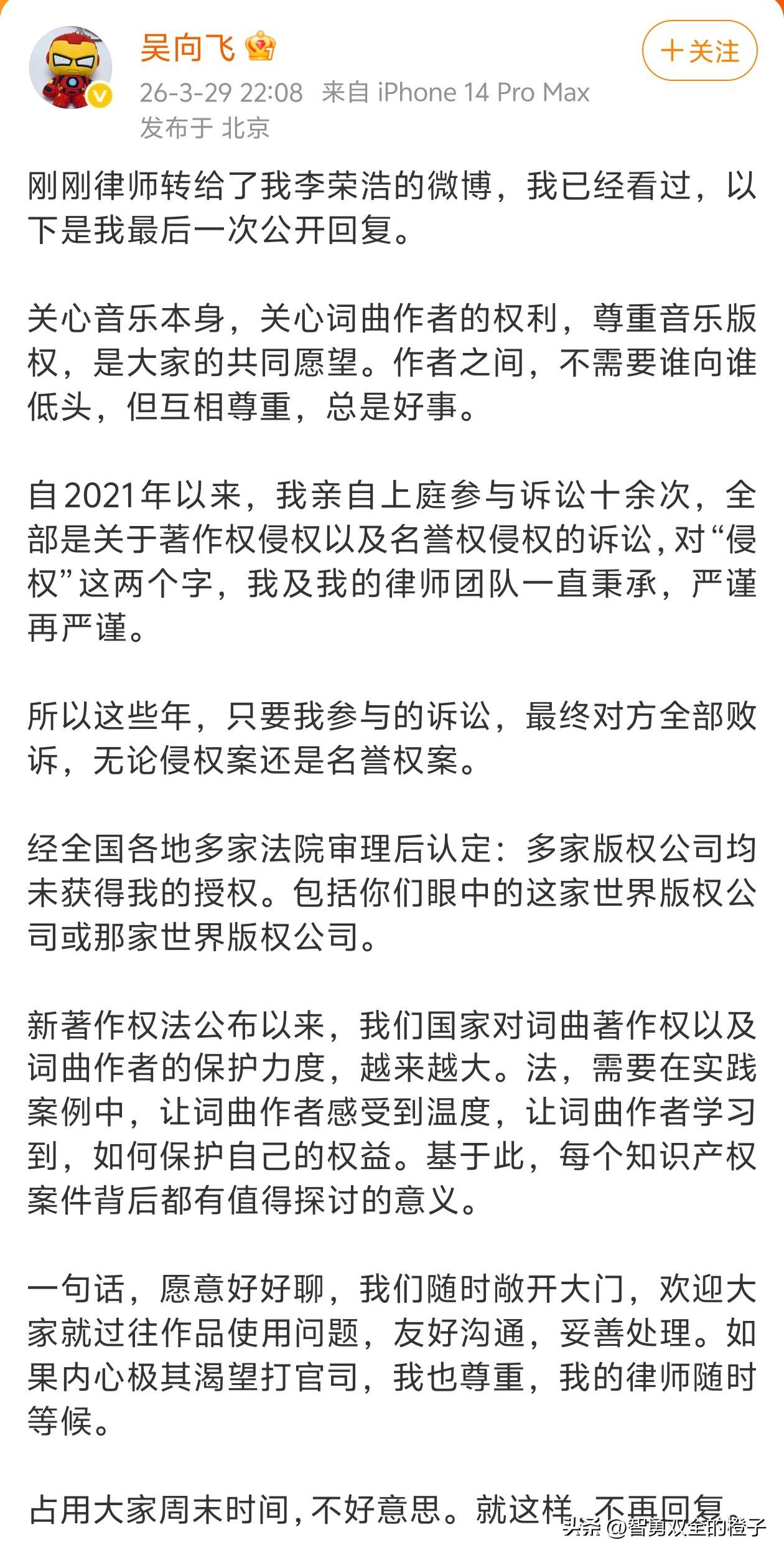 吴向飞这个最新回应,真的让人看笑了! 李荣浩让他回应的几个点,他完全不回应,说人家想打官司,难道不是你自己故意往上凑的吗? 明显就是他都没把事情搞清楚,就站出来帮单依纯怼李荣浩,没想到发现理亏说不过,然后开始顾左言右! 总结了一下他的回应,除了那些翻来覆去的套话,主要有3个点! 第1:他打官司很厉害,从来没输过,潜台词他和他的律师团队很厉害。 第2:所有版权公司都没有他的授权,这是全国各地法院认定过的,潜台词他还是认为李荣浩侵权了。 第3:他愿意私了,大家互相给个台阶就下,不要撕破脸皮。 我大概理清楚了,其实吴向飞应该找环球去打官司,李荣浩是公益助唱,根本不涉及侵权问题!