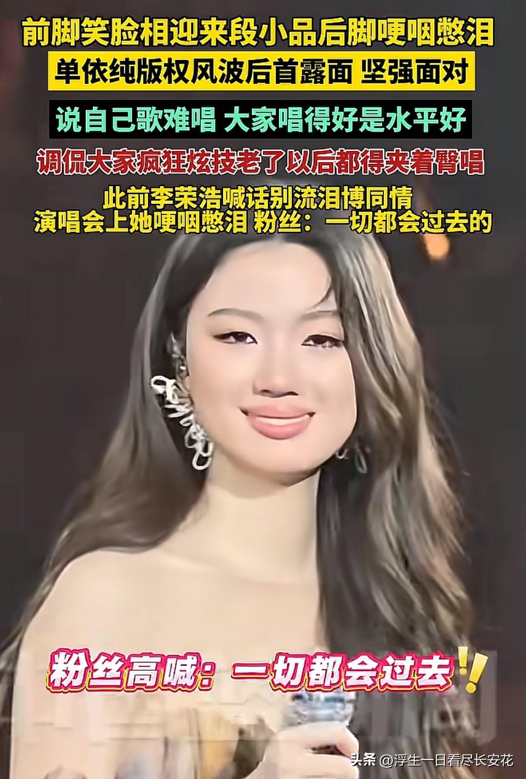 单依纯在版权风波后首露面的“先哭为敬”,把李荣浩推到了网暴的边缘,这波操作实在让人看不懂。 明明是自己侵权在先,李荣浩只是维护创作者的基本权益,结果单依纯一哭,舆论风向瞬间就变了。她前脚还在台上调侃大家“疯狂炫技老了以后都得夹着臀唱”,后脚就哽咽憋泪,粉丝在台下喊着“一切都会过去的”,这画面怎么看都像一场精心策划的“卖惨秀”。 李荣浩之前就喊话“别流泪博同情”,现在看来真是一语成谶。在这个流量至上的时代,好像只要你会哭、会卖惨,就能获得同情,而那些坚守原则的人,反而成了众矢之的。李荣浩维护的不只是自己的版权,更是整个行业的规则,可现在他却要因为别人的卖惨,面临被网暴的风险,这实在太不公平了。 其实大家心里都清楚,侵权就是侵权,不会因为眼泪就变成合理的行为。单依纯与其靠卖惨博同情,不如拿出诚恳的态度,向李荣浩道歉,向粉丝道歉,这才是解决问题的正确方式。 希望大家能保持理性,不要被眼泪蒙蔽了双眼,支持李荣浩维权到底,也希望单依纯能早日醒悟,用实力和态度重新赢得大家的认可。 对此,大家怎么看呢?欢迎留言。