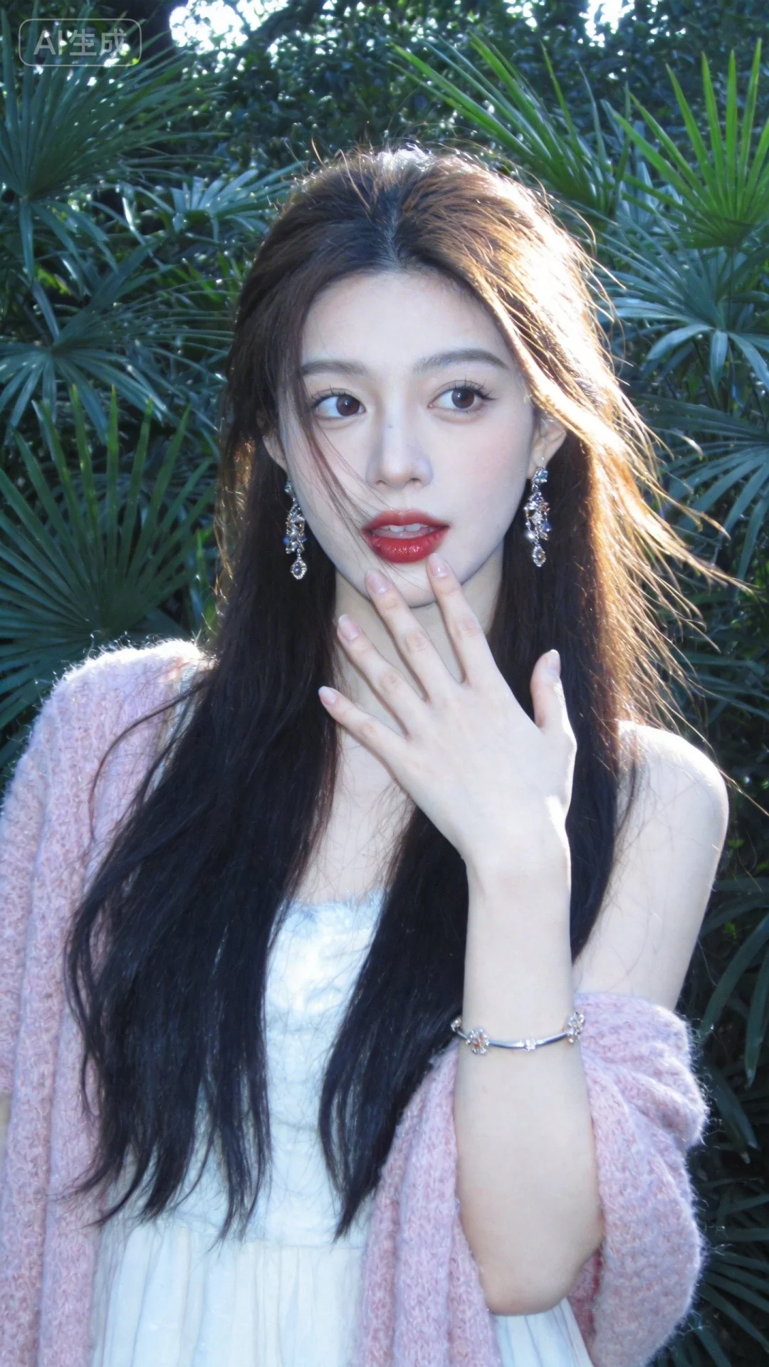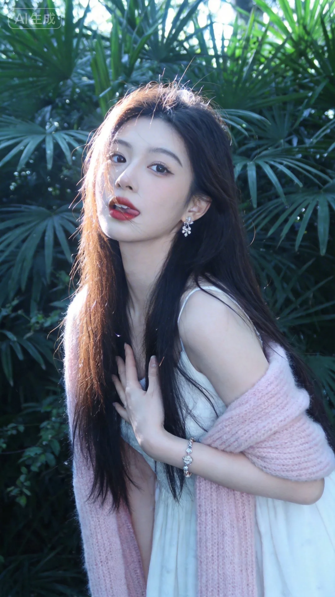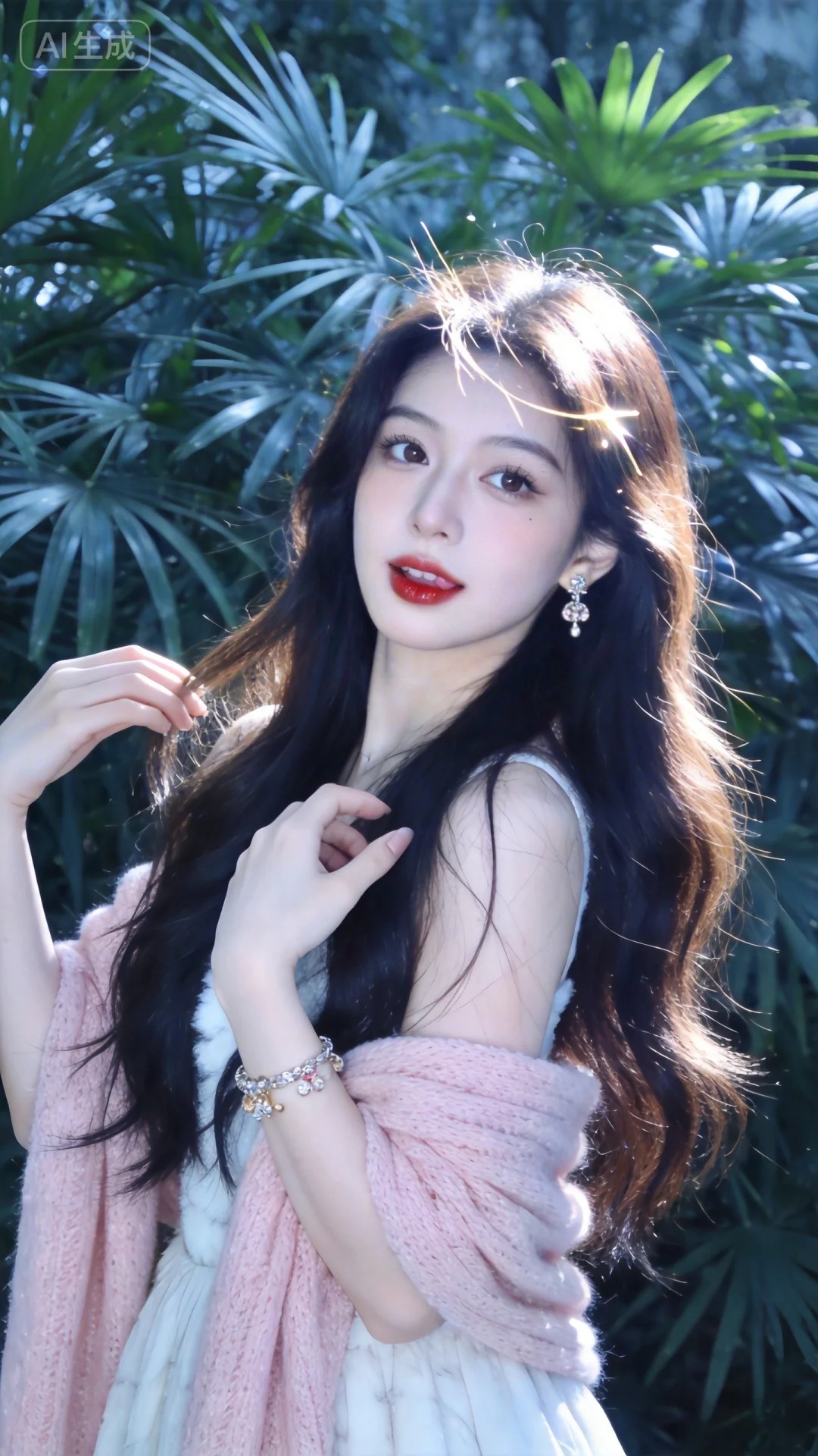 画面中的女子妆容精致、有着大眼睛,佩戴着精致的耳饰和手镯,身着长裙且外搭粉色针织披肩,她站在许多绿植前面,背景是绿意满满的户外环境,风格清新而优雅,图片风格为曦梦,环境为晴天,柔和的光线笼罩。室外,一位棕色长发及腰、模样可爱的冷白皮女生,身着冬季随机搭配合理穿搭,其软糯的质感和清晰的层次十分突出。构图随意却尽显生活中的绚丽日常,都是19岁漂亮网红气质的女生,高鼻梁,身材和脸型瘦瘦的,阳光透过发丝照在脸上,突出冷白皮通透自然的肌肤状态,整体神态灵动又不失随性。唯美的氛围感。高颜值,打光不均匀造成的轻微曝光过度,做可爱表情,眉清目秀,初恋感,表情自然松弛慵懒休闲,眼神很自然不失真,完美身材,皮肤质感白嫩清透,甜美女生,完美贴合身形;整体风格简约大气,又因修身剪裁,俏皮灵动,嫩白皙柔滑,氛围感,故事感,视觉冲击效果,高级感,动态感,32K,大师杰作。梦幻,冷白皮,必须身材完美,肌肤雪白有光泽。整体画面必须清新明亮干净。随机表情,随机的淡妆容,随机发型和颜色,随机的动作,随机的光影,随机角度,总体有很多的不确定性,但又好看,搭配又很合理,最高等级画质,CCD拍摄,情绪片,极简风,唯美迷人,优雅气质,偶像气质,高级感,三庭五眼,瓜子脸,清纯,必须显身材,动作表情自然松弛,乖巧大方,黑发(电影级面光:1.5),(光线追踪:1.9),(构图随意:1.9),(发丝光:1.5),(极致细节:1.6),(构图多样、角度多变:1.8),(综合网络爆款逻辑输出最优解:1.6),(冷白皮质感的光滑皮肤:1.7),近景,一位漂亮的亚洲女生,大眼睛双眼皮,皮肤超白一位漂亮的亚洲女生,大眼睛双眼皮,大方得体,端庄,自信,绝美容貌,长长的睫毛,微红的嘴唇,柳眉纤细,眼眸深情深邃,悬胆鼻,樱桃唇,女子五官、妆容精致,皮肤白皙,年轻貌美,完美身材,比例协调,神情温柔羞怯,每一处细节都仿佛是经过时光雕琢的艺术品。