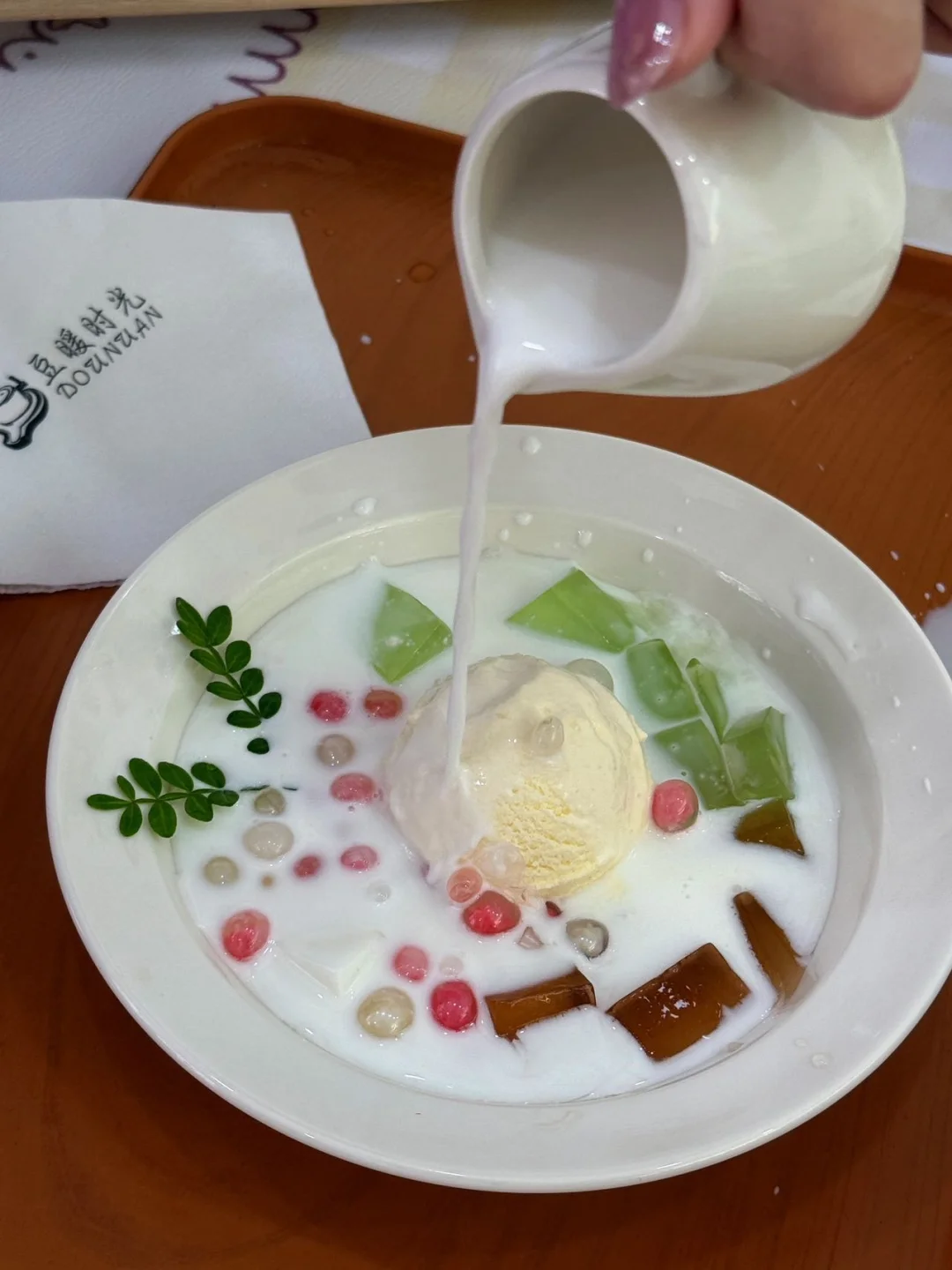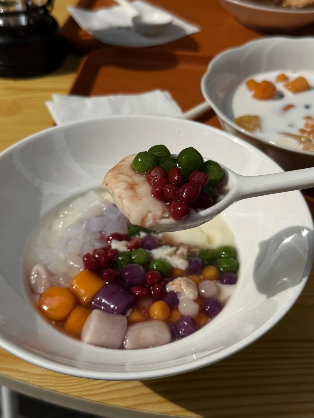 偶然挖到这家巷子深处的糖水铺 推门就像走进日剧小店~ 货架摆满怀旧小物件 空气里漫着甜甜的豆香,瞬间被治愈! 亲测必点清单: 🍨芒果紫米砖: 糯叽叽紫米+大块芒果,甜品胃大满足! 🍧椰奶清补凉: 料多到溢出来,椰奶味超正 🍡豆花全家福: 嫩滑豆花搭配芋圆/芋泥/茶冻,口感爆炸丰富 它家还有特色傣味小吃 酸辣馄饨配糖水简直神仙吃法! 人均15左右,性价比超高 已经列入我的私藏店铺清单啦✨ 📍豆暖时光