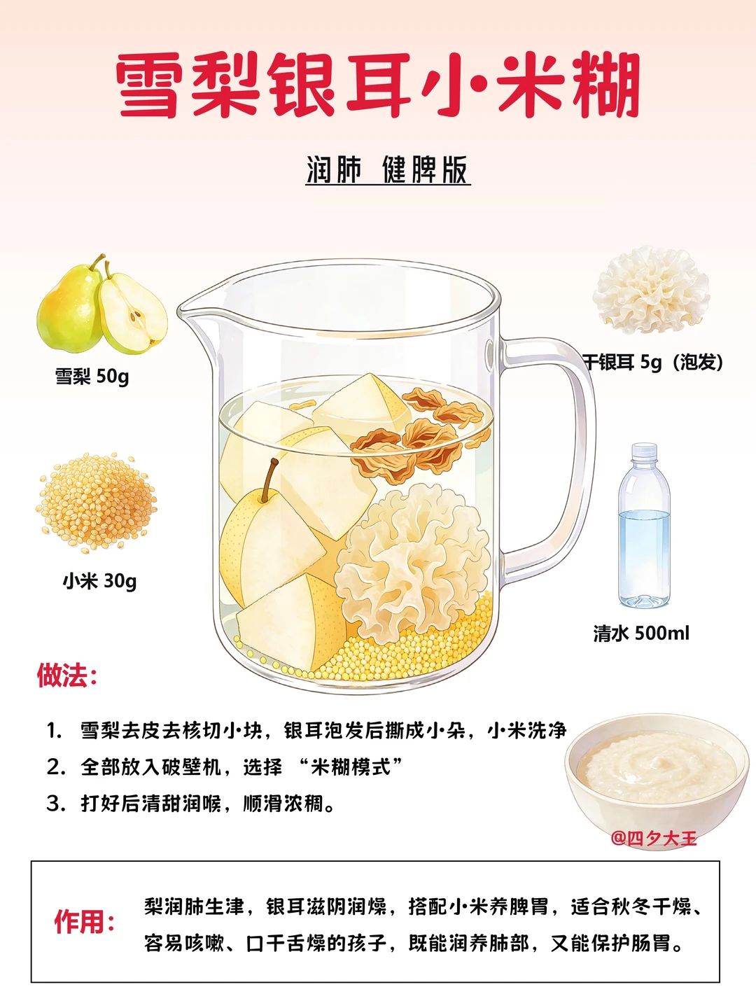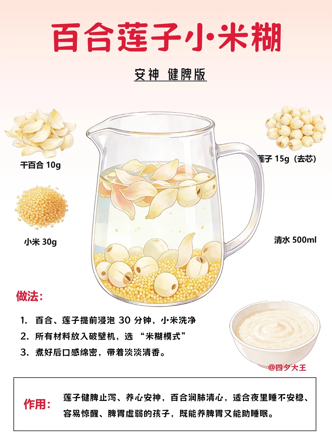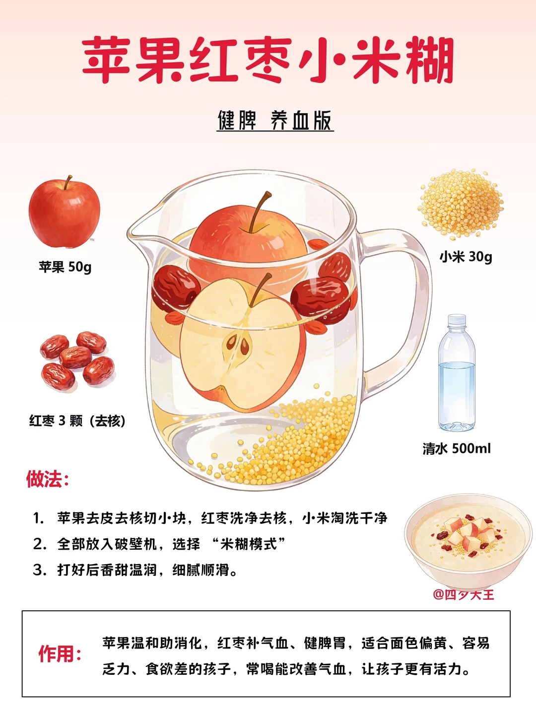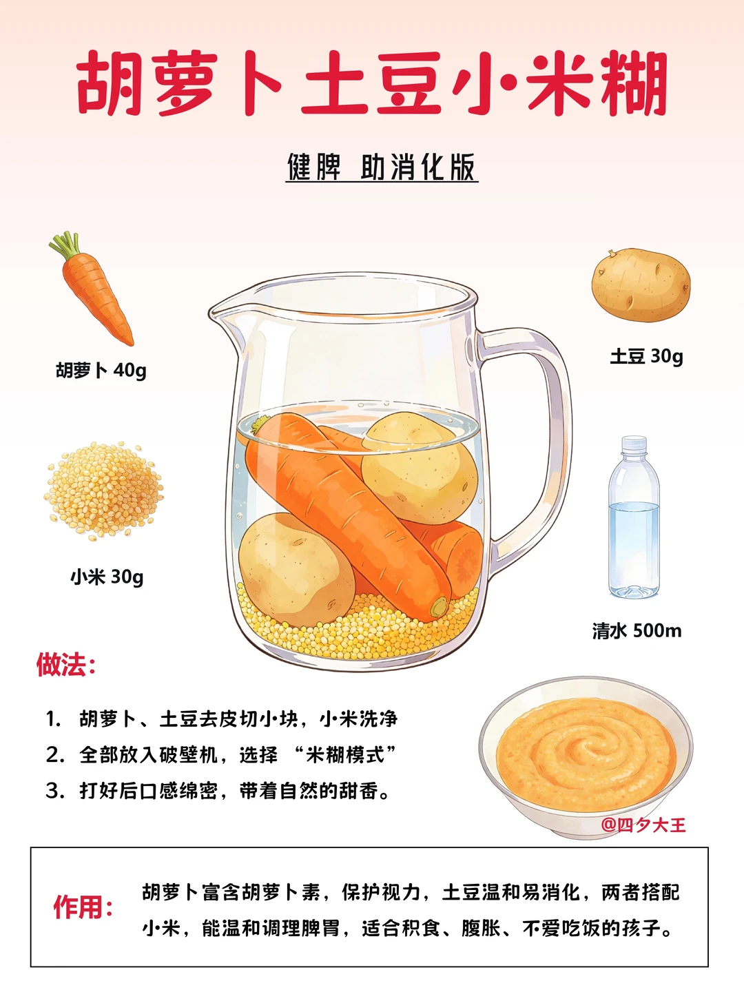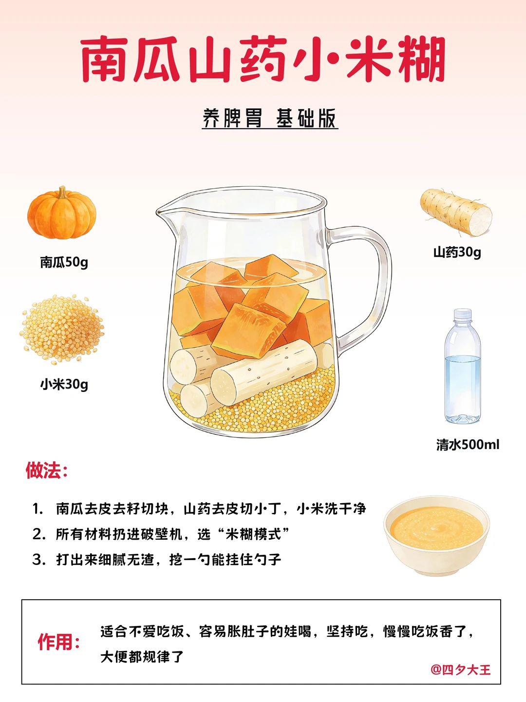 . 6 种健脾胃米糊 搭配换着做,营养又美味😄 我家哥哥半年窜了✔️5cm 除了饮食外,当然也离不开 平时的规律作息和运动~ . ✅今天分享我家哥哥日常喝的6款养脾胃米糊 ✅脾胃养好了, 吸收就会变好,自然猛猛长~ 1、南瓜山药小米糊 2、苹果红枣小米糊 3、百合莲子小米糊 4、胡萝卜土豆小米糊 5、芡实茯苓小米糊 6、雪梨银耳小米糊 . 👉根茎类多放!南瓜、山药、红薯自带甜味,不用加糖也好喝 👉小米提前泡 10 分钟,打出来更细腻
