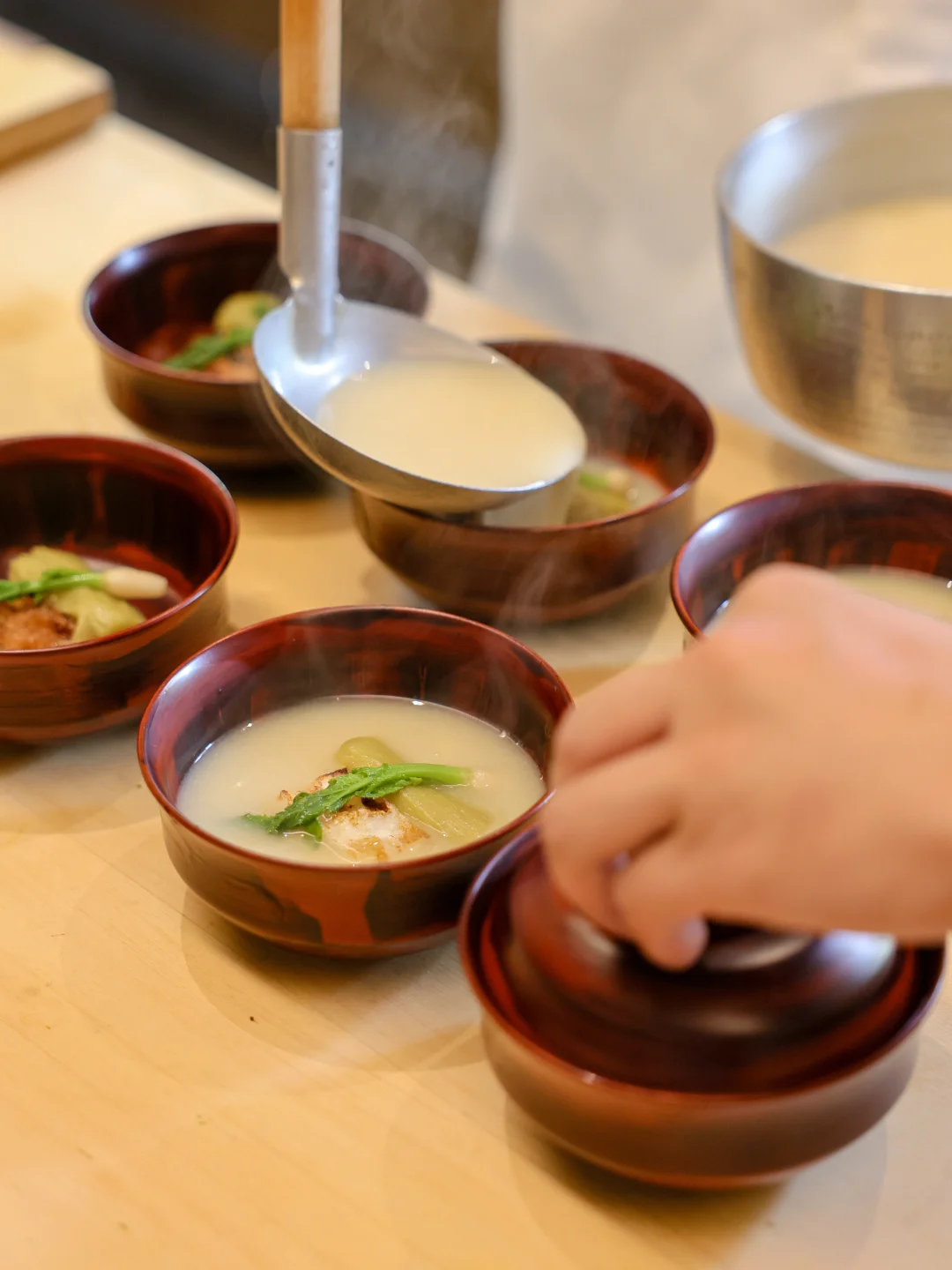 🍃年糕炭烤过,很有拉扯感,而且其糯劲与茄子又截然不同,这几者搭配出来的风味温和,但胜在口感层次丰富,高汤本身为两种主食材增色不少。