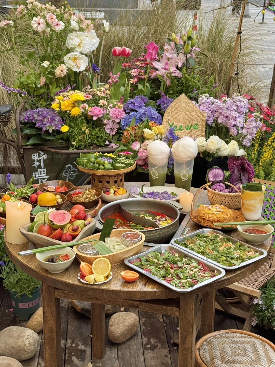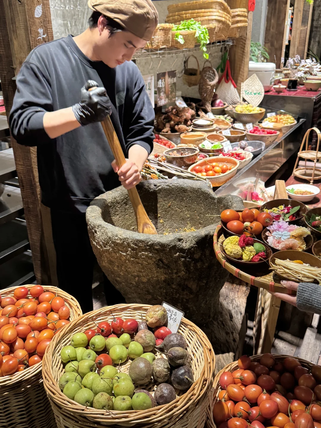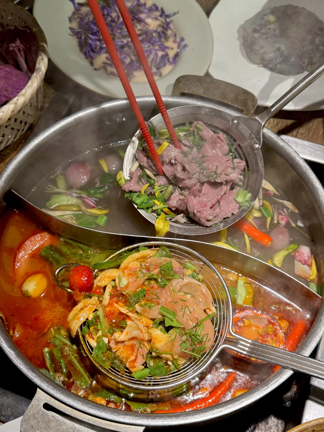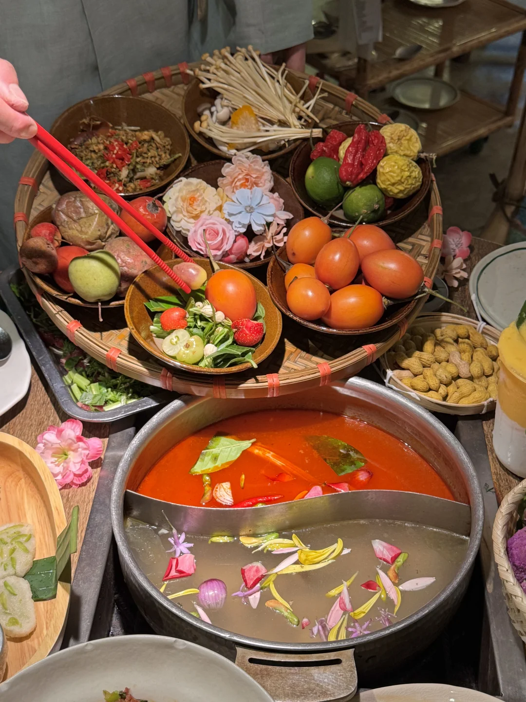 经常和朋友去吃的云南山野火锅 木质调很有sense,瓜果多多感觉到了西双版纳 春天院子里花开的正好,生机勃勃美呆了!! ✔️现舂野佐料锅底酸酸辣辣的,傣家鲜花锅底漂亮清新,涮寻甸黄牛肉very好吃!!!新出的春野繁花酿虾滑好吃,虾肉Q弹新鲜,花香很特别!!豌豆花鳕鱼滑好duang~ ✔️茴香菌菇炒饭喷喷香!!滇南糯叽叽青蛙趴石板又是没见过的小吃,很特色!!! ✔️抹茶椰子蛋、液体版芒果糯米饭…满意满意!!!