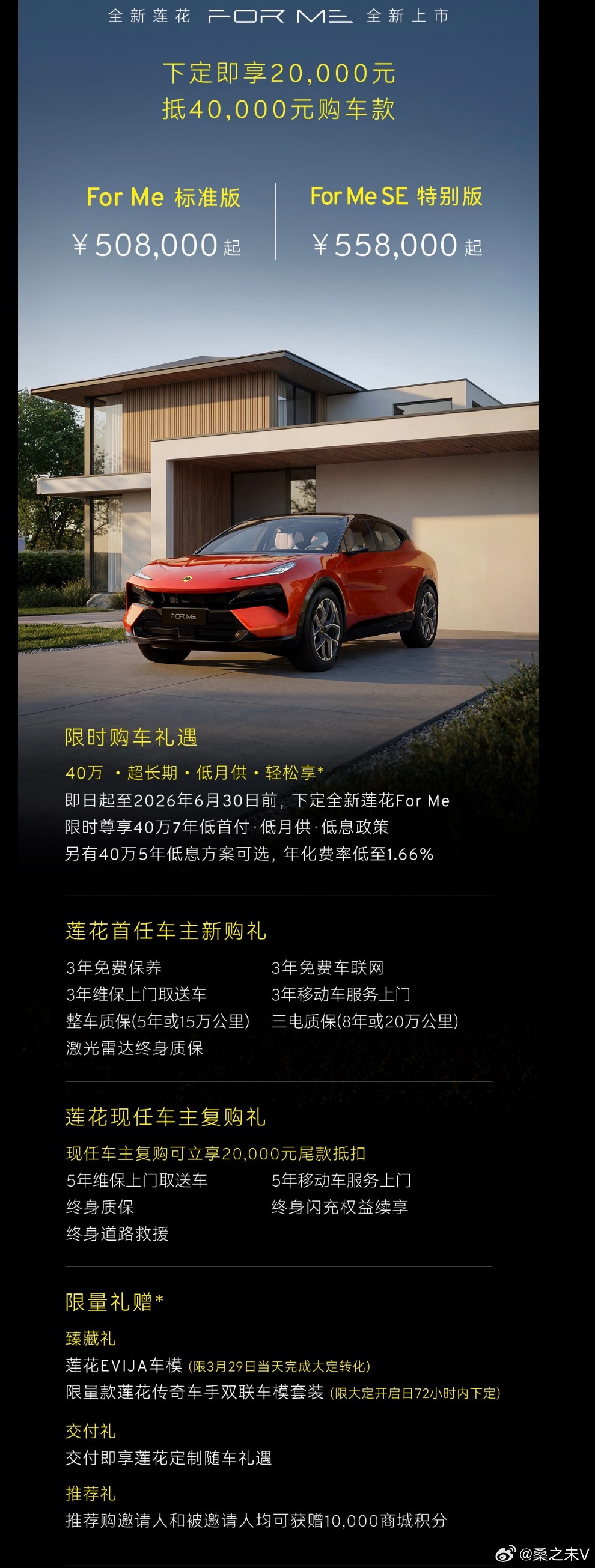 莲花跑车同步推出限时首订权益:6月30日前下定的首批用户,可享2万元定金抵扣4万元尾款的特别权益,并可额外获得价值高达4.5万元的惊喜权益礼包。针对现任车主(含Elise、Exige、Evora车型),复购全新莲花For Me可额外享受2万元尾款抵扣,叠加前述首订权益后,综合优惠最高可达4万元。此外,老用户的无忧用车权益也将全面升级,原有终身闪充权益可限时平移至新车,进一步降低用车成本。