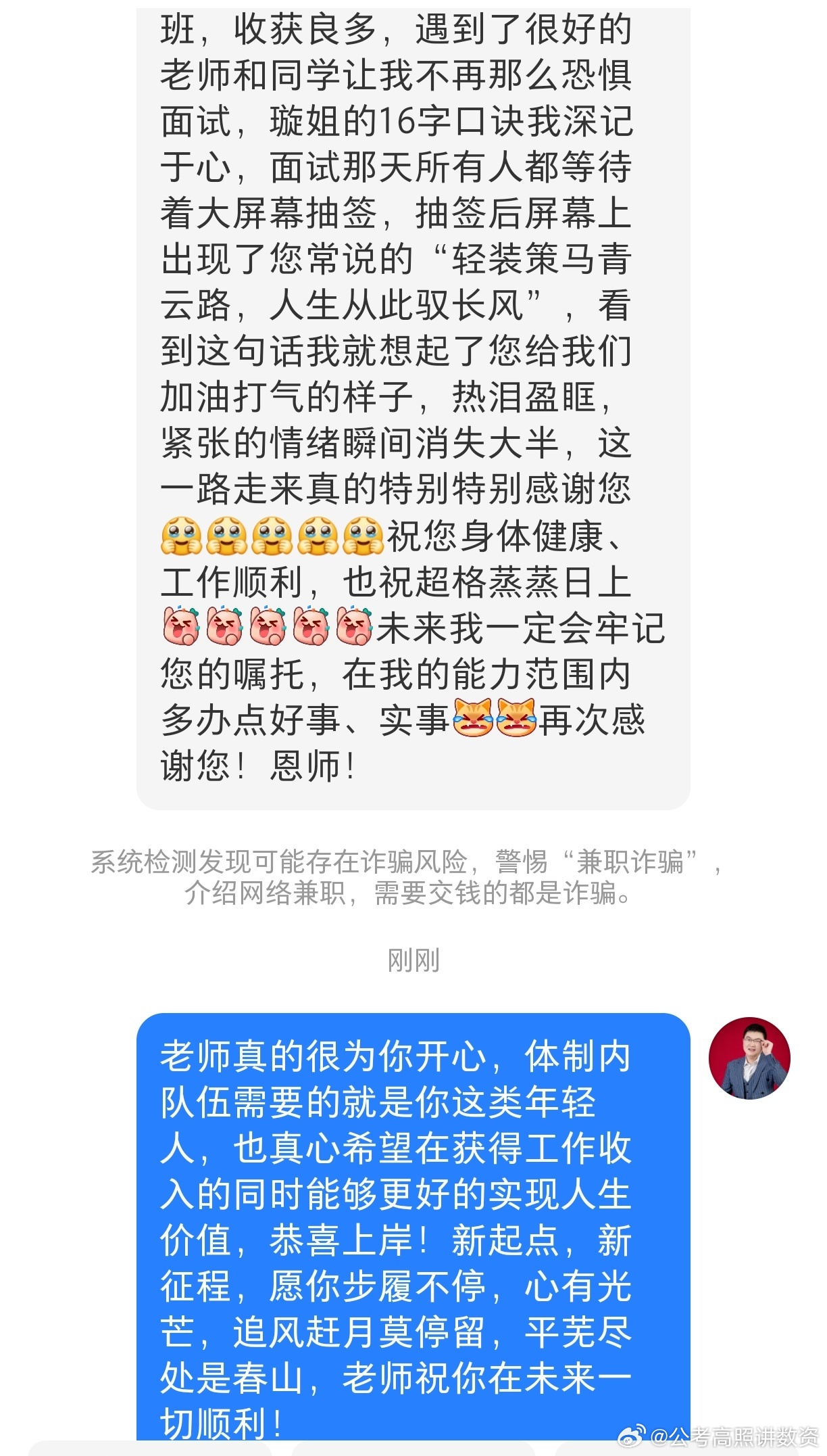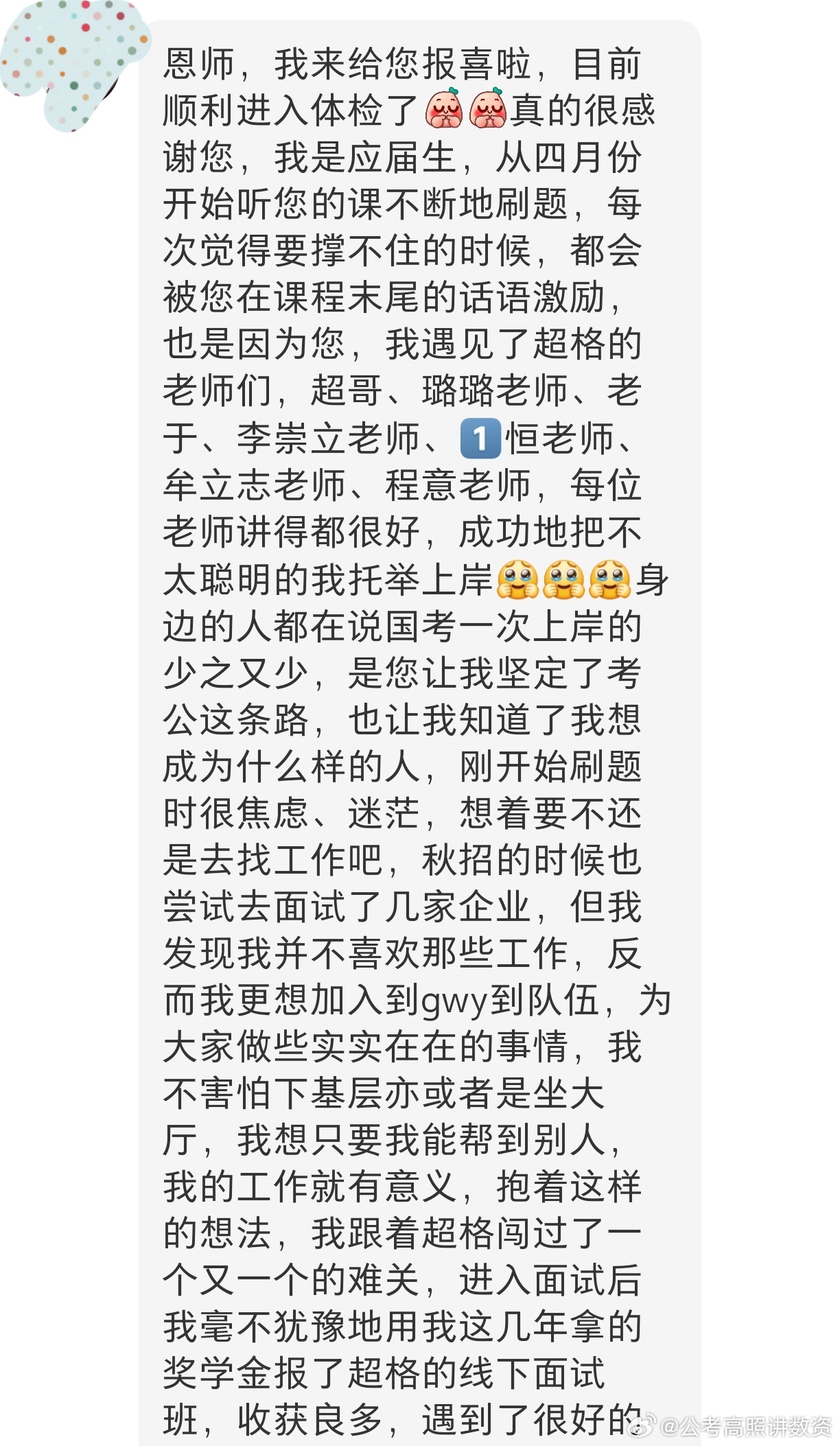 成功上岸,好运贴贴(1044)对于上岸这件事,本身具有一定的主观性,有些希望能够实现人生价值,有些为了一份体面的工作,有些为了稳定,这本身没有对错之分,只要能够满足自身对工作的需要,那都有其价值所在。但是这份工作其实真的算是一份还算比较高尚的工作,因为无论笔面,“为人民服务”这个词都是贯穿于始终的,我们都是老百姓,知道有时候办事挺难,因为淋过雨,所以更想为别人撑伞,也很希望大家,都能成为那个为别人撑伞的人,恭喜上岸,祝大家一切顺利!