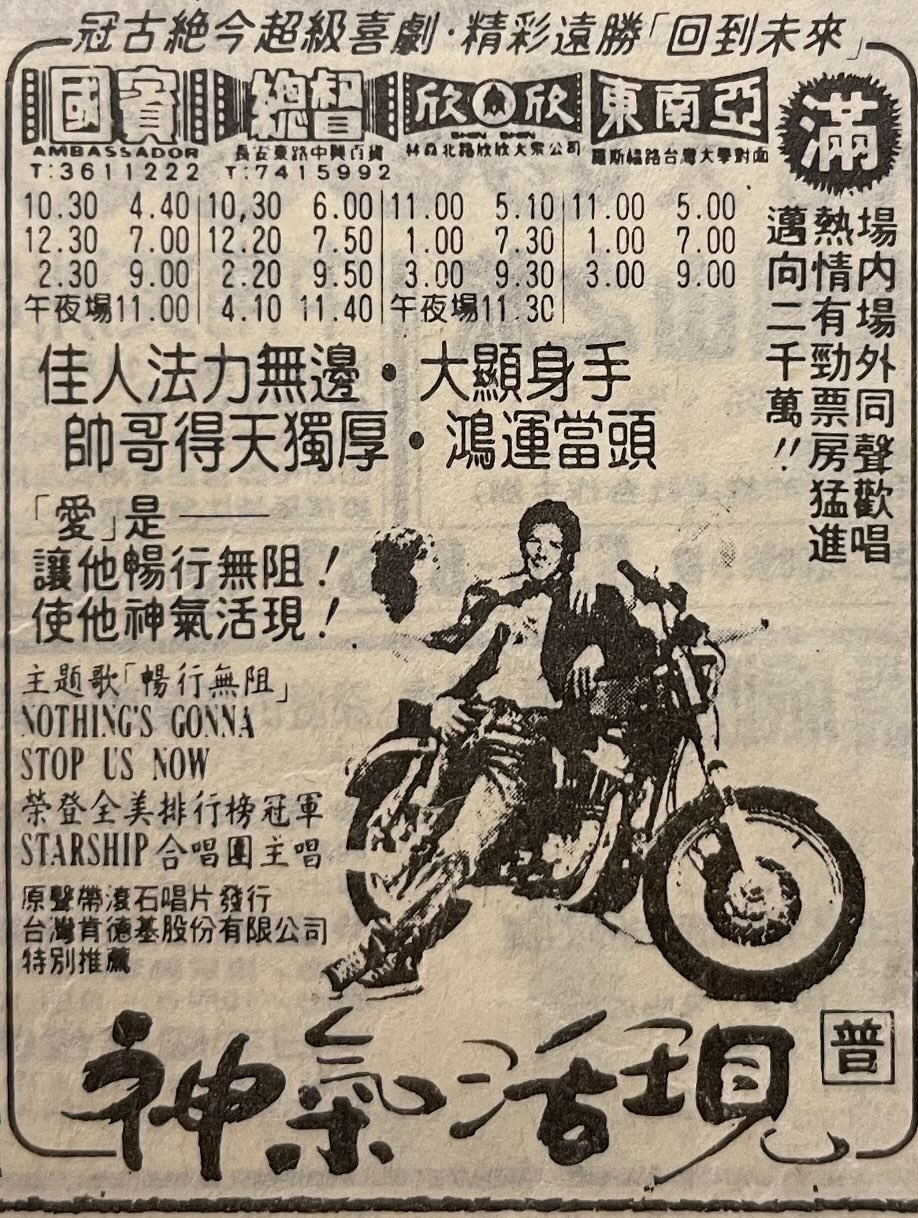 【来自投稿】1987年美国喜剧电影,《神气活现》(Mannequin)电影剧照。其片尾曲:“Nothing‘s gonna stop us now”由星船乐队(Starship)主唱,在商业上大获成功。(登顶当年美国公告牌百大单曲头名;1987年英国最畅销专辑第二名;第六十届奥斯卡最佳原创音乐提名)此片在台湾亦有上映,同时被正大剧场在九十年代引入中国大陆。香港著名歌手林子祥,曾翻唱其片尾曲粤语版“敢爱敢做”。可以说,此片及其片尾曲,在中国两岸三地皆有极大影响。图一为原版海报;图二为台湾地区海报;图三-图六为影片女主,Kim Cattrall;图七为星船乐队(Starship)合照
