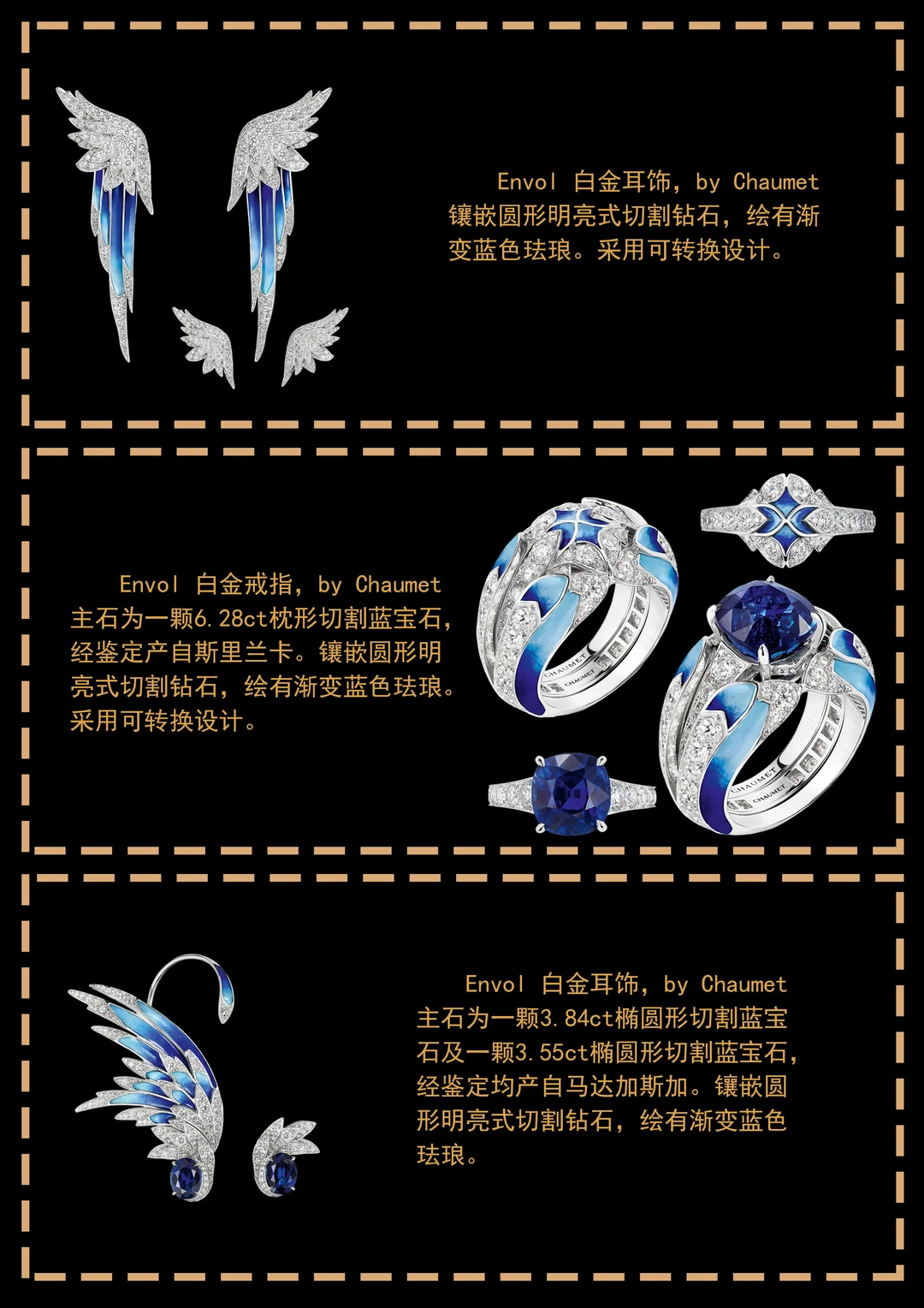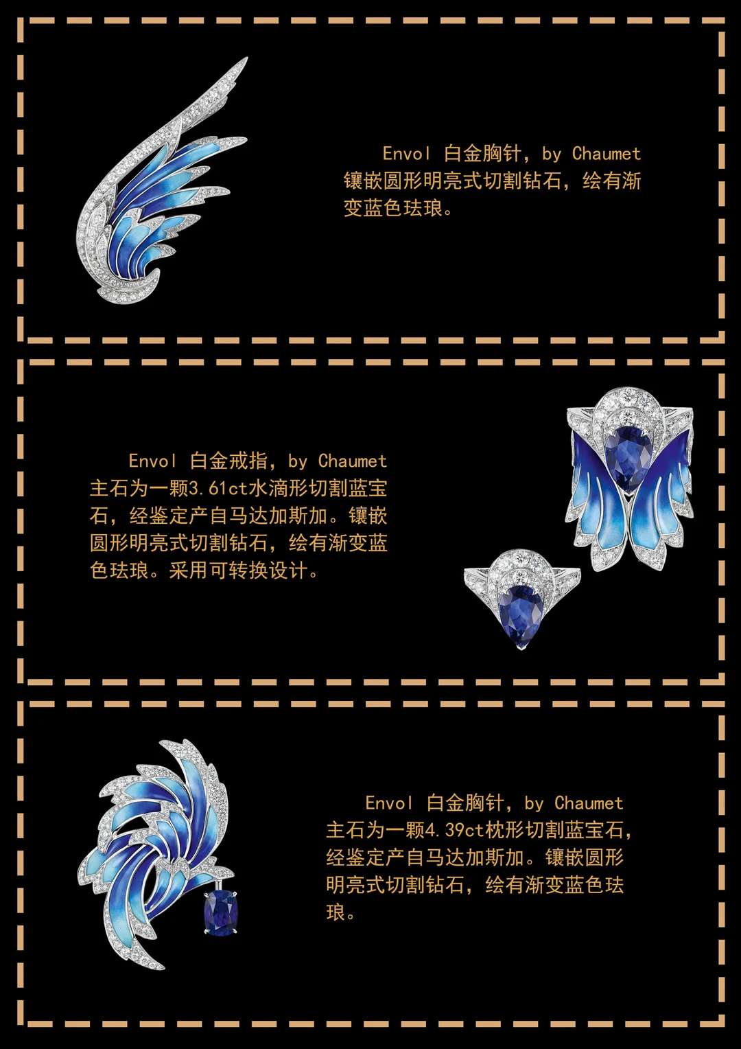 创作灵感源自品牌历史典藏的一款羽翼造型头饰。新作运用珐琅彩绘和宝石镶嵌创造出凌空高飞的蓝色羽翼图腾,结合可转换设计,创造出轻盈而有生命力的珠宝作品。