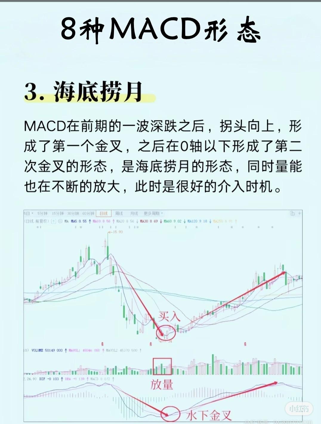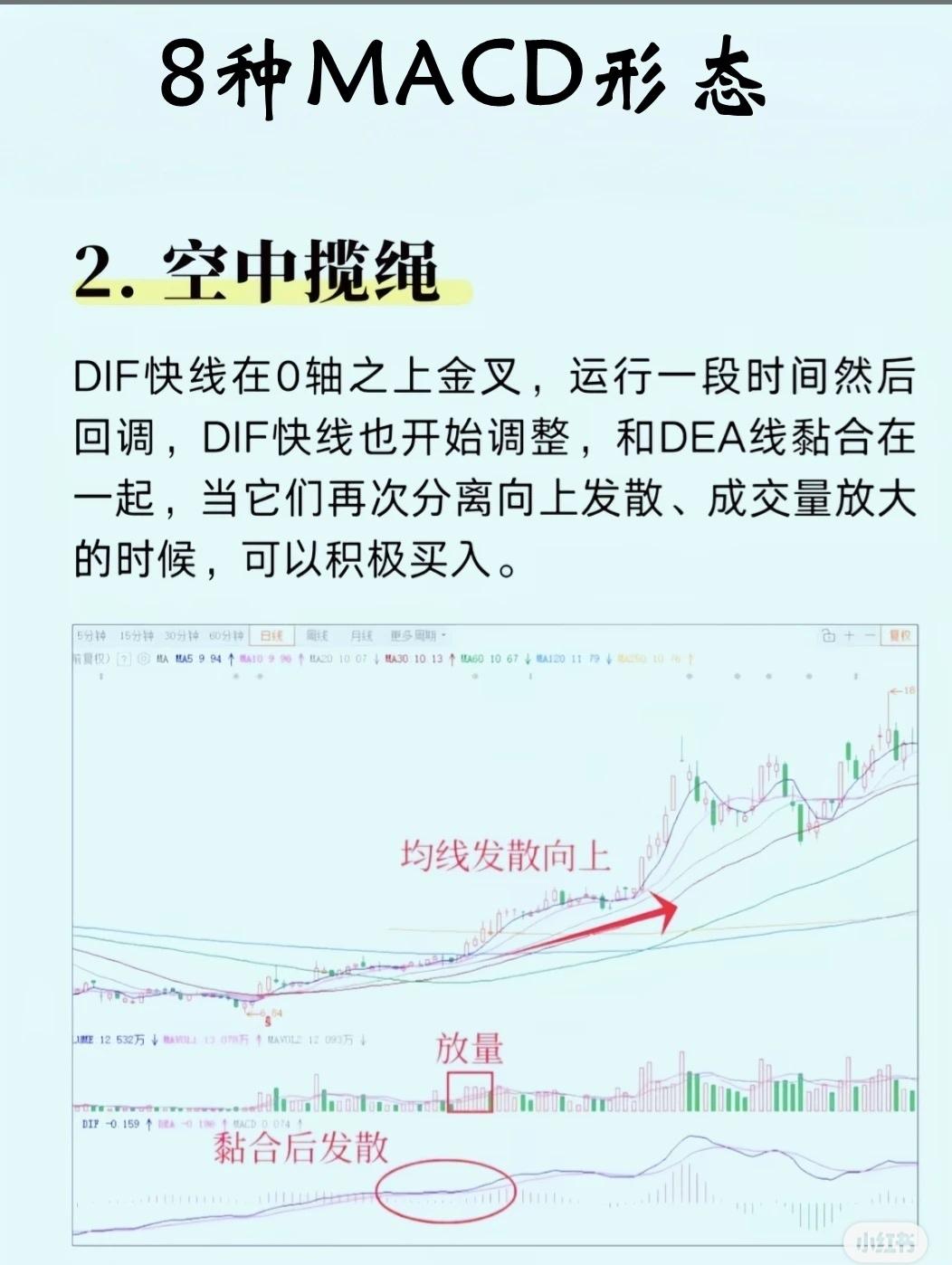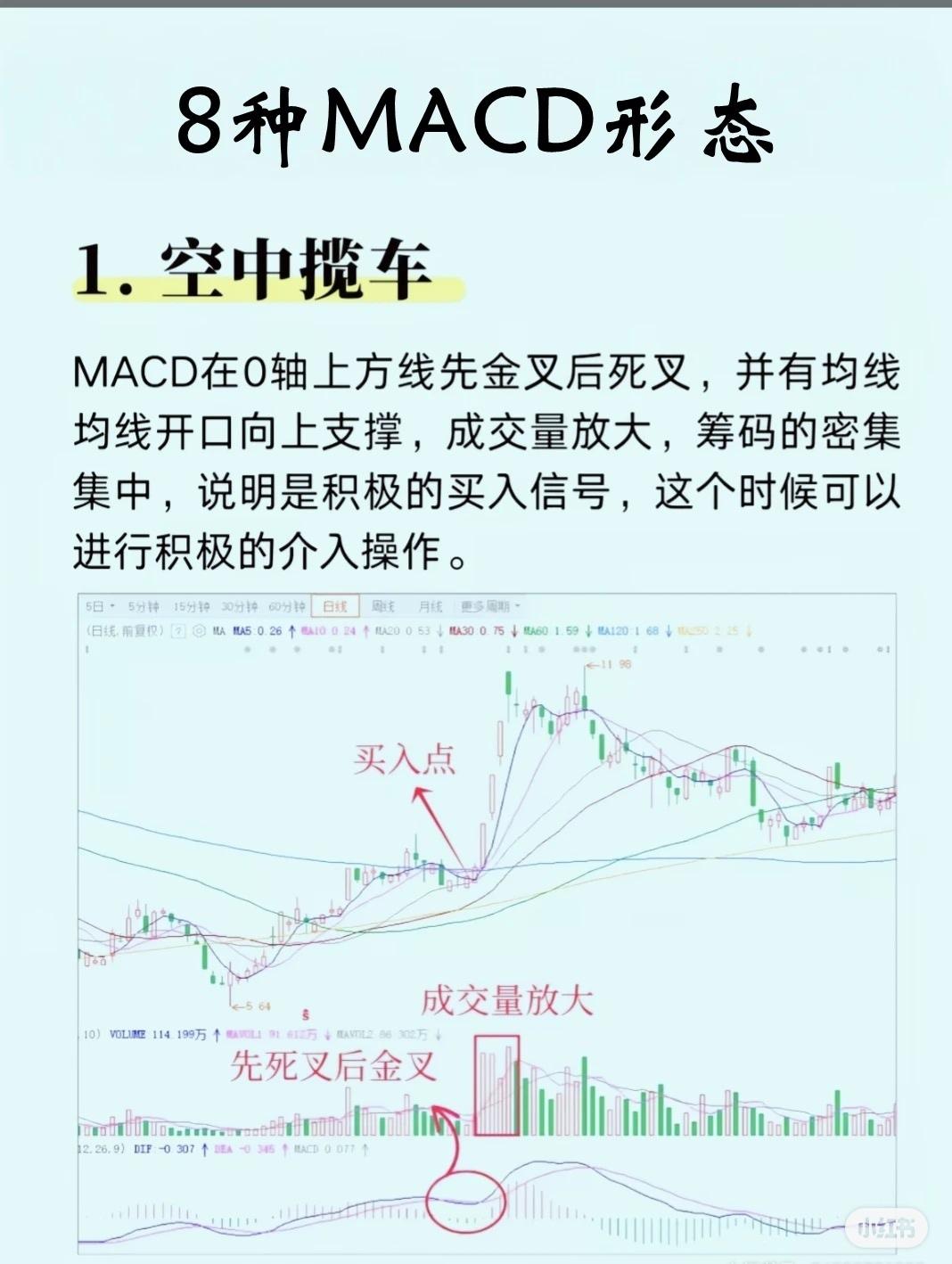 8种经典MACD形态特征与交易信号解析 1. 空中揽车 形态特征: MACD指标在0轴上方,DIF(快线)先上穿DEA(慢线)形成金叉,随后又死叉;但均线系统整体开口向上支撑,成交量显著放大,筹码呈密集集中状态。 交易信号: 这种“先金叉后死叉”的震荡洗盘形态,伴随均线支撑、量能放大、筹码集中,说明多头动能未竭,是积极买入信号,可择机介入。 2. 空中缆绳 形态特征: DIF快线在0轴上方先形成金叉并运行一段时间,随后回调(DIF与DEA同步调整),两者黏合后再次向上发散,同时成交量明显放大。 交易信号: 黏合后向上发散+放量,表明多头力量重启,是积极买入时机。 3. 海底捞月 形态特征: 前期股价经历深跌后,MACD拐头向上形成第一个金叉;之后在0轴下方再次出现金叉(“水下二次金叉”),同时量能持续放大。 交易信号: 深跌后二次金叉+放量,是底部反转的强信号,为优质介入时机。 4. 海底电缆 形态特征: MACD在0轴下方运行超过1个月(长期筑底),DIF下穿DEA形成金叉后,两线黏合成一线(数值接近);随后两线开始向上多头发散。 交易信号: 长期筑底+金叉后黏合再发散,释放趋势反转的积极信号,可关注买入。 5. 漫步青云 形态特征: 在远离0轴的区域先形成死叉(空头短暂发力),之后在0轴上方重新形成金叉,同时成交量放大。 交易信号: “远0轴死叉+0轴上方金叉”+放量,是趋势由弱转强的买点,可积极介入。 6. 天鹅展翅 形态特征: MACD在0轴下方金叉后回调,DIF向DEA靠拢,MACD红柱缩短但未死叉;随后DEA反转向上,MACD红柱再度加长。 交易信号: 回调不跌破死叉+红柱缩量后再度加长,形成“天鹅展翅”形态,是买入信号(尤其突破0轴时更优)。 7. 小鸭出水 形态特征: DIFF线在零轴以下先金叉DEA,但未上穿零轴即回落;随后DIFF下破DEA形成死叉,几天后再次金叉DEA,且股价处于相对低位、MACD出现底背离(股价新低但MACD未新低),同时红柱放大。 交易信号: 低位+二次金叉+底背离+红柱放大,是底部企稳的介入信号。 8. 佛手向上 形态特征: MACD先形成金叉,随股价上涨,DIF、DEA同步上升;回调后再次向上,且MACD柱线始终在0轴上方(未回落至0轴下)。 交易信号: 金叉后回调不跌破0轴+再度向上发散,是趋势延续的买入时机(可在DIF再次上升时介入)。 总结 这8种MACD形态均围绕“金叉/死叉的节奏变化”“0轴上下位置”“量能配合”“均线支撑”等核心逻辑展开,本质是捕捉多头动能的启动、延续或反转信号。交易中需结合股价位置、趋势、量能等多维度验证,提高信号有效性。