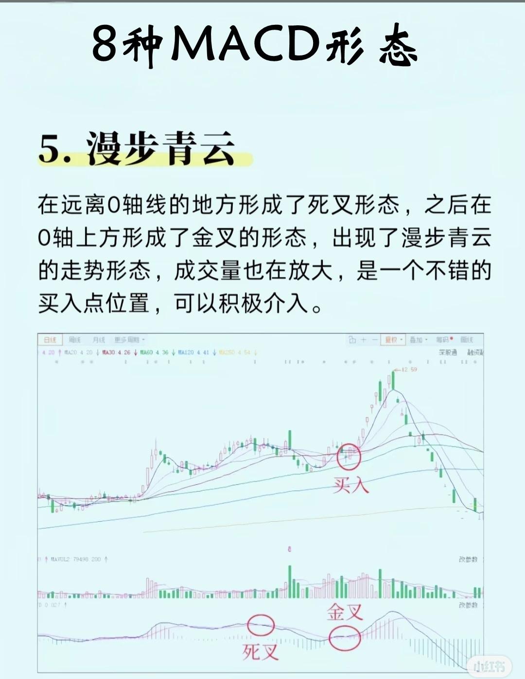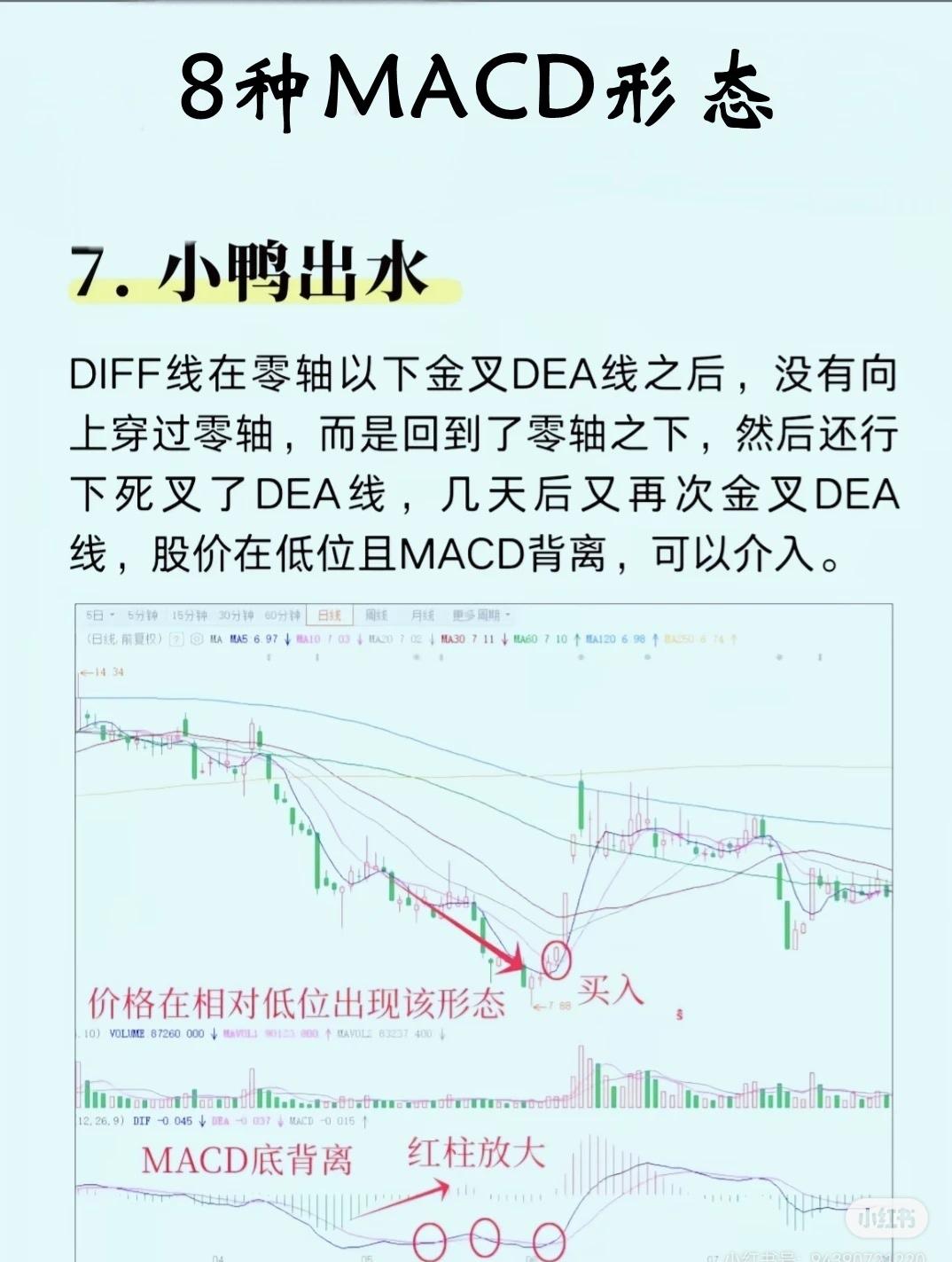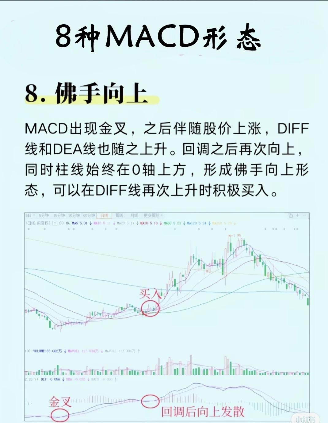 8种经典MACD形态特征与交易信号解析 1. 空中揽车 形态特征: MACD指标在0轴上方,DIF(快线)先上穿DEA(慢线)形成金叉,随后又死叉;但均线系统整体开口向上支撑,成交量显著放大,筹码呈密集集中状态。 交易信号: 这种“先金叉后死叉”的震荡洗盘形态,伴随均线支撑、量能放大、筹码集中,说明多头动能未竭,是积极买入信号,可择机介入。 2. 空中缆绳 形态特征: DIF快线在0轴上方先形成金叉并运行一段时间,随后回调(DIF与DEA同步调整),两者黏合后再次向上发散,同时成交量明显放大。 交易信号: 黏合后向上发散+放量,表明多头力量重启,是积极买入时机。 3. 海底捞月 形态特征: 前期股价经历深跌后,MACD拐头向上形成第一个金叉;之后在0轴下方再次出现金叉(“水下二次金叉”),同时量能持续放大。 交易信号: 深跌后二次金叉+放量,是底部反转的强信号,为优质介入时机。 4. 海底电缆 形态特征: MACD在0轴下方运行超过1个月(长期筑底),DIF下穿DEA形成金叉后,两线黏合成一线(数值接近);随后两线开始向上多头发散。 交易信号: 长期筑底+金叉后黏合再发散,释放趋势反转的积极信号,可关注买入。 5. 漫步青云 形态特征: 在远离0轴的区域先形成死叉(空头短暂发力),之后在0轴上方重新形成金叉,同时成交量放大。 交易信号: “远0轴死叉+0轴上方金叉”+放量,是趋势由弱转强的买点,可积极介入。 6. 天鹅展翅 形态特征: MACD在0轴下方金叉后回调,DIF向DEA靠拢,MACD红柱缩短但未死叉;随后DEA反转向上,MACD红柱再度加长。 交易信号: 回调不跌破死叉+红柱缩量后再度加长,形成“天鹅展翅”形态,是买入信号(尤其突破0轴时更优)。 7. 小鸭出水 形态特征: DIFF线在零轴以下先金叉DEA,但未上穿零轴即回落;随后DIFF下破DEA形成死叉,几天后再次金叉DEA,且股价处于相对低位、MACD出现底背离(股价新低但MACD未新低),同时红柱放大。 交易信号: 低位+二次金叉+底背离+红柱放大,是底部企稳的介入信号。 8. 佛手向上 形态特征: MACD先形成金叉,随股价上涨,DIF、DEA同步上升;回调后再次向上,且MACD柱线始终在0轴上方(未回落至0轴下)。 交易信号: 金叉后回调不跌破0轴+再度向上发散,是趋势延续的买入时机(可在DIF再次上升时介入)。 总结 这8种MACD形态均围绕“金叉/死叉的节奏变化”“0轴上下位置”“量能配合”“均线支撑”等核心逻辑展开,本质是捕捉多头动能的启动、延续或反转信号。交易中需结合股价位置、趋势、量能等多维度验证,提高信号有效性。