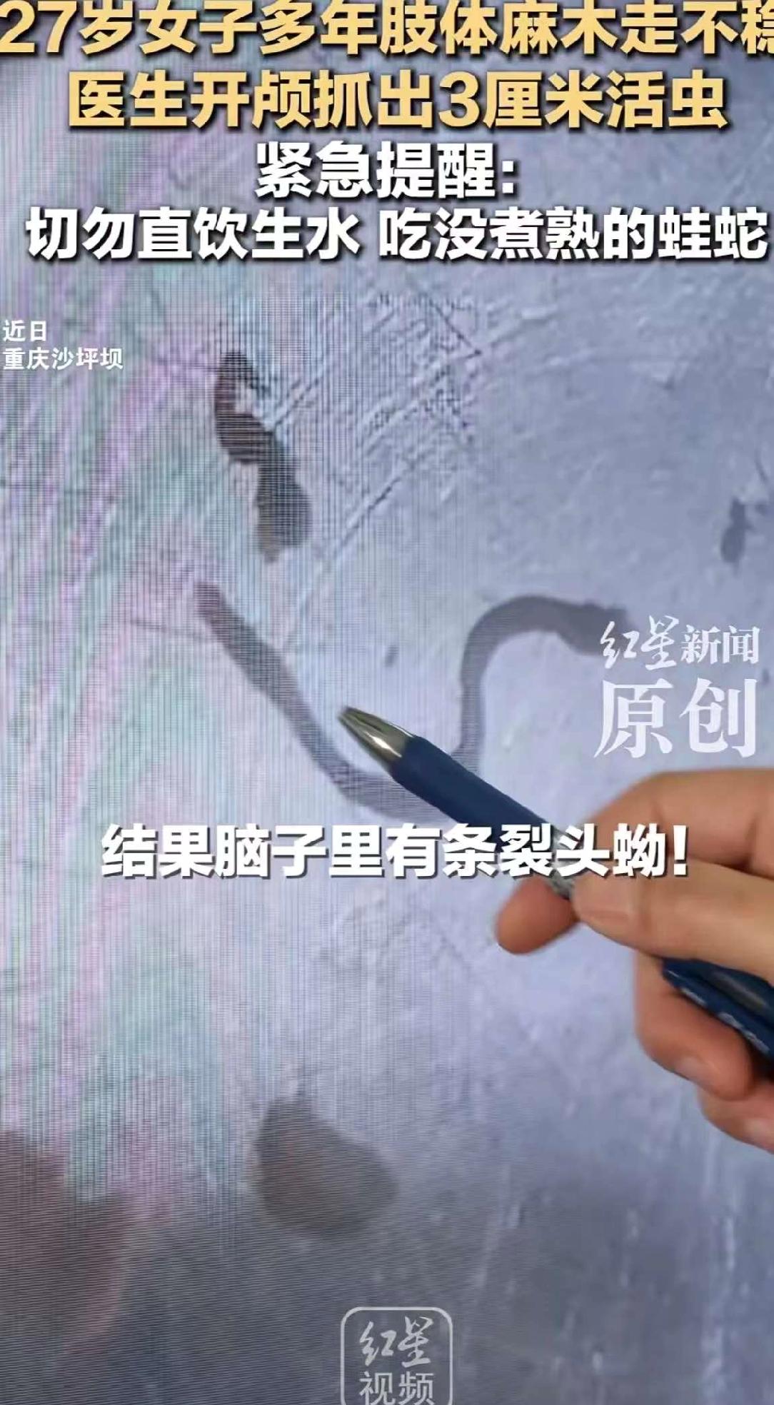 重庆一女子,头疼了5年。 跑遍大医院,医生都说可能是脑瘤。 结果开颅后,取出来的东西,把在场医生都看愣了——医生从患者脑部取出一条长约3厘米的裂头蚴,虫子取出时仍有活动迹象 重庆一名女子被头疼症状困扰五年,期间前往多家大型医院检查,多次被诊断疑似脑瘤,也按相关病症进行治疗,却始终没有好转,还陆续出现手麻、腿麻、面部歪斜、视物重影等不适,生活受到不小影响。 后续医生梳理她历年的脑部检查影像,发现了异常之处:其脑部病灶位置并非固定,2021年检查时在左侧,2022年转移至右侧,之后又移动到头顶部位,据此判断,这并非肿瘤,大概率是寄生虫感染。 这便是导致她五年不适的原因。裂头蚴易寄生在人体脑部、眼部等部位,且会在组织内移动,早期症状与脑部炎症、肿瘤相似,临床误诊率相对较高,达到57.7%,部分患者因误诊用药,还会影响病情。 经了解,该女子感染寄生虫,并非食用生鱼片或接触蛙类,而是小时候在农村生活时,直接饮用未煮沸的井水、生水,不慎摄入寄生虫卵,虫卵在体内发育后,进入脑部存活多年,逐步引发各类症状。 生活中,不少人存在饮用生水、食用未彻底煮熟食物的习惯,还抱有侥幸心理,认为偶尔为之不会有问题,也有人觉得生食搭配调料可杀灭病菌,实际上这类方式无法有效清除寄生虫卵,存在健康风险。 寄生虫感染带来的身体损伤较为持久,预防的关键在于养成良好的卫生习惯,日常饮用烧开的水,食材彻底煮熟后再食用,从源头规避感染风险,远比事后治疗更重要。