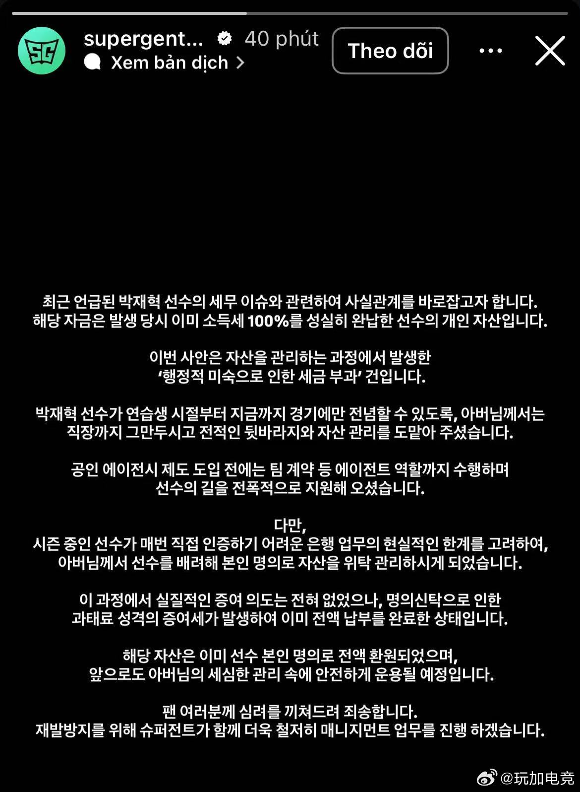 最近就朴载赫选手被曝出的税务问题及相关内容,我们特此进行事实说明。该笔资金在发生当时,已100%如实申报为选手的个人资产。本次事件是在管理资产的过程中,因“行政失误” 导致的税务征收问题。从朴载赫选手成为练习生至今,为了让他能全身心投入比赛,他的父亲甚至辞掉了工作,一直全力支持他并协助管理资产。在引入经纪人制度之前,父亲还承担了战队合约等电竞相关工作,全方位支持选手的发展。但是,考虑到现役选手本人直接处理复杂的银行业务存在现实困难,父亲便以选手的名义接管了资产并进行管理。在此过程中,虽然不存在任何实质上的逃税意图,但因名义信托 导致的过失,被认定存在逃税嫌疑,目前已完成全部补缴。相关资产已全部转回选手本人名下,今后也将在父亲的细致管理下安全运营。向各位粉丝致以诚挚的歉意。为了防止再发生,我们将携手,更加细致地做好管理工作。