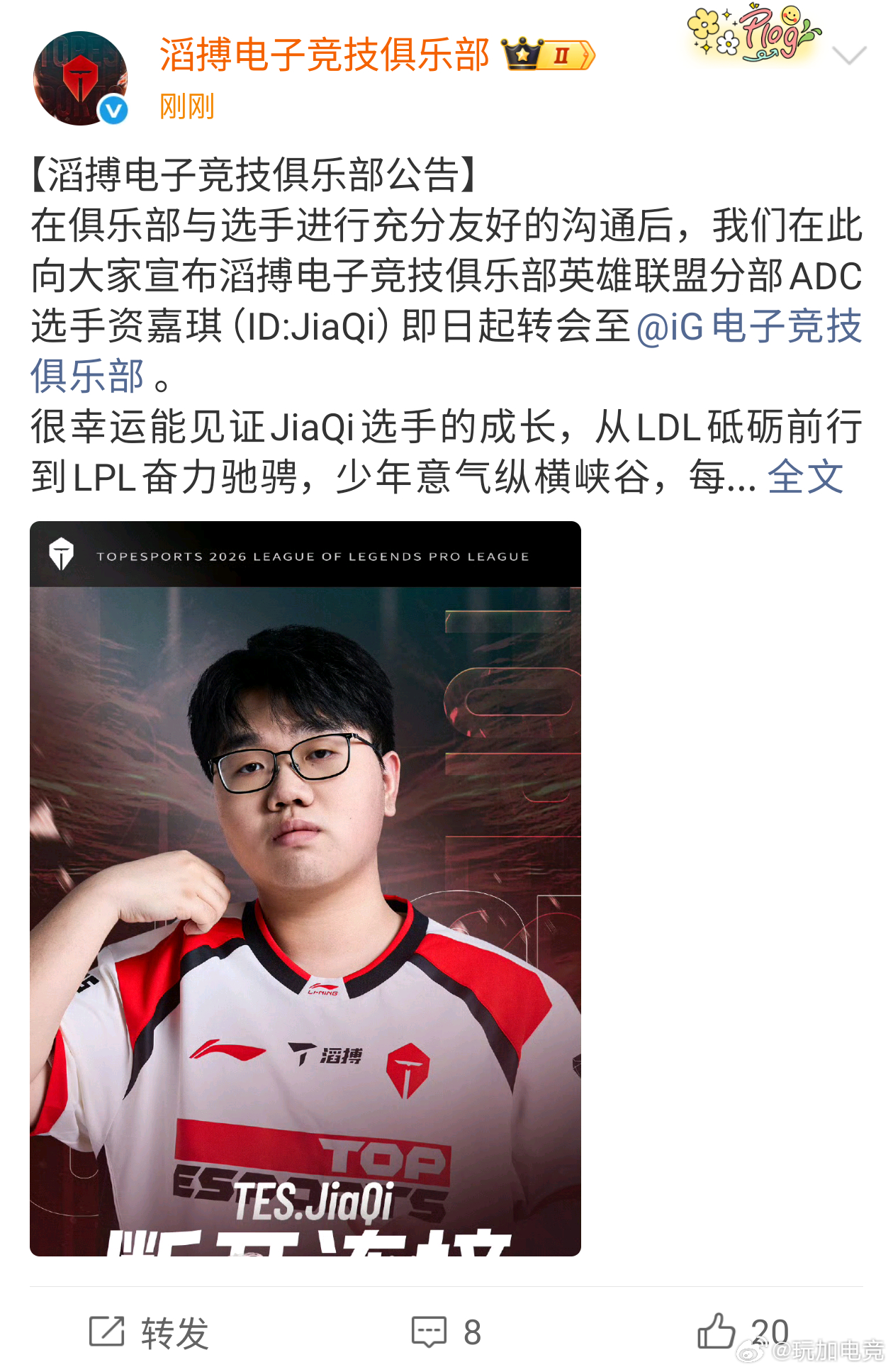 TES官宣JiaQi转会至iG