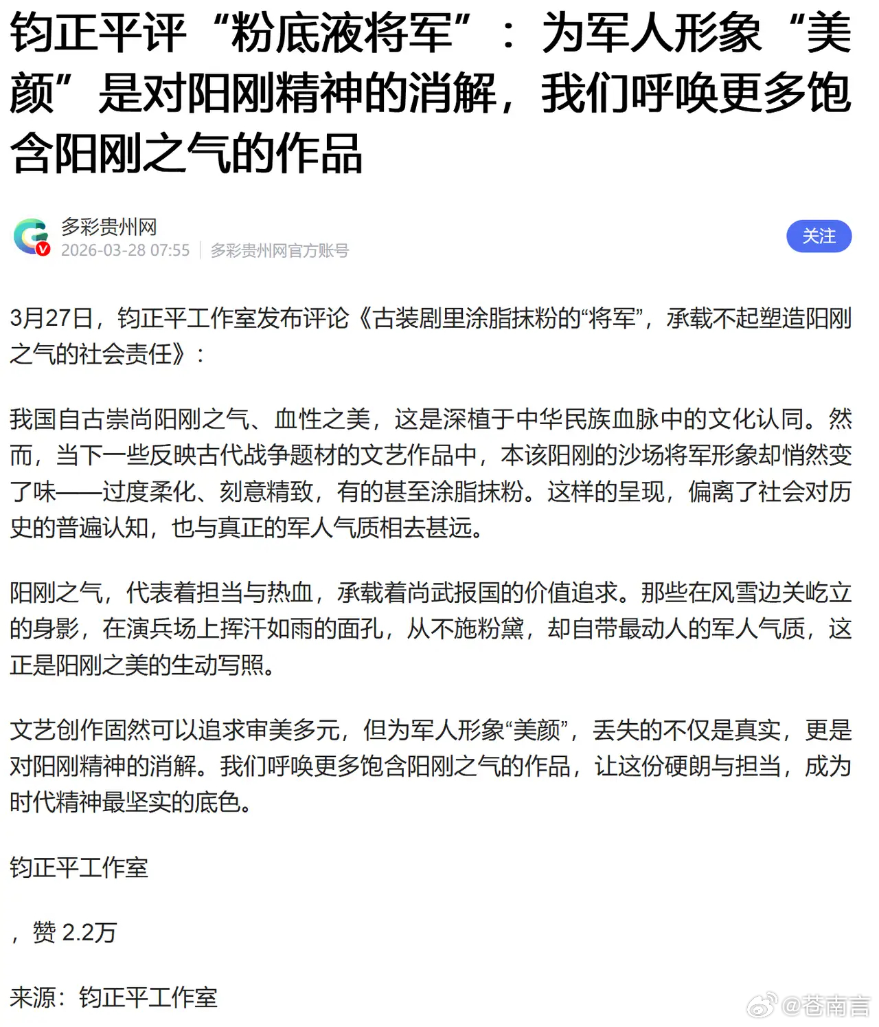 钧正平评粉底液将军这种阴柔美其实是一种文化殖民,从日韩传进来的,在国内借助某平台发扬光大,这次难得民意也发生了逆转,正好借着机会,重拳整顿。把中国年轻人的审美纠正回来。
