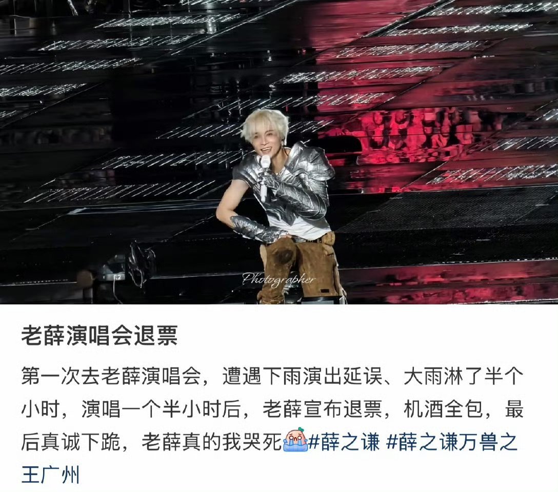 薛之谦广州演唱会大暴雨,灯光全瘫、荧光棒失灵、机器都停摆了老薛当场直接中止演出,还直接全额退票、外地歌迷机酒全报销,我真的会哭🥹