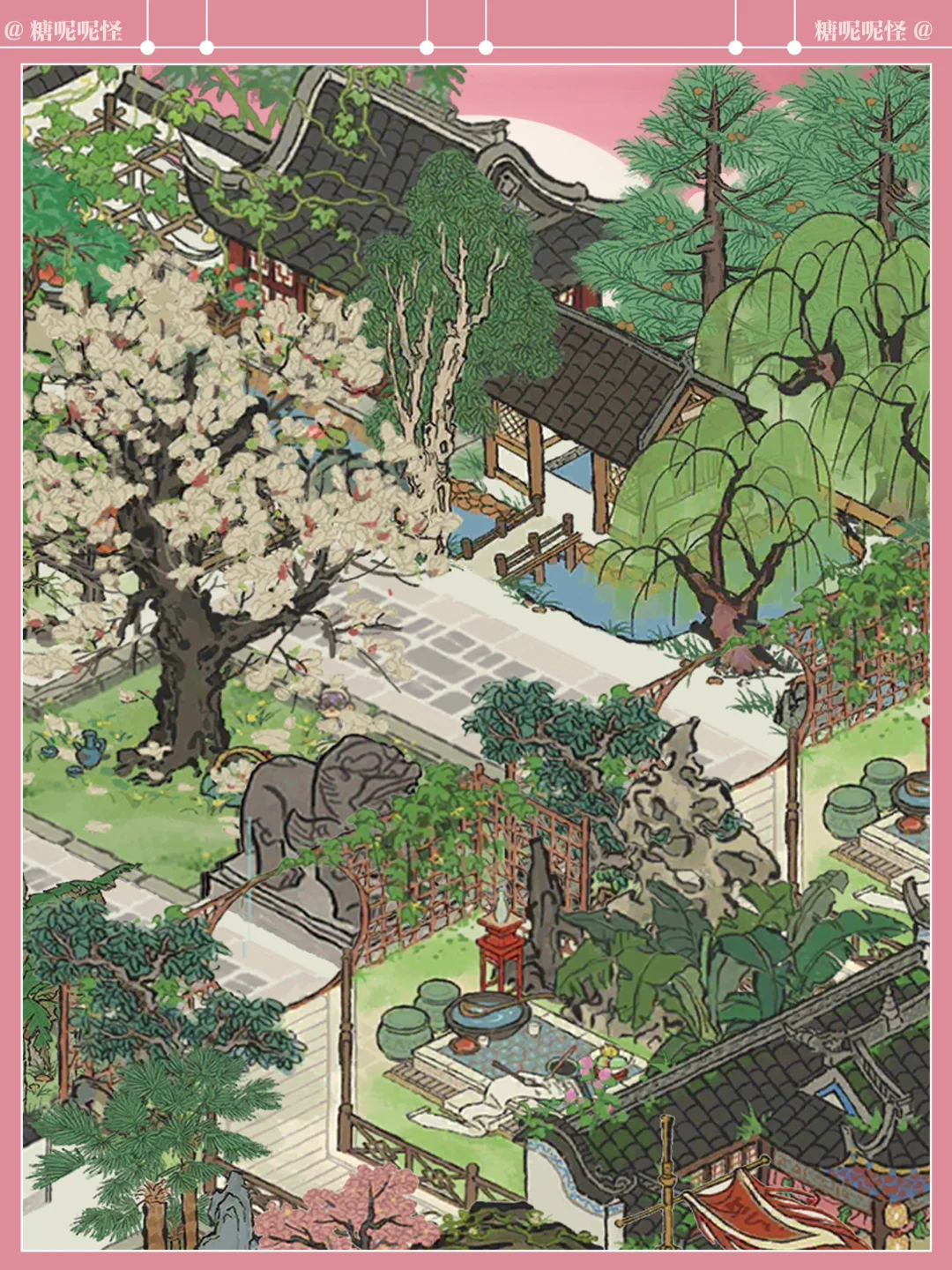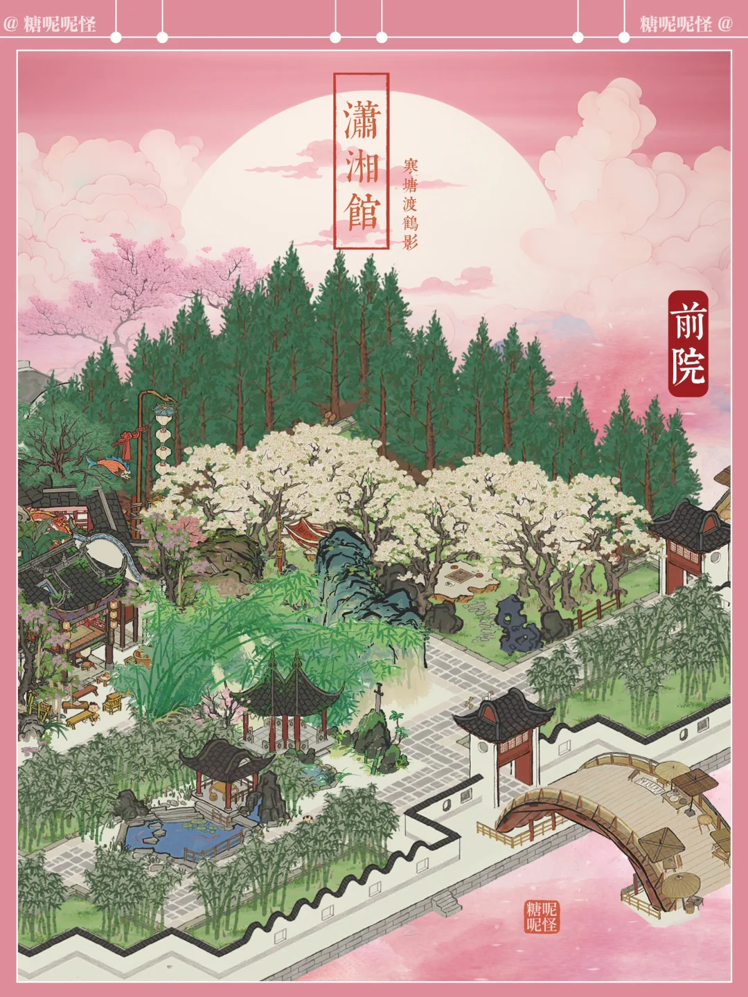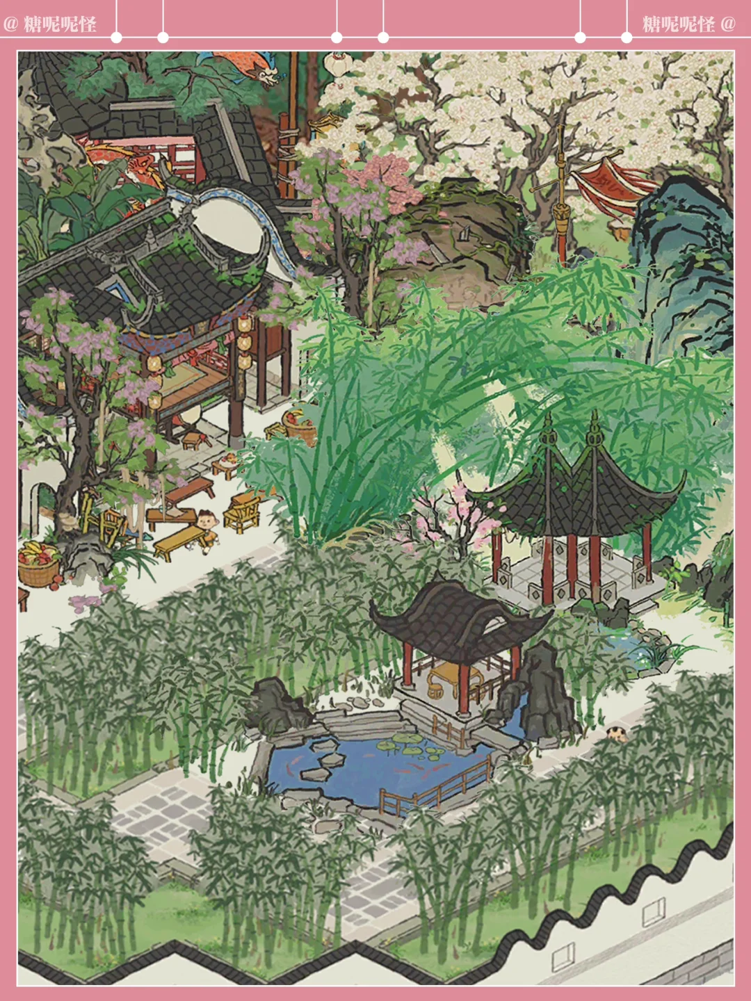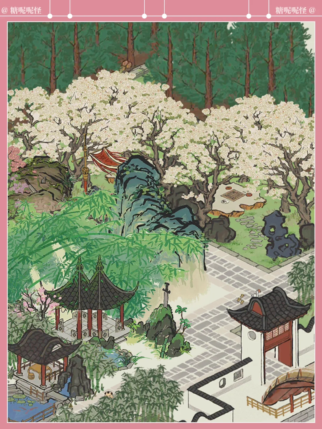浅浅复刻一个黛玉的潇湘馆吧,曹公在书里这样写潇湘馆:"忽抬头见前面一带粉垣(白墙),数楹修舍,有千百杆翠竹掩映……出去则是后院,有大株梨花兼具着芭蕉。又有两间小小退步。后院墙下忽开一隙,得泉一派,开沟仅尺许,灌入墙内,绕阶缘屋至前院,盘旋竹下而出……"