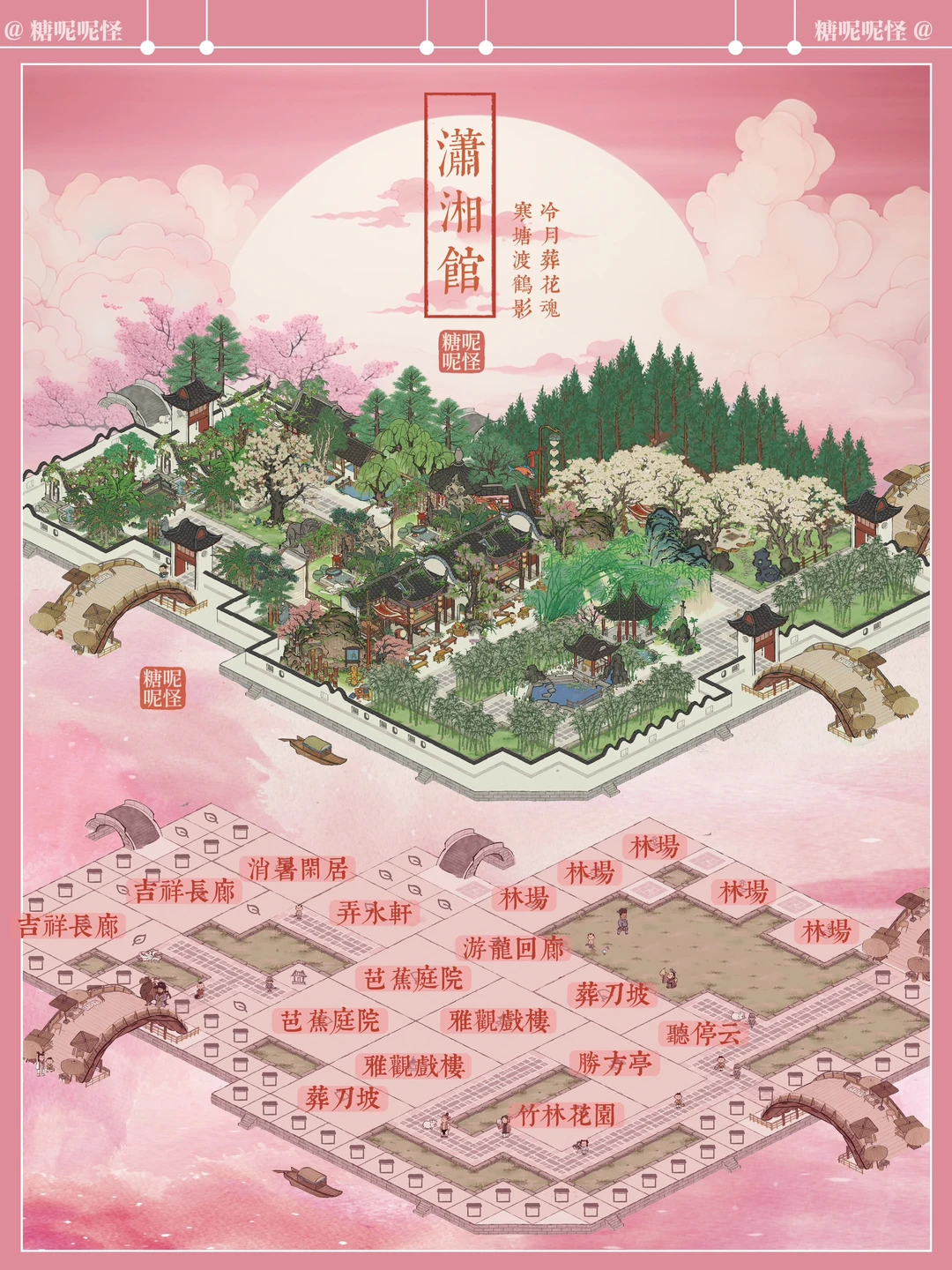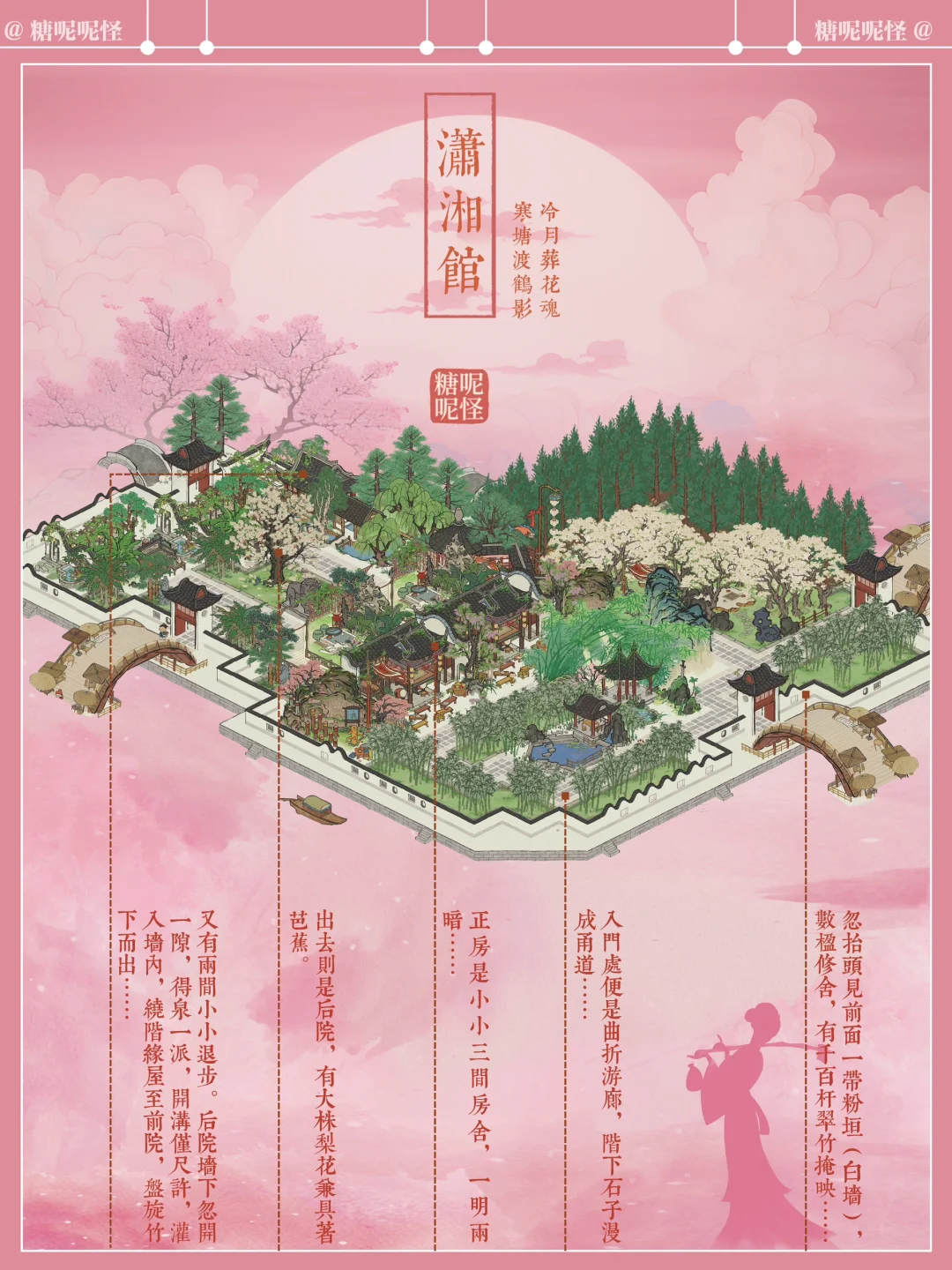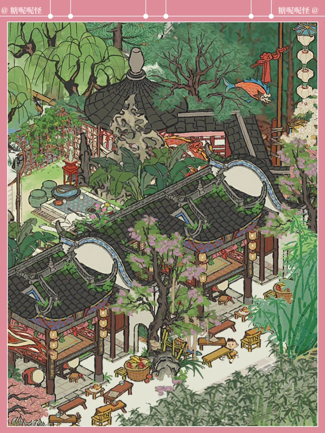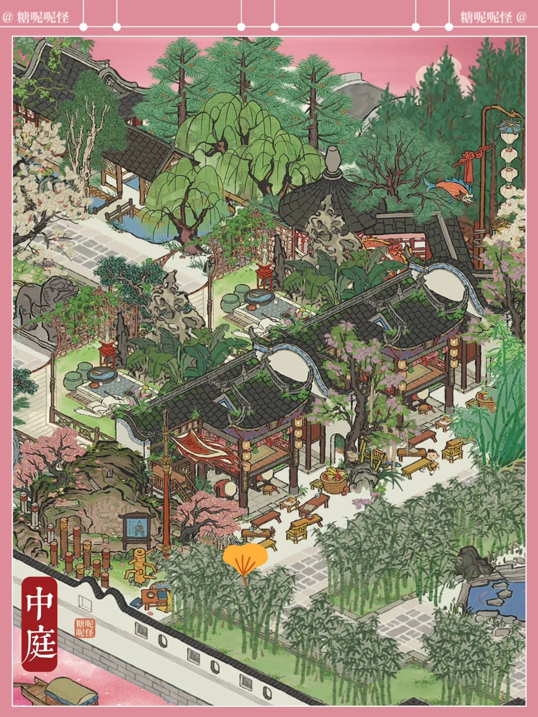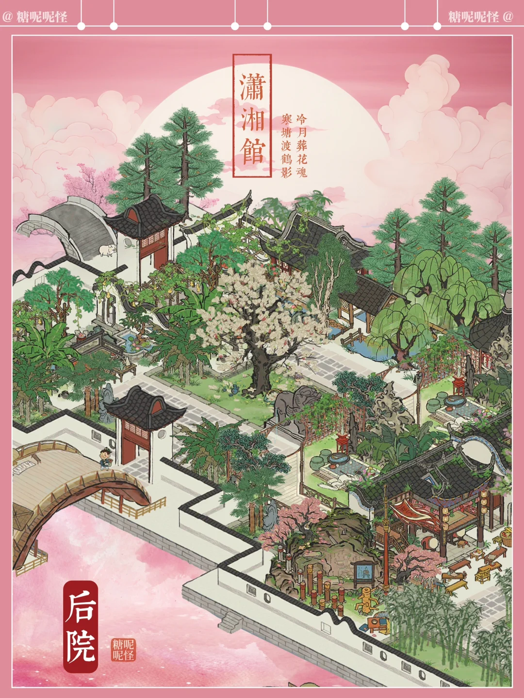 浅浅复刻一个黛玉的潇湘馆吧,曹公在书里这样写潇湘馆:"忽抬头见前面一带粉垣(白墙),数楹修舍,有千百杆翠竹掩映……出去则是后院,有大株梨花兼具着芭蕉。又有两间小小退步。后院墙下忽开一隙,得泉一派,开沟仅尺许,灌入墙内,绕阶缘屋至前院,盘旋竹下而出……"