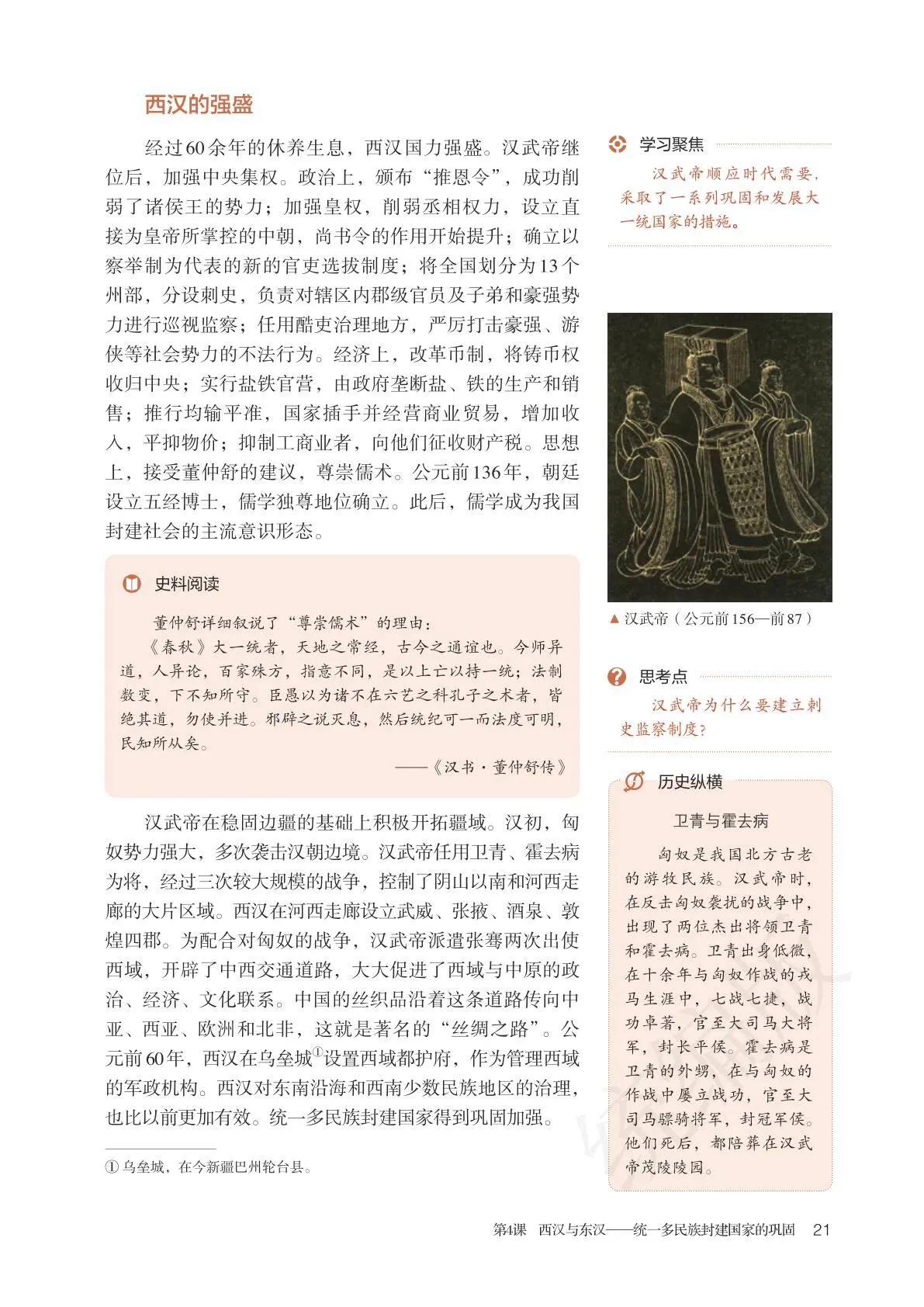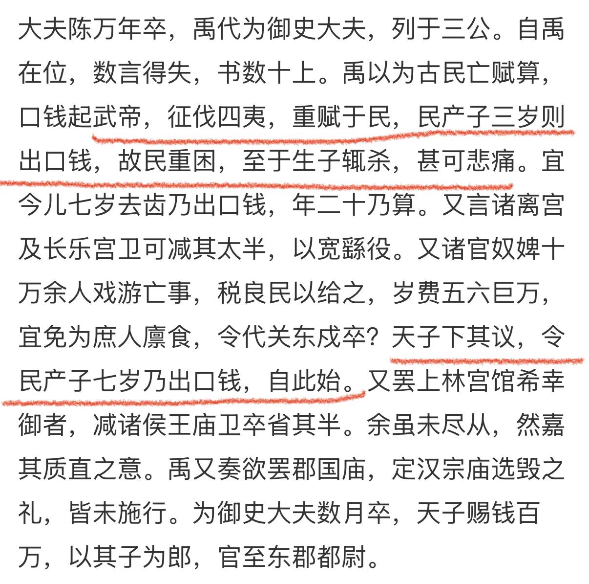 教科书对汉武帝的内政集权和开拓疆域甚为赞赏,对汉武帝时的民众生活状态只字未提。按逻辑推理,汉武帝既然如此成功,民众生活也应该滋润起来。 那真实情况怎样呢?贡禹是汉元帝时御史大夫,他跟汉元帝明言:“武帝四处征伐,加重百姓赋税,孩子三岁就要交口钱,百姓极度困苦,竟到了生下孩子就杀死的地步。”(《汉书·贡禹传》) 汉元帝是汉武帝的曾孙,贡禹没任何理由对着汉元帝编造谎言诋毁汉武帝的政绩,而且汉元帝也没有认为贡禹是在说谎。因为汉元帝不但没治贡禹的罪,还采纳了贡禹的建议,把口钱起征年龄改到了七岁。 依此逻辑,贡禹对汉武帝的民众生活描述是真实的。也就是说,汉武帝的开心是建立在民众的极度痛苦上的。这样的皇帝,跟隋炀帝有什么区别呢?历史 汉武帝