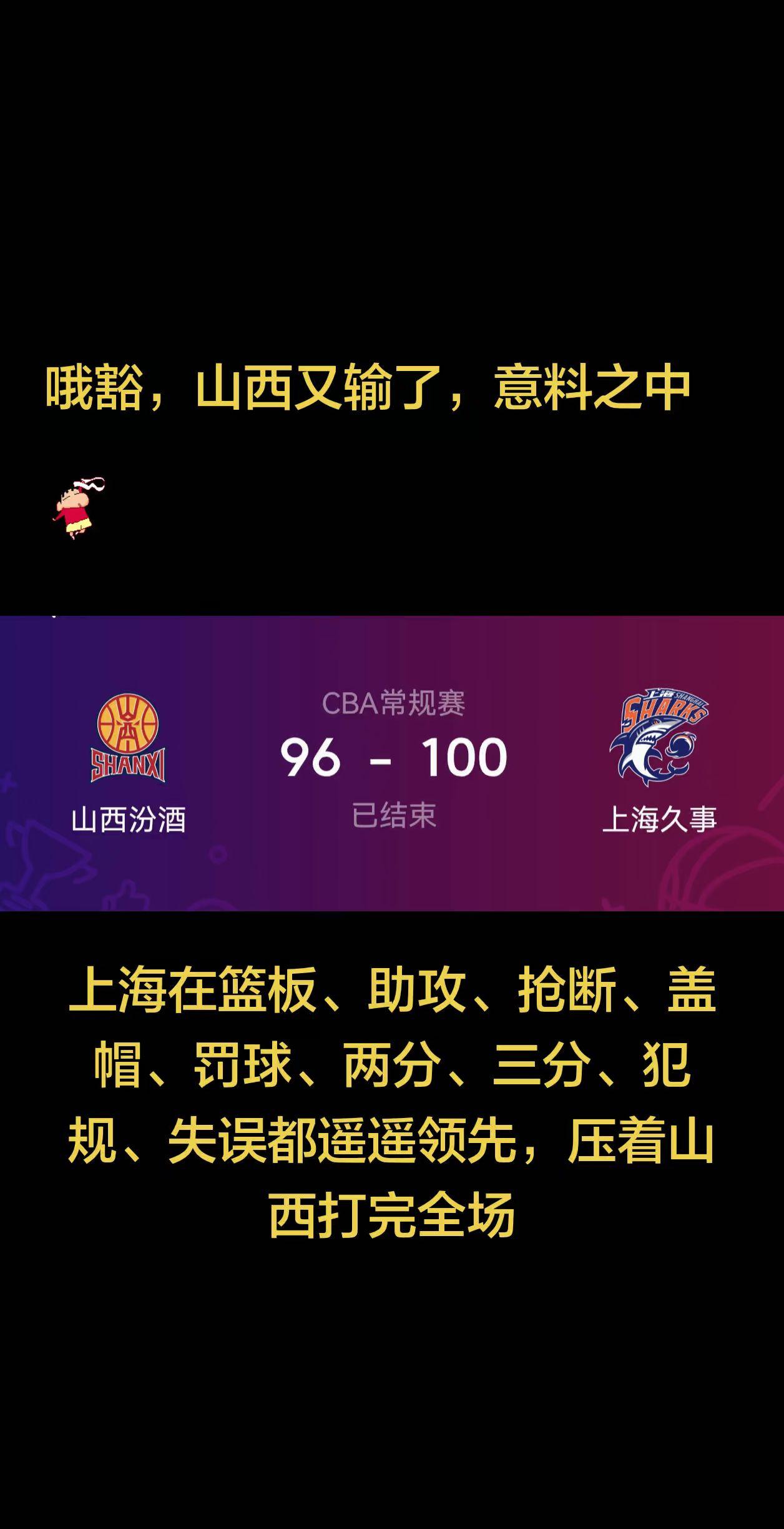上海在篮板、助攻、抢断、盖帽、罚球、两分、三分、犯规、失误都遥遥领先,压着山西打完全场 山西再输上海