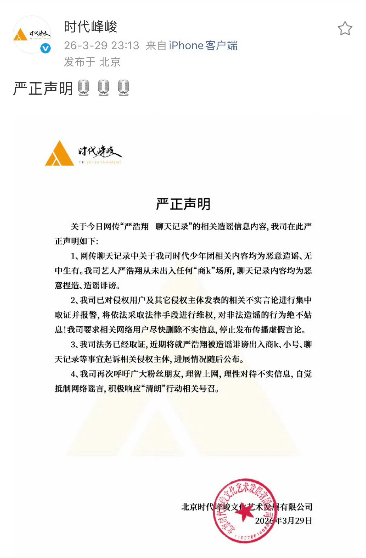 时代峰峻声明来了。歌是Fly,谣言也赶紧Fly一下。严浩翔时代峰峻否认网传聊天记