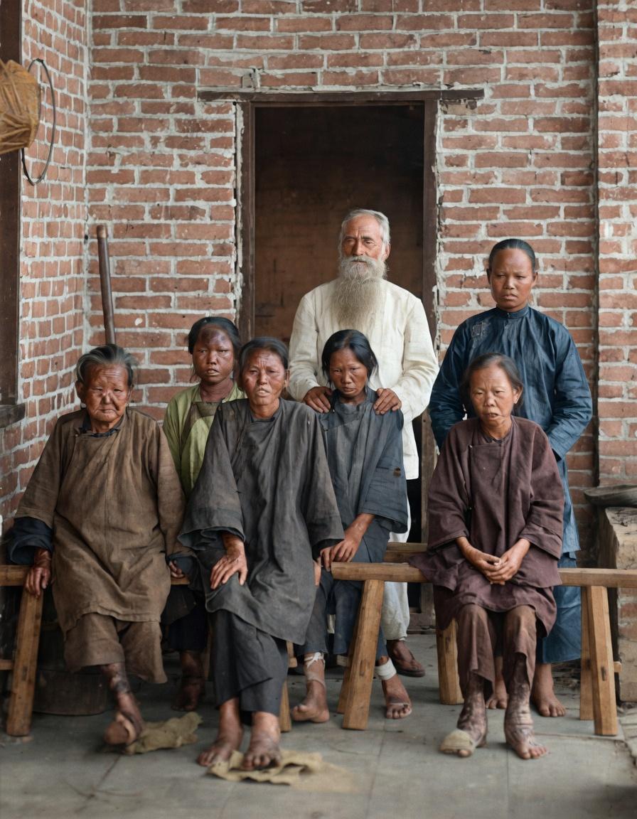 晚清,红砖砌成的简陋病院门口,一位留着长长白胡须的西方传教士医生,身着洁净的白色长衫,双手轻轻搭在身前女患者的肩上,目光沉静而悲悯。 他面前的木凳上,坐着几位面容枯槁的年长女性——她们是麻风病患者,衣衫褴褛,赤着布满溃疡与残缺的双脚,面部因疾病留下难以磨灭的痕迹,眼睑变形、鼻唇损毁,肢体也带着病痛的烙印。她们或垂首,或木然望向镜头,眼神里是长期被隔离、被歧视的麻木,也藏着对一丝温情的微弱接纳。