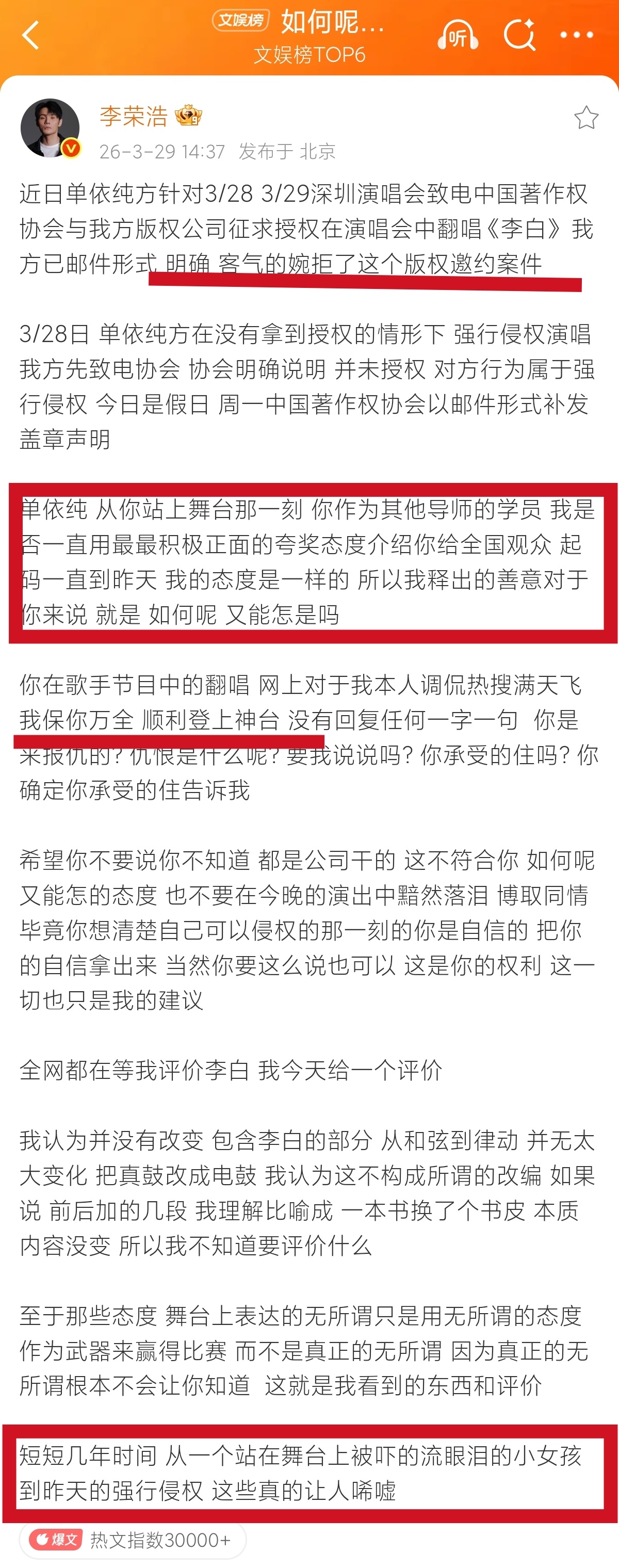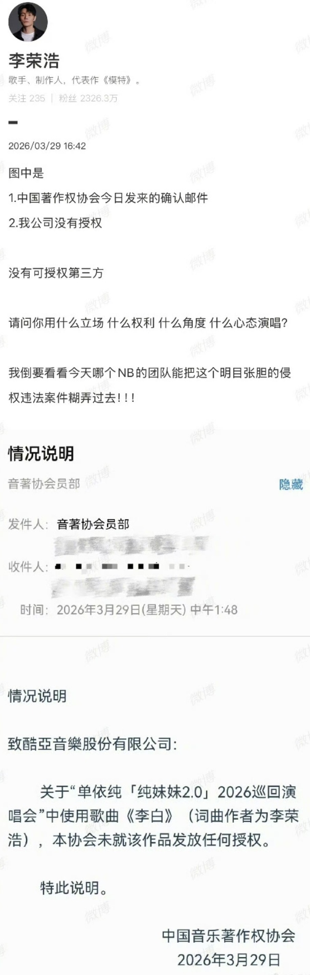 李荣浩4连质问单依纯支持李荣浩合法维权,一点错都没有!先把核心事实摆清楚:单依纯团队提前通过音著协和李荣浩版权方,申请商业演唱会演唱《李白》的授权,被明确、客气地婉拒,音著协也已经盖章确认,从未给过任何授权。可即便如此,单依纯依旧在深圳演唱会上,强行演唱了这首李荣浩的原创作品,这就是实打实的商业侵权,没有任何模糊空间。原创音乐人有多不容易,大家有目共睹。李荣浩从词曲创作到编曲制作,一手打造出《李白》这首经典作品,倾注的心血、时间和精力,是这首歌最珍贵的价值。版权就是原创的生命线,每一位创作者的劳动成果,都该被尊重、被保护,这是音乐行业最基本的规则,也是法律明确规定的底线。有人说没必要这么较真,不就是唱首歌吗?大错特错!商业演唱会是盈利性质的演出,未经授权演唱他人原创作品,本质上就是无视创作者的合法权益,无视行业规则。如果人人都这样,想唱就唱、无视授权,那以后谁还愿意静下心来创作原创音乐?音乐行业的良性发展又从何谈起?早前单依纯参加节目时,他也曾公开认可、给予鼓励,即便之前有改编争议,他也选择包容。“请问你用什么立场、什么权利、什么角度、什么心态演唱”,原创不易,版权无价。