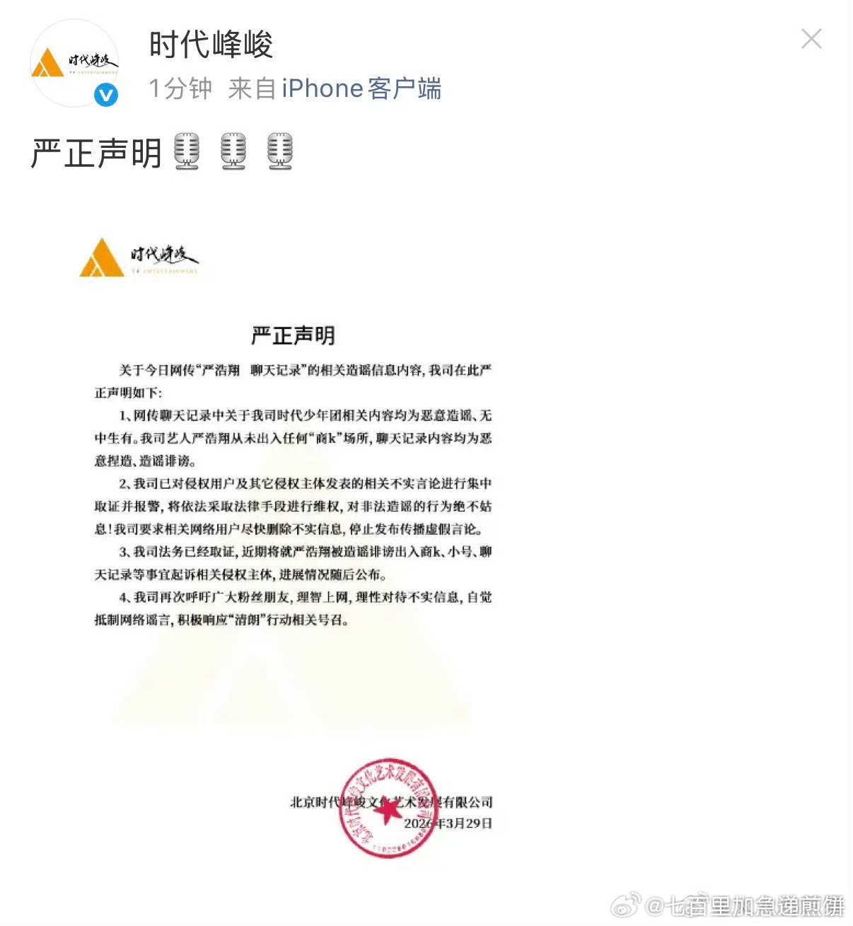 时代峰峻发声明回应,严浩翔从未出入任何商k场所,公司已取证。时代峰峻否认网传聊天
