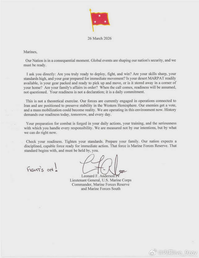 美国海军陆战队中将,海军陆战队预备役及海军陆战队南方司令部司令在两天前向美国海军陆战队预备役人员发出的动员信: