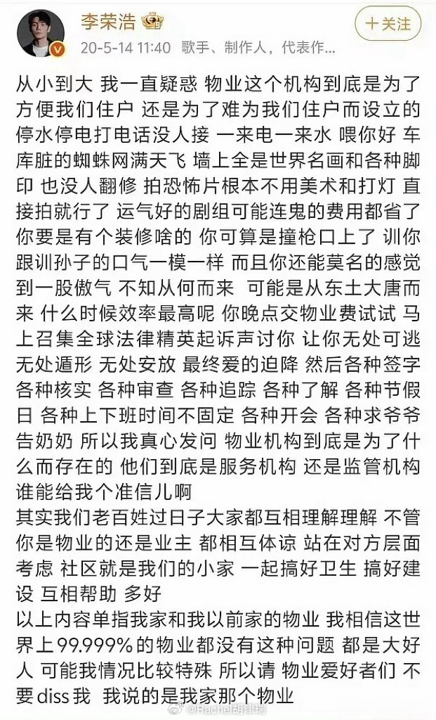 李荣浩骂物业 传世经典内娱少见的活人感