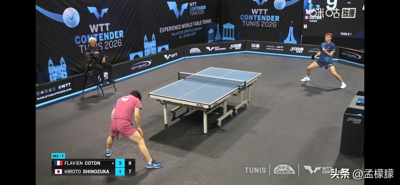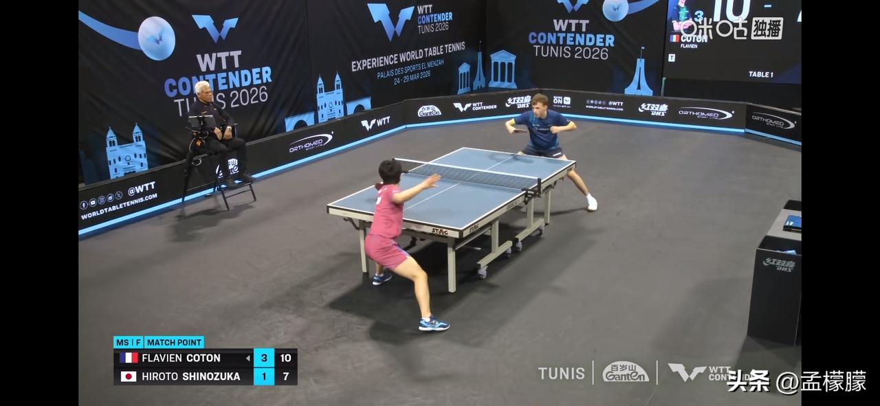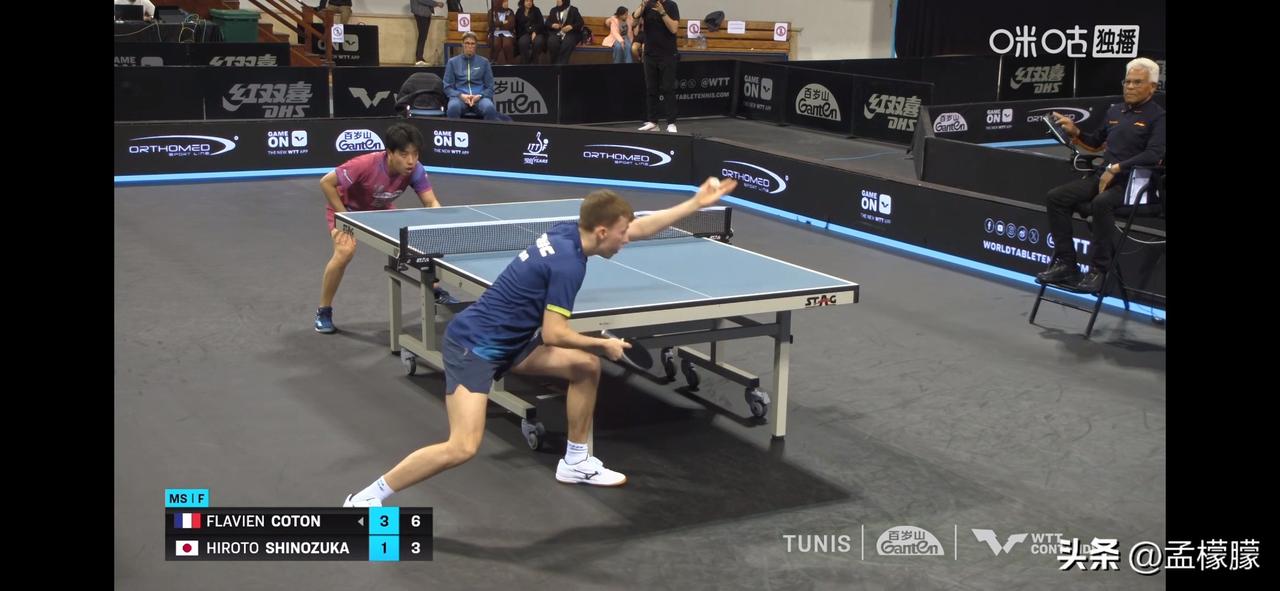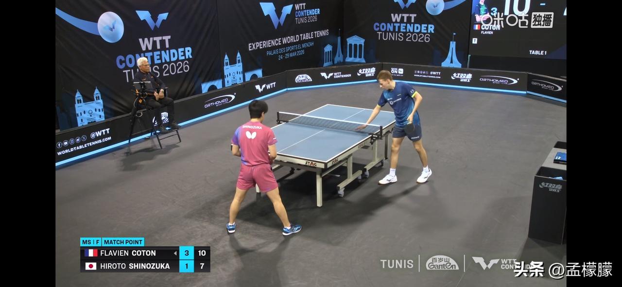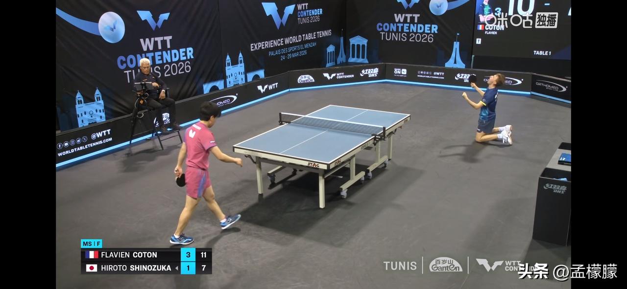 男单决赛,法国小将科顿4-1战胜日本篠塚大登,夺得冠军。 弗拉芬·科顿(FRA)4-1篠塚大登(JPN)【5-11,11-8,11-9,12-10,11-7】 弗拉芬·科顿夺得冠军,篠塚大登获得亚军。 乒乓球 WTT常规挑战赛突尼斯站 WTT突尼斯赛