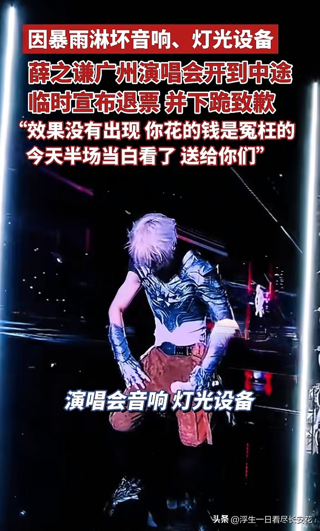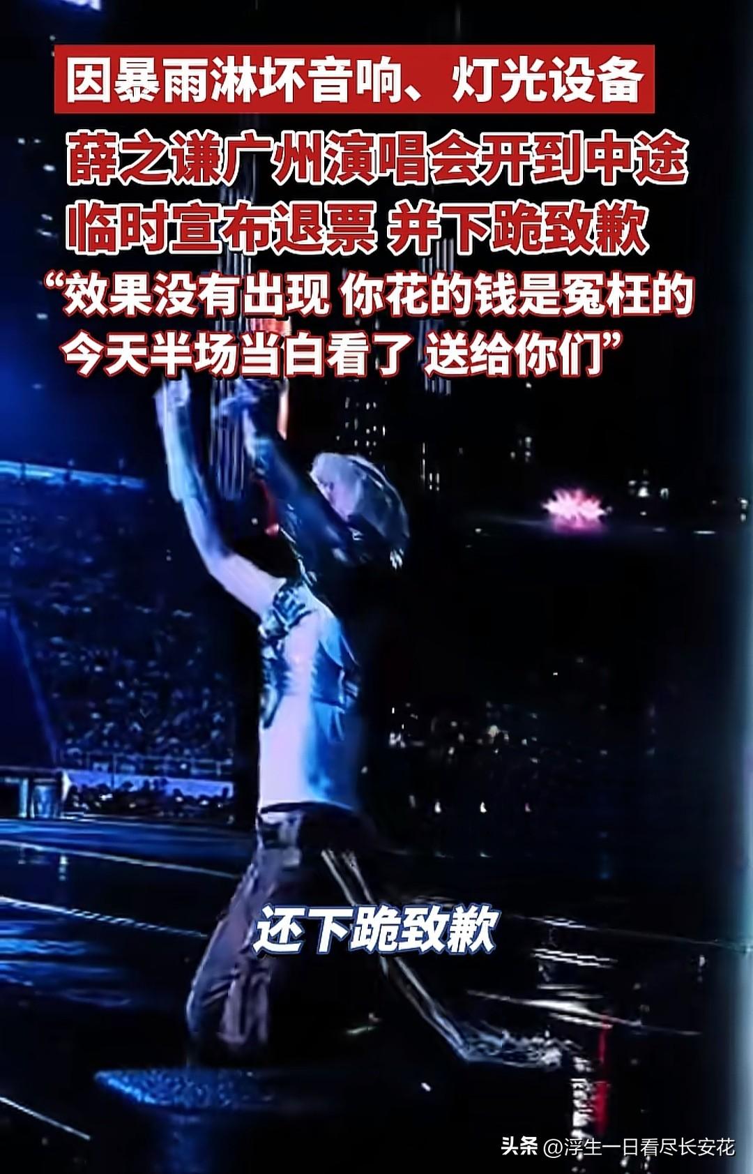 薛之谦广州演唱会因暴雨设备故障中途退票下跪致歉,单场损失或超千万! 薛之谦广州演唱会遭遇突发暴雨,音响、灯光设备被淋坏无法正常运转,演出进行到中途被迫叫停,他当场宣布全额退票并下跪向观众致歉,直言观众花钱没享受到完整效果很冤枉,这场突发状况让薛之谦及其团队面临巨额经济损失,单场损失保守估算或超千万元。 从演唱会筹备与运营成本来看,这场突如其来的退票决定,直接让前期所有投入都打了水漂。户外大型演唱会的场地租赁、舞台搭建、灯光音响设备采购与调试、安保人员配置、后勤保障等基础成本,本身就是一笔庞大开销,少则数百万,多则近千万。暴雨不仅毁掉了现场设备,这些已经支出的固定成本无法收回,相当于前期所有的人力物力投入全部付诸东流,光是这部分基础损耗,就足以让团队承受巨大压力。 再看票务收入的直接损失,广州演唱会的场地规模较大,薛之谦作为顶流歌手,门票几乎是一票难求,从低价看台票到高价内场票,整场演出的票务营收本应是千万级别。而他选择全额退票,意味着这笔本该到手的核心收入全部归零,相当于白忙活一场,没有任何票务收益进账,这是此次损失中最直观、占比最大的一部分。 除此之外,还有诸多隐性成本不容忽视。临时叫停演出后的善后工作,需要团队投入大量人力处理退票流程、安抚观众情绪、协调场地与设备方后续事宜,这些额外的人力成本与时间成本,都是无形的损耗。同时,被暴雨损毁的专业音响、灯光设备大多价格昂贵,维修或重新购置又要额外花费一笔资金,进一步加重了损失。 但比起金钱上的损失,薛之谦的担当更让人动容。在设备故障、演出无法继续的尴尬局面下,他没有找借口推诿,没有敷衍了事,而是放下身段下跪致歉,坦诚承认观众的消费不值,主动承担所有责任选择全额退票。这份不敷衍、不甩锅的真诚,在当下娱乐圈实属难得,比起千万损失,他守住了对粉丝的尊重与作为艺人的底线。 很多观众也被他的诚意打动,即便没能看完完整演出,也没有过多抱怨,反而心疼他在暴雨中坚持演出、诚恳致歉的模样。一场意外的暴雨,毁掉了一场精心筹备的演出,却也让大家看到了薛之谦对粉丝的用心与负责,这份真诚远比票房收益更珍贵。 对此,大家怎么看呢?欢迎留言。