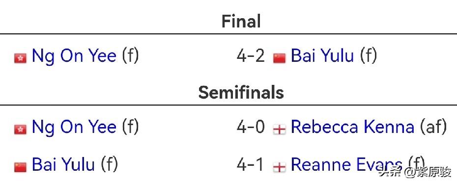 吴安仪4-2战胜白雨露,获得英国女子公开赛冠军,积分反超白雨露,排名世界第一。 今天凌晨进行的英国女子公开赛决赛,白雨露2-4不敌卫冕冠军吴安仪,获得亚军。 这场决赛,白雨露先下一局,但第二局被逆转,第三局吴安仪2-1反超,第四局白雨露2-2扳平比分。接下来吴安仪连赢两局,4-2锁定胜局。 吴安仪获得冠军后,按照去年的积分数,总积分增加7500分后为75000分,而白雨露增加亚军积分4875分,总积分为74725分,白雨露丢掉第一。赛前排名第二的旺哈鲁泰由于1/4决赛被淘汰,因此目前排名第三。目前世界前三的球员分别是:吴安仪、白雨露和旺哈鲁泰。 不过,斯诺克女子世界排名需要得世界台联(WPBSA)的确认,最终排名以世台联官方发布为准。 恭喜吴安仪!