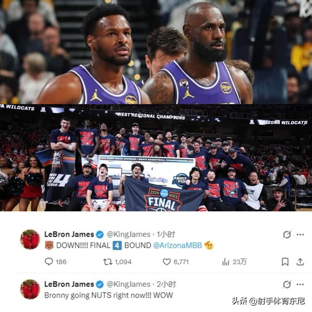 詹姆斯社媒发帖疯狂夸奖俩儿子,上演一出詹爹卖瓜,自卖自夸的好戏! 詹姆斯先是夸奖大儿子布朗尼在G联赛打疯了;然后又夸奖二儿子布莱斯NCAA疯狂三月随球队打进了4强。 不看球的巴斯特如果只看詹姆斯的社媒发文,一定又会被詹姆斯忽悠瘸了。 事实上,布朗尼进湖人2个赛季了,如今还找不到位置,连替补的替补资格都没有,即使代表南湾湖人打G联赛也只敢打主场,不敢打客场,怕被漫天的嘘声吞没。布莱斯更搞笑,早前亚利桑那校队夺得地区冠军时,布莱斯躺冠,詹姆斯也社媒发推夸奖造势了一番。如今NCAA疯狂三月联赛亚利桑那打进4强,布莱斯愣是一秒钟没上,也是躺赢。就是不知道詹姆斯究竟在夸什么?夸俩儿子球技好?实力强?还是命好,懂得和自己一样抱大腿?[我想静静][我想静静]