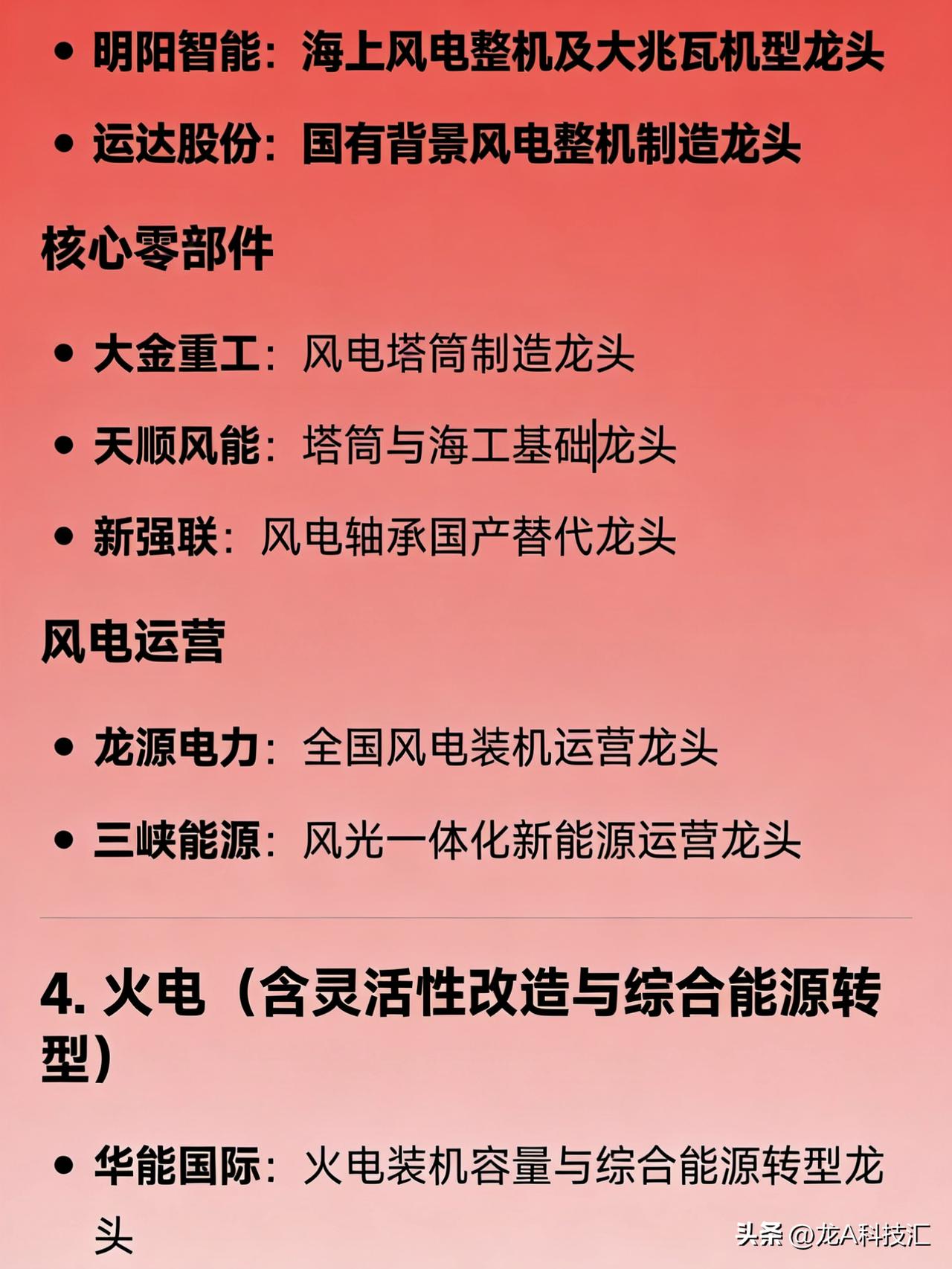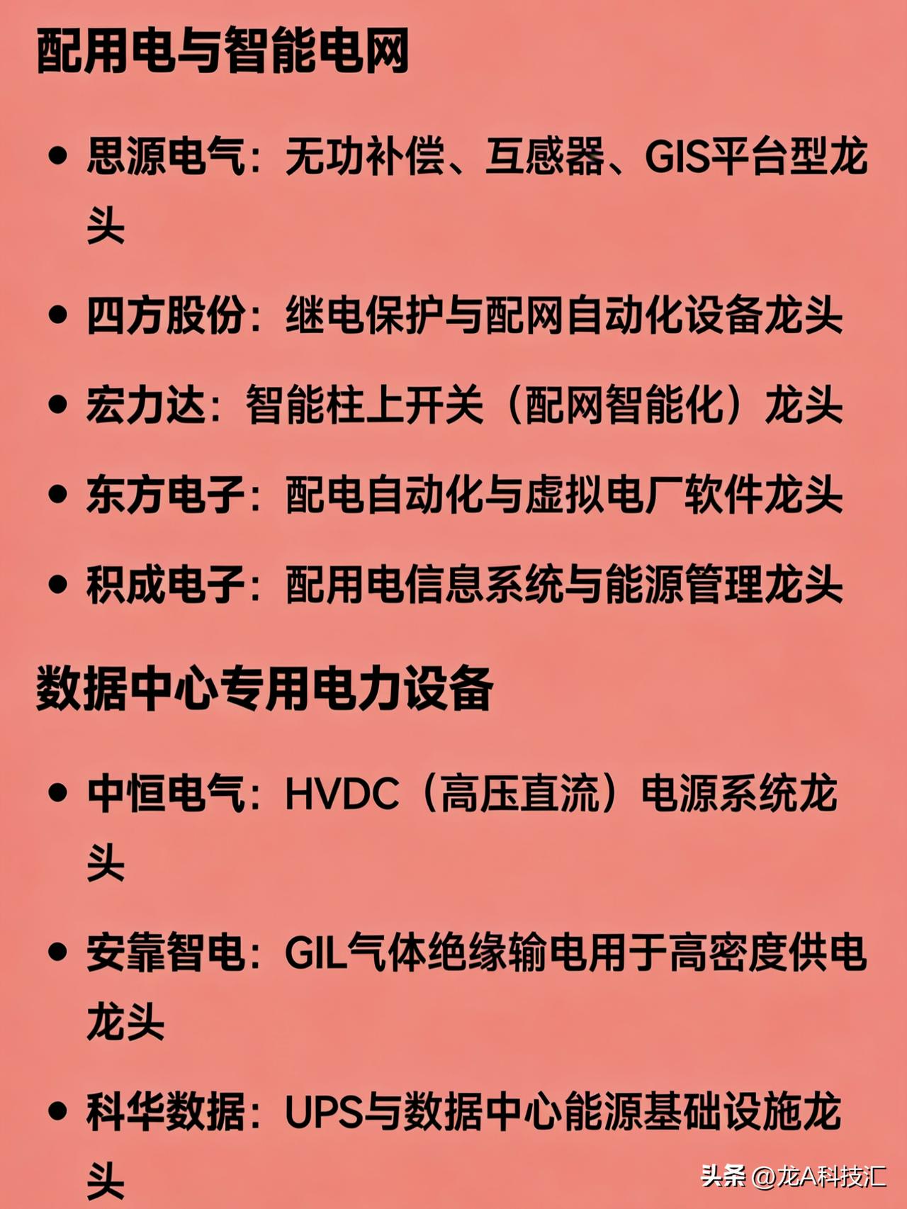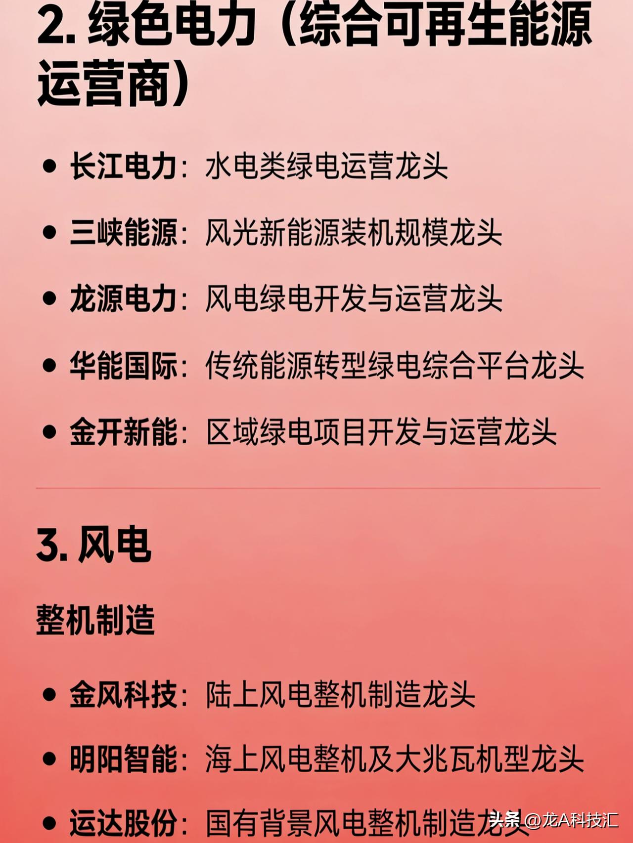 “算电协同、绿色电力、风电、火电、核电、水电、光储、电网设备”八大方向的完整版龙头企业汇总。 1. 算电协同(算力+电力融合) 协鑫能科:算电协同全链路布局龙头 中国能建:绿电+算力基础设施一体化龙头 美利云:东数西算节点零碳算力融合标杆 三峡能源:大型风光基地直供算力中心探索者 南网科技:数字电网与算力负荷协同调度代表企业 2. 绿色电力(综合可再生能源运营商) 长江电力:水电类绿电运营龙头 三峡能源:风光新能源装机规模龙头 龙源电力:风电绿电开发与运营龙头 华能国际:传统能源转型绿电综合平台龙头 金开新能:区域绿电项目开发与运营龙头 3. 风电 整机制造 金风科技:陆上风电整机制造龙头 明阳智能:海上风电整机及大兆瓦机型龙头 运达股份:国有背景风电整机制造龙头 核心零部件 大金重工:风电塔筒制造龙头 天顺风能:塔筒与海工基础龙头 新强联:风电轴承国产替代龙头 风电运营 龙源电力:全国风电装机运营龙头 三峡能源:风光一体化新能源运营龙头 4. 火电(含灵活性改造与综合能源转型) 华能国际:火电装机容量与综合能源转型龙头 国电电力:优质火电资产与煤电灵活性改造龙头 大唐发电:五大发电集团火电平台龙头 华润电力:高效清洁煤电与综合能源服务龙头 浙能电力:区域火电调峰与多能互补龙头 申能股份:上海地区火电与能源保供龙头 皖能电力:安徽火电主力与绿电协同试点企业 5. 核电 中国核电:中核集团旗下核电运营龙头 中国广核:中广核集团旗下核电装机与运营龙头 6. 水电 长江电力:全球大型水电站运营管理龙头 华能水电:澜沧江流域梯级水电开发龙头 国投电力:雅砻江流域水电独家开发龙头 桂冠电力:广西及西南区域水电运营龙头 黔源电力:贵州流域水电与“水光互补”试点龙头 7. 光储(光伏 + 储能) 光伏制造 隆基绿能:单晶硅片与组件全球龙头 通威股份:高纯晶硅与电池片双环节龙头 晶科能源:全球组件出货量领先企业 晶澳科技:一体化光伏组件制造龙头 天合光能:大尺寸组件与分布式光伏龙头 储能系统与集成 宁德时代:全球储能电池出货龙头 比亚迪:储能电池+PCS+系统全栈能力龙头 阳光电源:储能变流器与光储系统集成龙头 数字能源:智能光储解决方案技术引领者 独立储能/项目运营 南网储能:电网侧大型储能项目运营龙头 林洋能源:分布式光伏+储能项目开发龙头 三峡能源:新能源配储与共享储能布局领先 8. 电网设备(输配电、智能电网、数据中心供电) 电网自动化与调度 国电南瑞:电网自动化、继电保护、调度系统龙头 特高压与一次设备 特变电工:变压器与特高压设备综合龙头 许继电气:直流输电与换流阀设备龙头 平高电气:高压开关与GIS设备龙头 中国西电:特高压交直流成套设备龙头 配用电与智能电网 思源电气:无功补偿、互感器、GIS平台型龙头 四方股份:继电保护与配网自动化设备龙头 宏力达:智能柱上开关(配网智能化)龙头 东方电子:配电自动化与虚拟电厂软件龙头 积成电子:配用电信息系统与能源管理龙头 数据中心专用电力设备 中恒电气:HVDC(高压直流)电源系统龙头 安靠智电:GIL气体绝缘输电用于高密度供电龙头 科华数据:UPS与数据中心能源基础设施龙头 免责声明:发文涉及资讯图等内容来自网络公共信息。仅供参考,不构成投资建议。