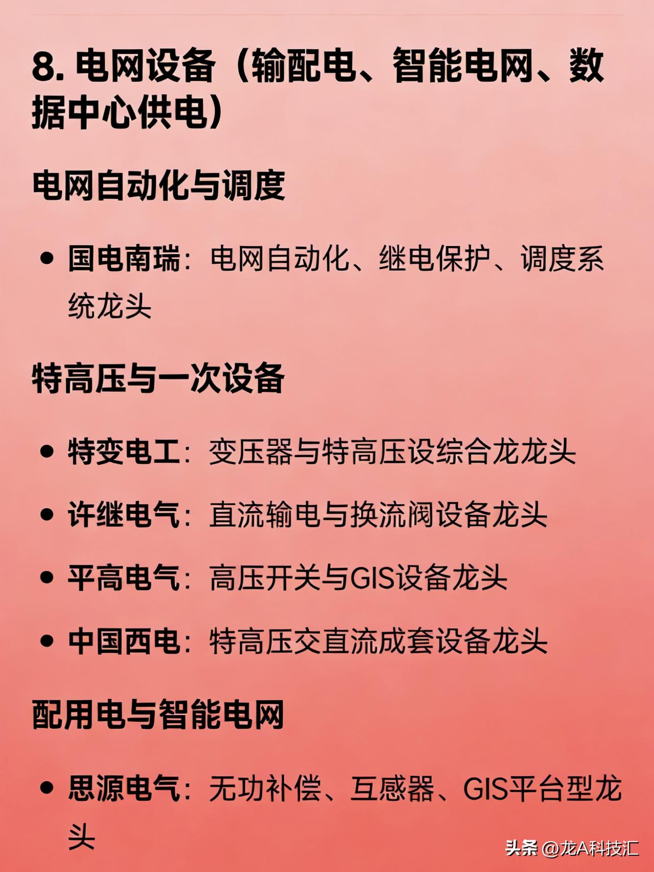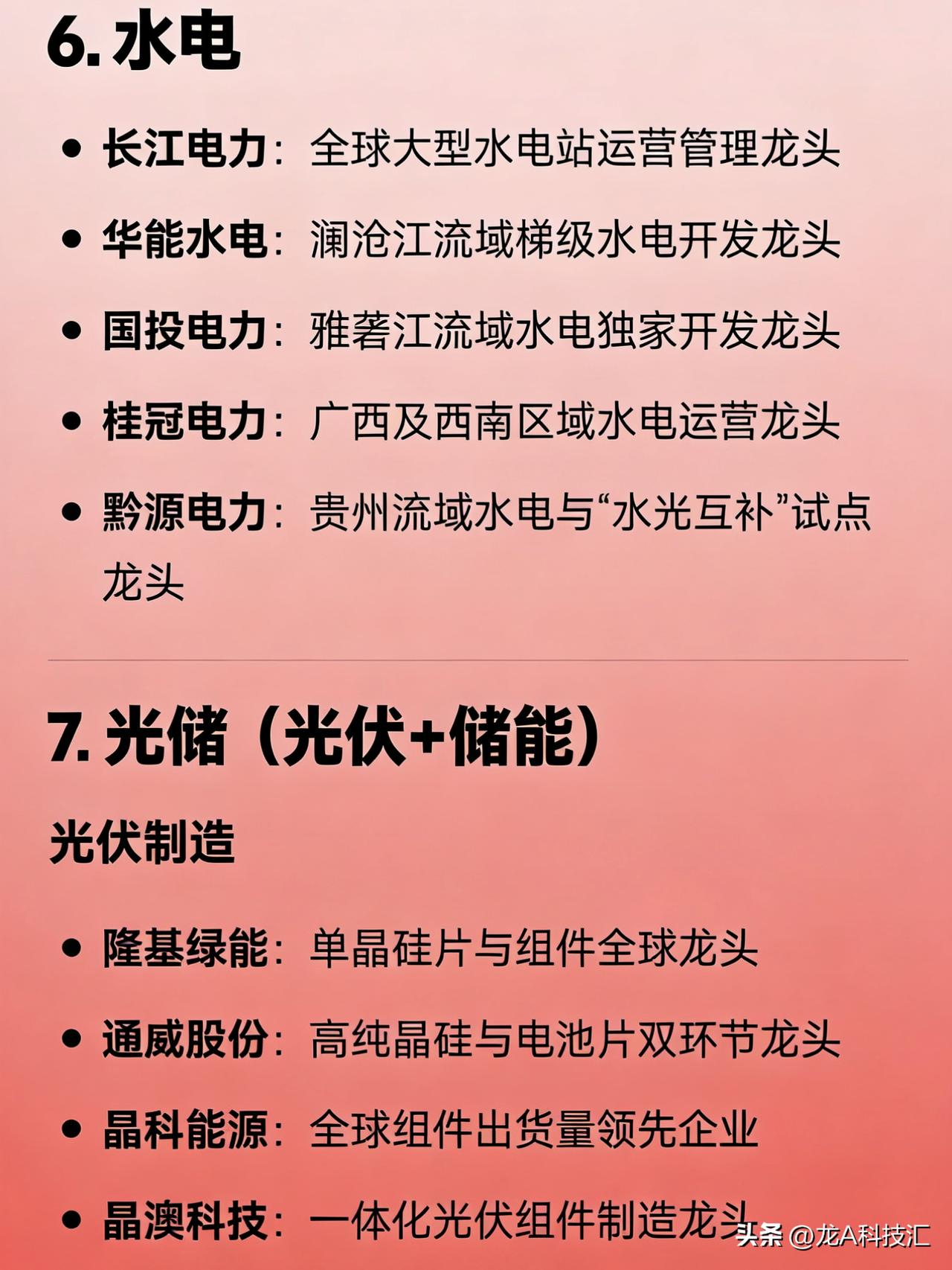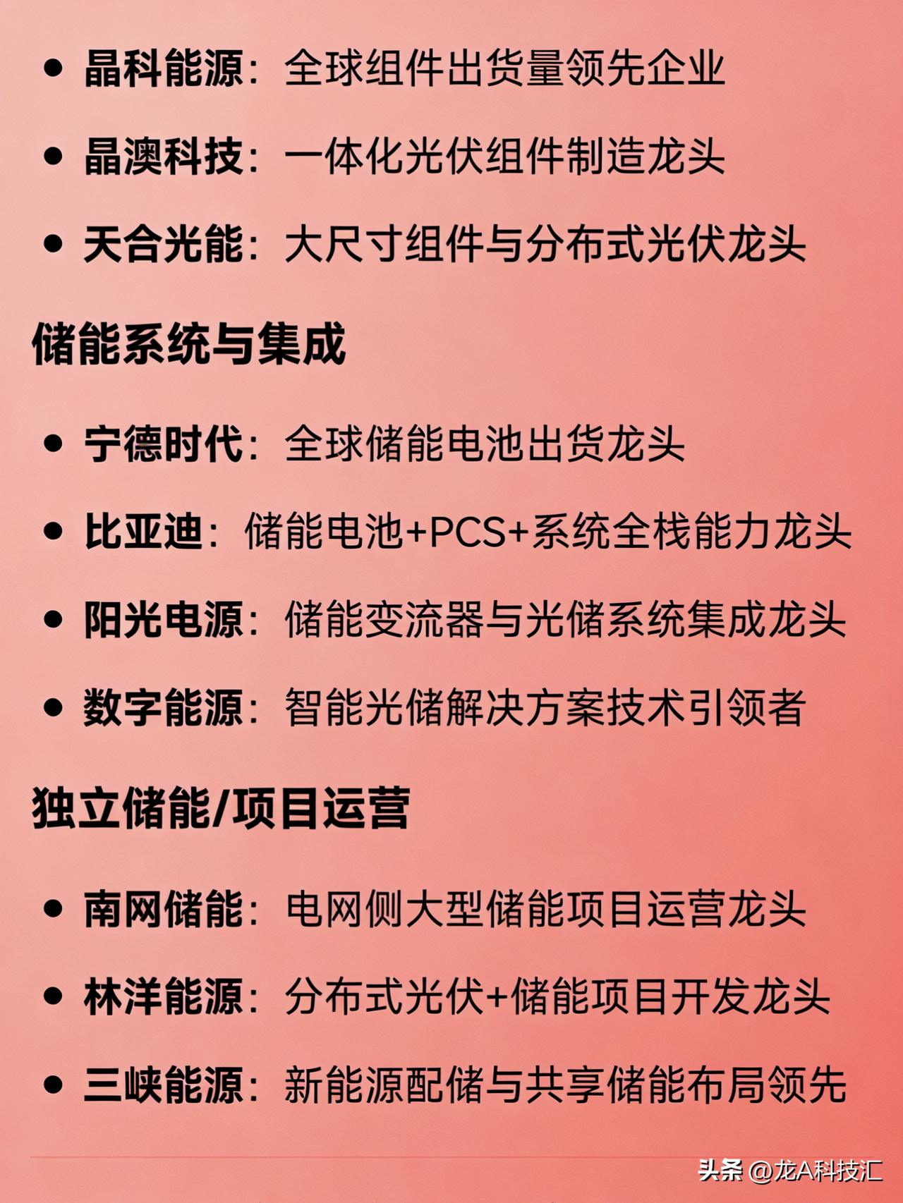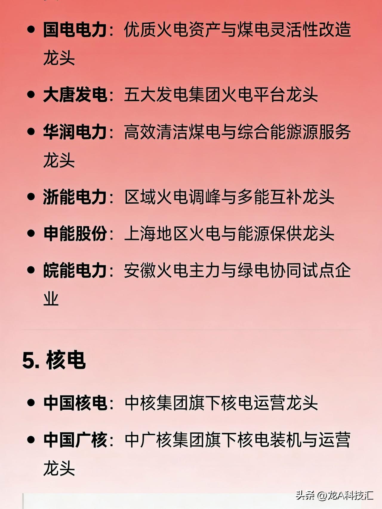 “算电协同、绿色电力、风电、火电、核电、水电、光储、电网设备”八大方向的完整版龙头企业汇总。 1. 算电协同(算力+电力融合) 协鑫能科:算电协同全链路布局龙头 中国能建:绿电+算力基础设施一体化龙头 美利云:东数西算节点零碳算力融合标杆 三峡能源:大型风光基地直供算力中心探索者 南网科技:数字电网与算力负荷协同调度代表企业 2. 绿色电力(综合可再生能源运营商) 长江电力:水电类绿电运营龙头 三峡能源:风光新能源装机规模龙头 龙源电力:风电绿电开发与运营龙头 华能国际:传统能源转型绿电综合平台龙头 金开新能:区域绿电项目开发与运营龙头 3. 风电 整机制造 金风科技:陆上风电整机制造龙头 明阳智能:海上风电整机及大兆瓦机型龙头 运达股份:国有背景风电整机制造龙头 核心零部件 大金重工:风电塔筒制造龙头 天顺风能:塔筒与海工基础龙头 新强联:风电轴承国产替代龙头 风电运营 龙源电力:全国风电装机运营龙头 三峡能源:风光一体化新能源运营龙头 4. 火电(含灵活性改造与综合能源转型) 华能国际:火电装机容量与综合能源转型龙头 国电电力:优质火电资产与煤电灵活性改造龙头 大唐发电:五大发电集团火电平台龙头 华润电力:高效清洁煤电与综合能源服务龙头 浙能电力:区域火电调峰与多能互补龙头 申能股份:上海地区火电与能源保供龙头 皖能电力:安徽火电主力与绿电协同试点企业 5. 核电 中国核电:中核集团旗下核电运营龙头 中国广核:中广核集团旗下核电装机与运营龙头 6. 水电 长江电力:全球大型水电站运营管理龙头 华能水电:澜沧江流域梯级水电开发龙头 国投电力:雅砻江流域水电独家开发龙头 桂冠电力:广西及西南区域水电运营龙头 黔源电力:贵州流域水电与“水光互补”试点龙头 7. 光储(光伏 + 储能) 光伏制造 隆基绿能:单晶硅片与组件全球龙头 通威股份:高纯晶硅与电池片双环节龙头 晶科能源:全球组件出货量领先企业 晶澳科技:一体化光伏组件制造龙头 天合光能:大尺寸组件与分布式光伏龙头 储能系统与集成 宁德时代:全球储能电池出货龙头 比亚迪:储能电池+PCS+系统全栈能力龙头 阳光电源:储能变流器与光储系统集成龙头 数字能源:智能光储解决方案技术引领者 独立储能/项目运营 南网储能:电网侧大型储能项目运营龙头 林洋能源:分布式光伏+储能项目开发龙头 三峡能源:新能源配储与共享储能布局领先 8. 电网设备(输配电、智能电网、数据中心供电) 电网自动化与调度 国电南瑞:电网自动化、继电保护、调度系统龙头 特高压与一次设备 特变电工:变压器与特高压设备综合龙头 许继电气:直流输电与换流阀设备龙头 平高电气:高压开关与GIS设备龙头 中国西电:特高压交直流成套设备龙头 配用电与智能电网 思源电气:无功补偿、互感器、GIS平台型龙头 四方股份:继电保护与配网自动化设备龙头 宏力达:智能柱上开关(配网智能化)龙头 东方电子:配电自动化与虚拟电厂软件龙头 积成电子:配用电信息系统与能源管理龙头 数据中心专用电力设备 中恒电气:HVDC(高压直流)电源系统龙头 安靠智电:GIL气体绝缘输电用于高密度供电龙头 科华数据:UPS与数据中心能源基础设施龙头 免责声明:发文涉及资讯图等内容来自网络公共信息。仅供参考,不构成投资建议。