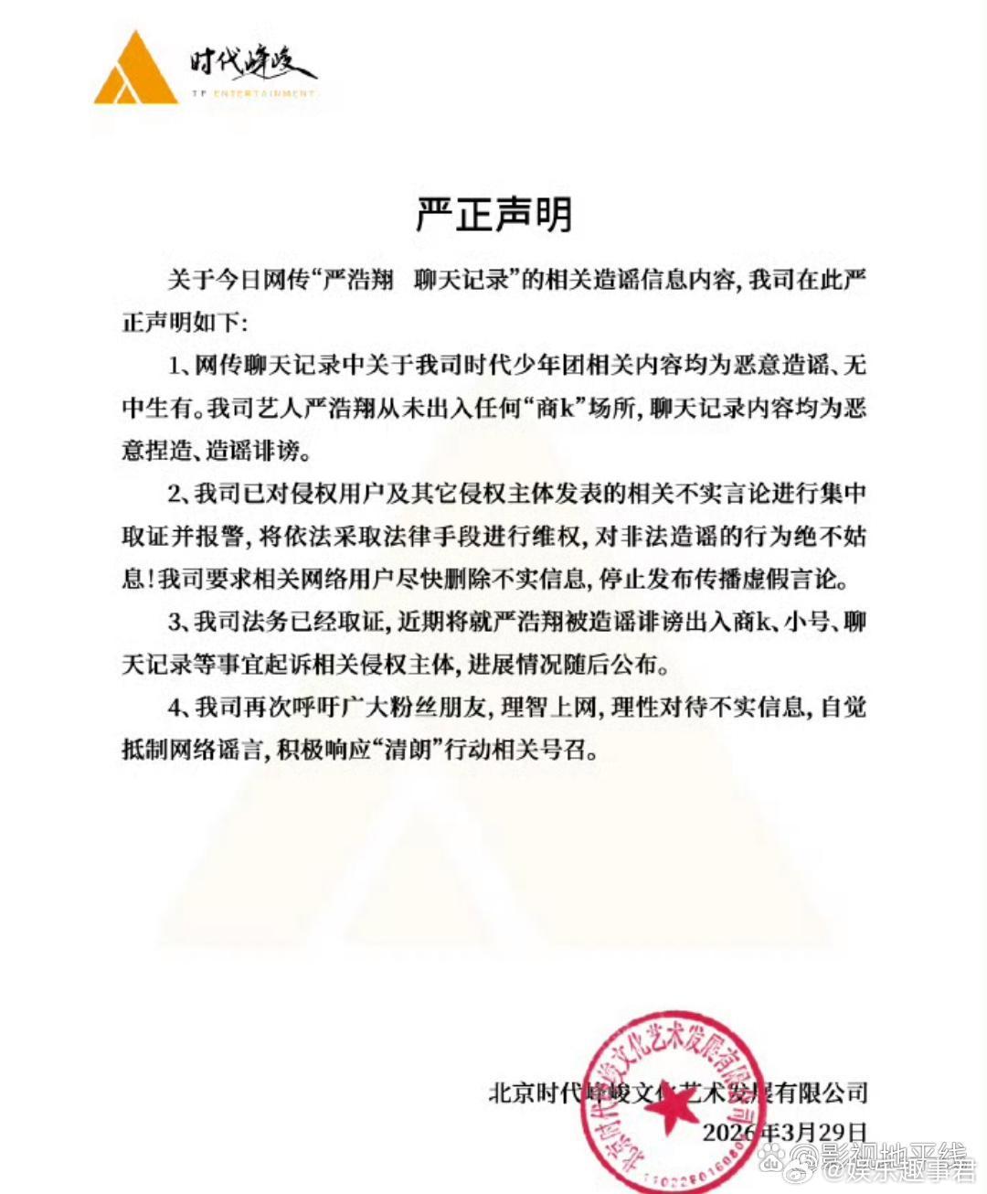 时代峰峻发声明回应称聊天记录中关于时代少年团的记录均为造谣,严浩翔从未出入任何商k场所,公司已取证。
