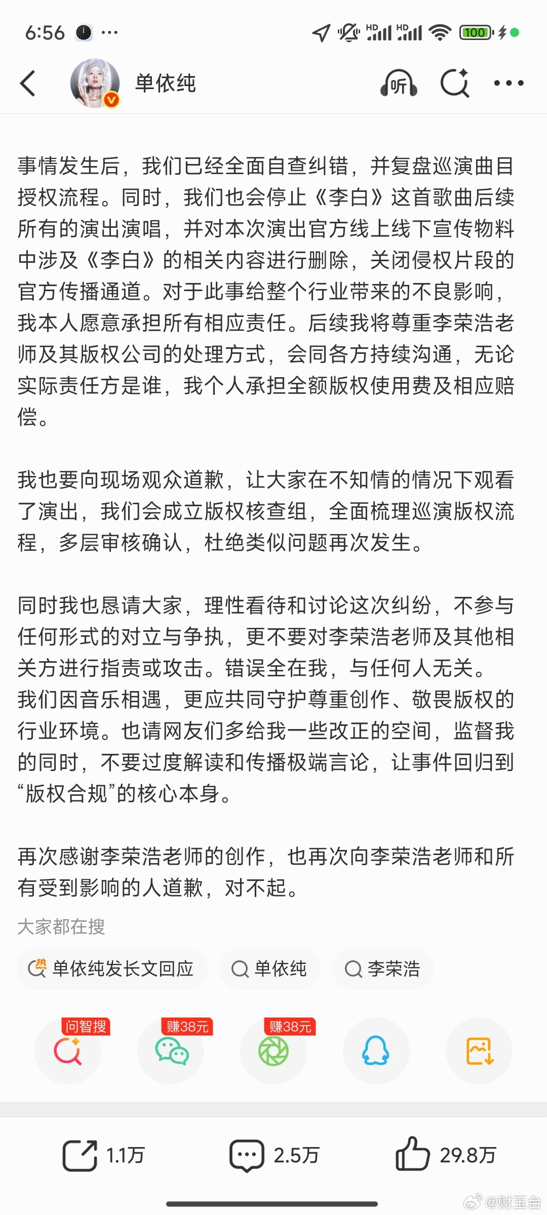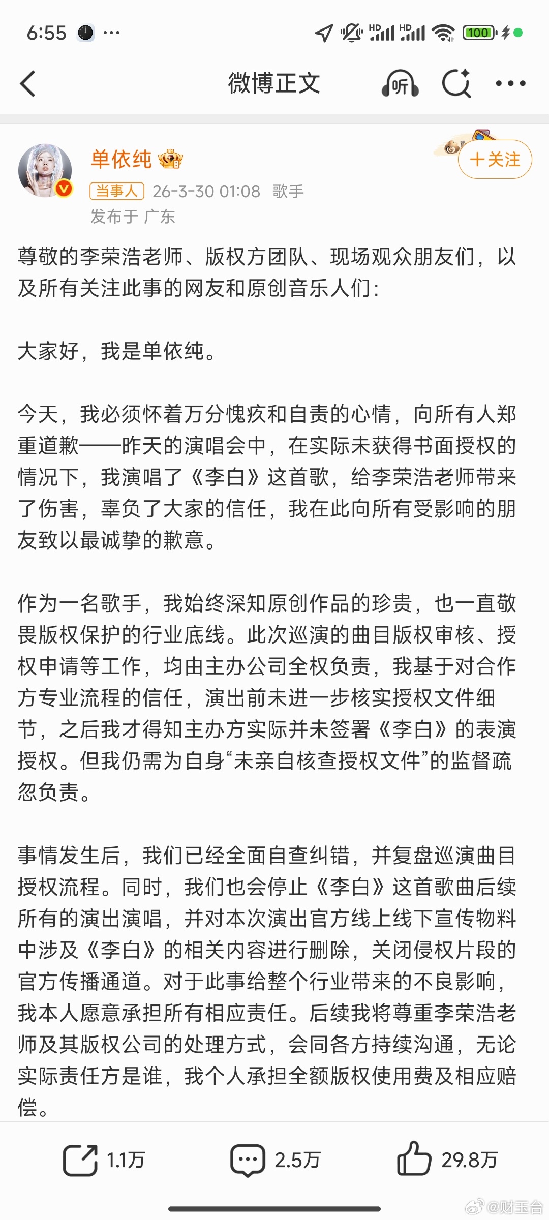 单依纯发长文回应 看完长文,态度诚恳、责任清晰,没有甩锅团队,直面未授权演唱《李白》的问题,承认自身监督疏忽,也承诺整改流程、承担责任,作为创作者守住版权底线很重要。李荣浩老师后续大度回应,格局拉满。希望行业都能重视版权,也期待单依纯吸取教训,专注作品,用实力继续走下去。