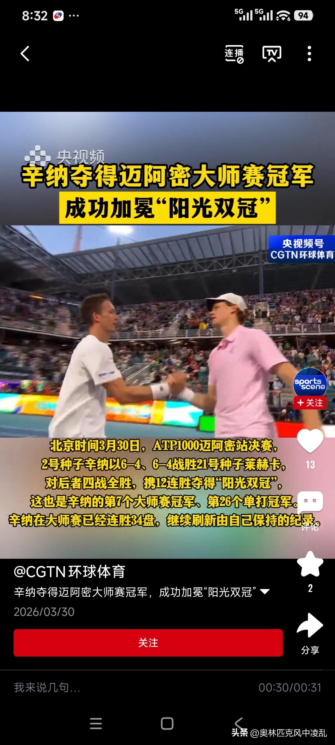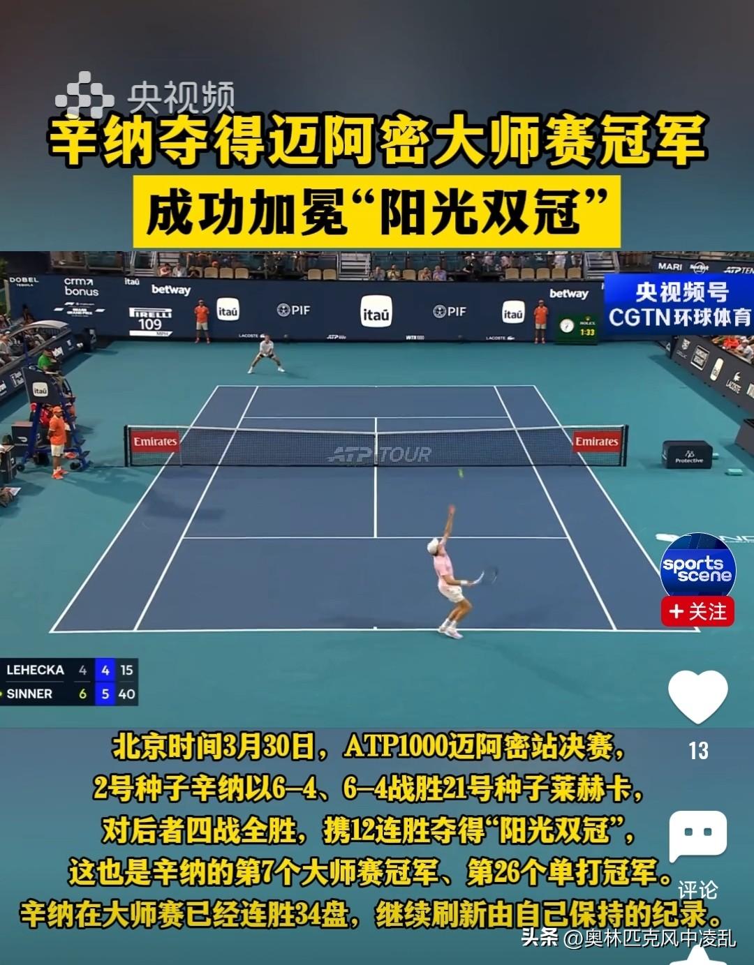 无与伦比的美丽,辛纳迈阿密夺冠!