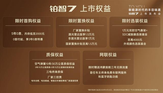 着急了,丰田铂智7,车长有惊人的5130mm。 丰田铂智7刚刚上市了,定位纯电中大型轿车,车身尺寸5130x1965x1506mm,轴距为3020mm。 低配71.35度电池包,续航600公里,高配88.13度电池包,续航710公里。售价16.98万~22.98万,限时权益价14.78万~19.98万。 车长超5130mm,是什么概念,来对比一下竞争对手。 小米SU7,车长4999mm 极氪001,车长4977mm 领克10,车长5050mm 小鹏P7,车长5017mm 比亚迪汉,车长4995mm 丰田铂智7的车长,远超同级竞争对手,甚至比奔驰E级还要长。 这么大一个车,起步价只要14.78万,看来丰田这次是真的着急了。 丰田品牌,在国内还是有很大号召力的,铂智7又大又便宜,凭借丰田金灿灿的车标,爆款应该是板上钉钉的事。 压力给到了国产新能源轿车,中大型轿车市场,要迎来一场血雨腥风了。 铂智7